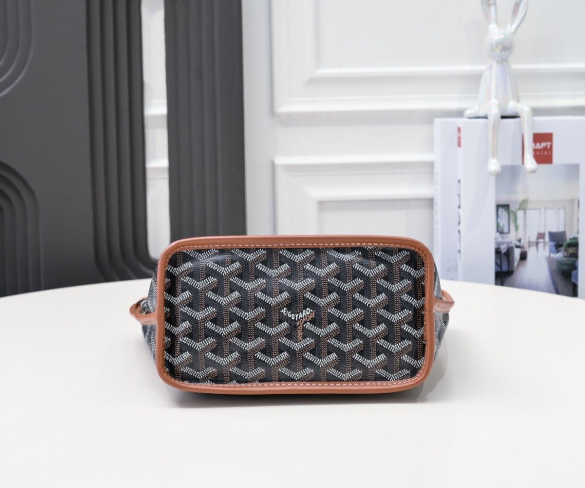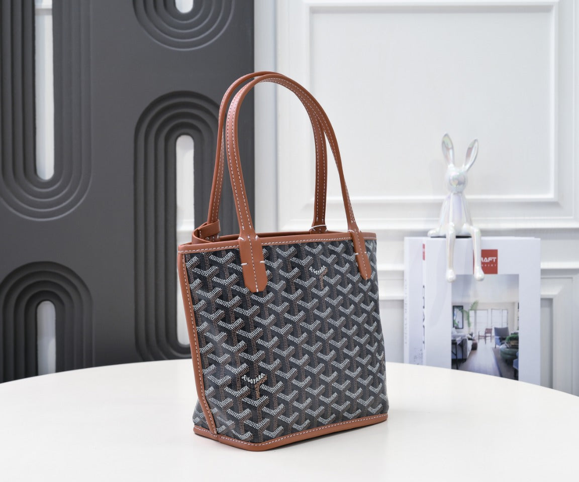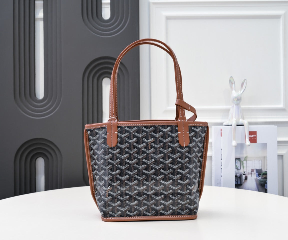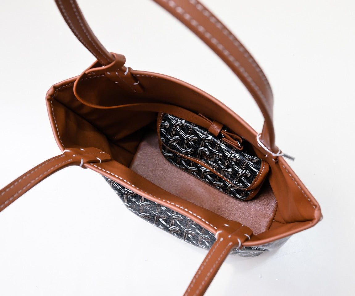 Introducing the Anjou Mini Handbag in a sophisticated brown hue. This versatile handbag is designed for those who appreciate both style and functionality. Unlike the classic Saint Louis handbag, the Anjou features a reversible design: one side showcases the iconic Goyardine waterproof coated canvas, while the other side is crafted from soft calfskin.