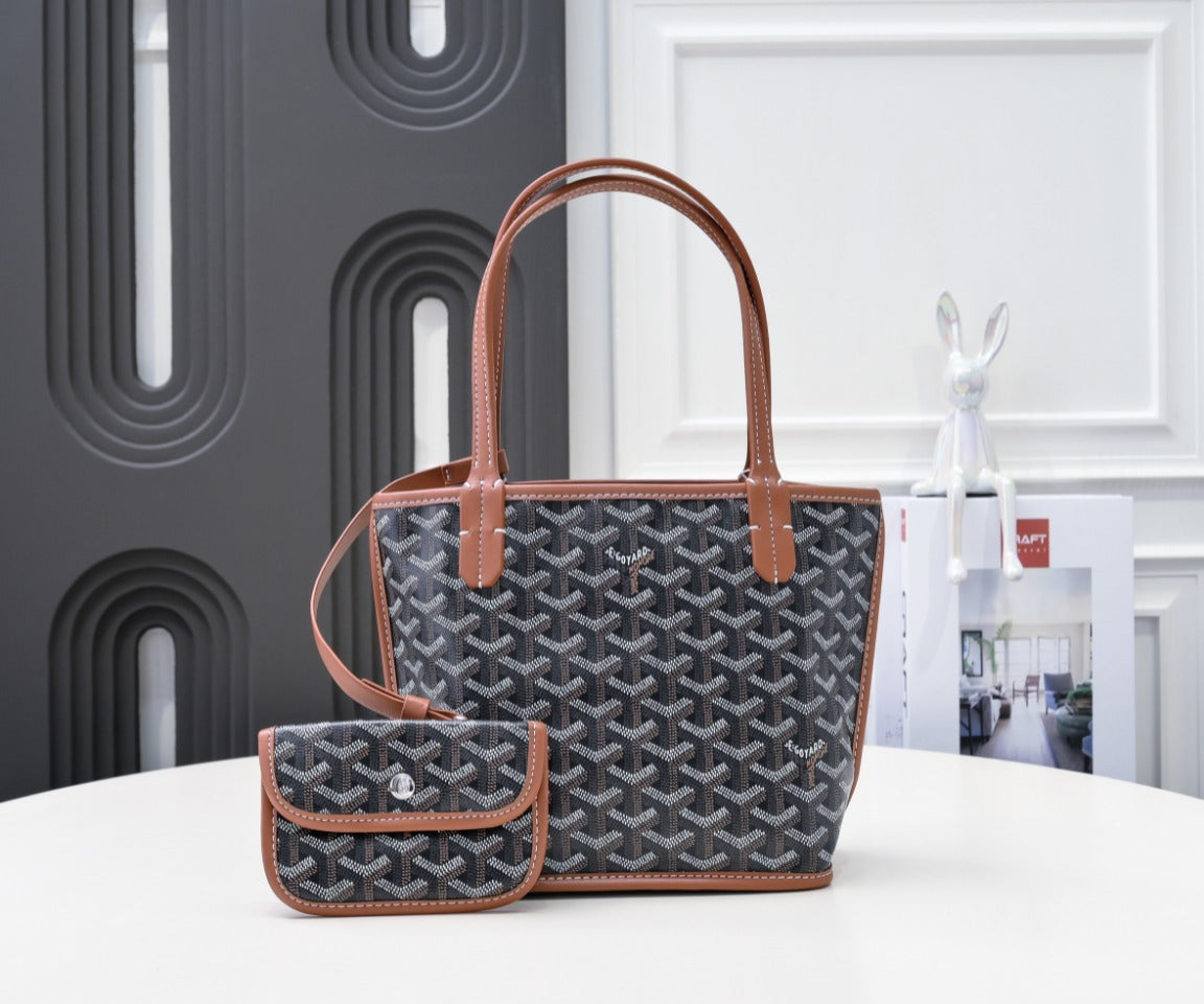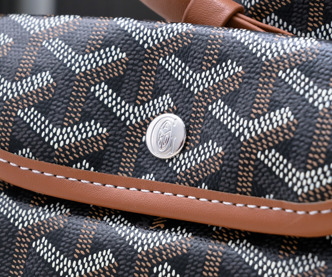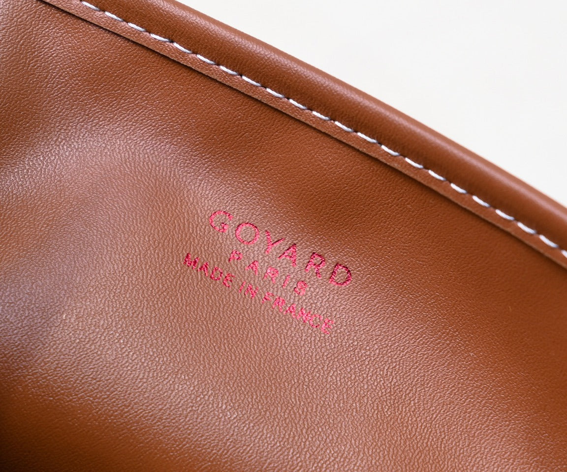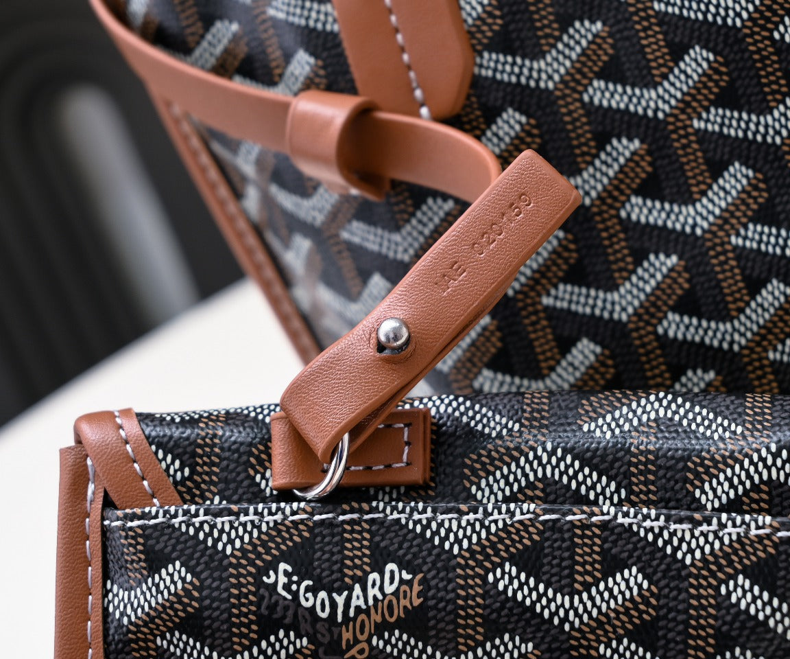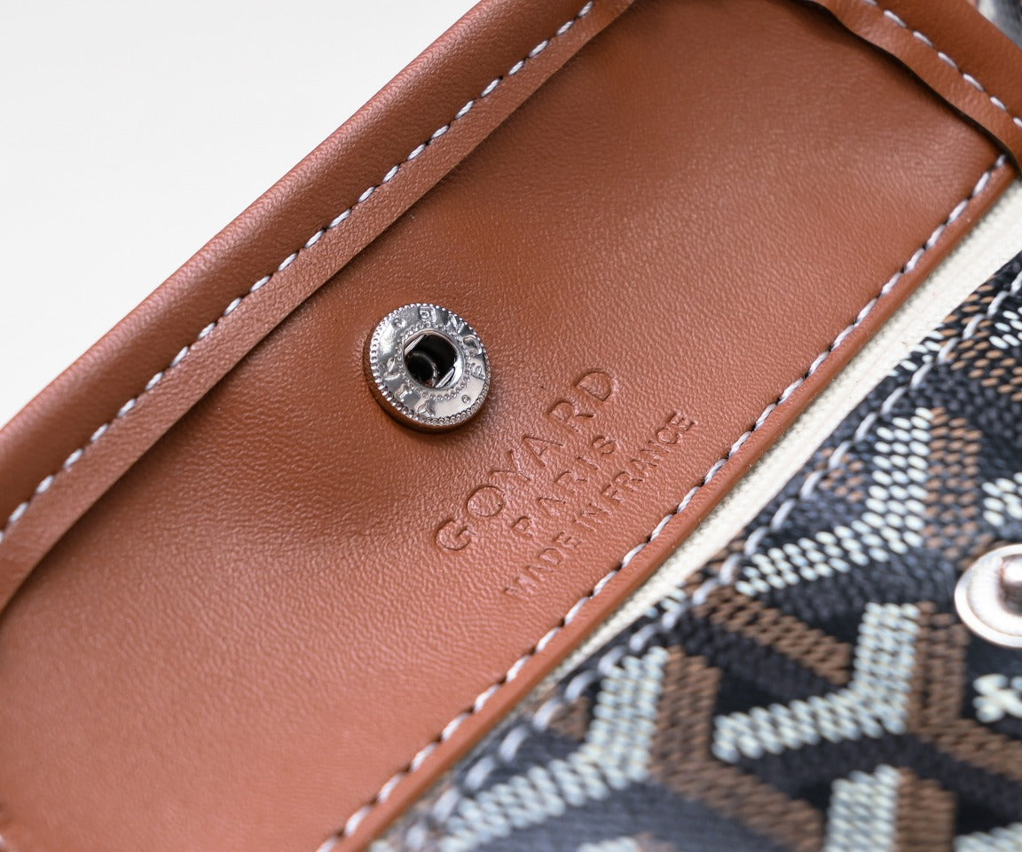 Introducing the Anjou Mini Handbag in a sophisticated brown hue. This versatile handbag is designed for those who appreciate both style and functionality. Unlike the classic Saint Louis handbag, the Anjou features a reversible design: one side showcases the iconic Goyardine waterproof coated canvas, while the other side is crafted from soft calfskin.