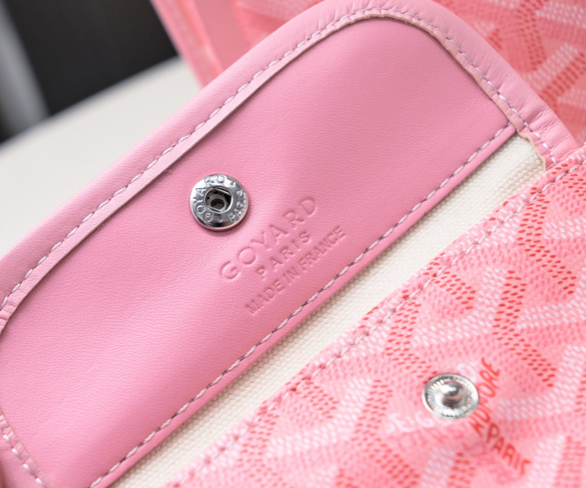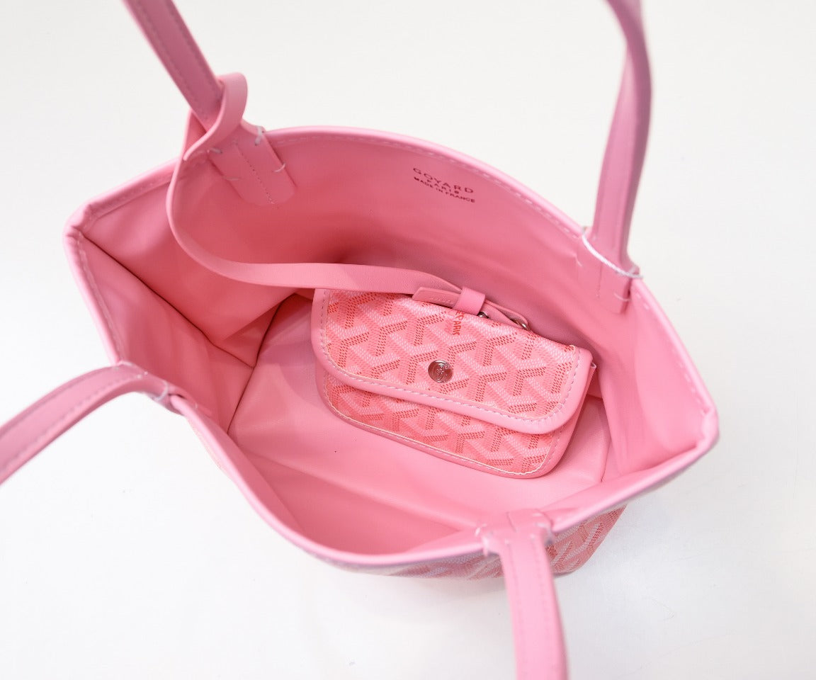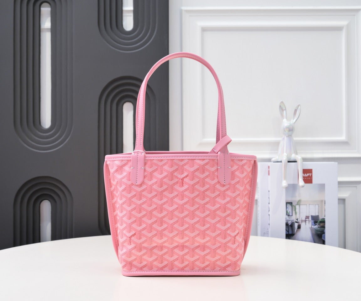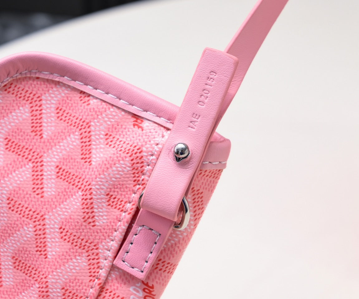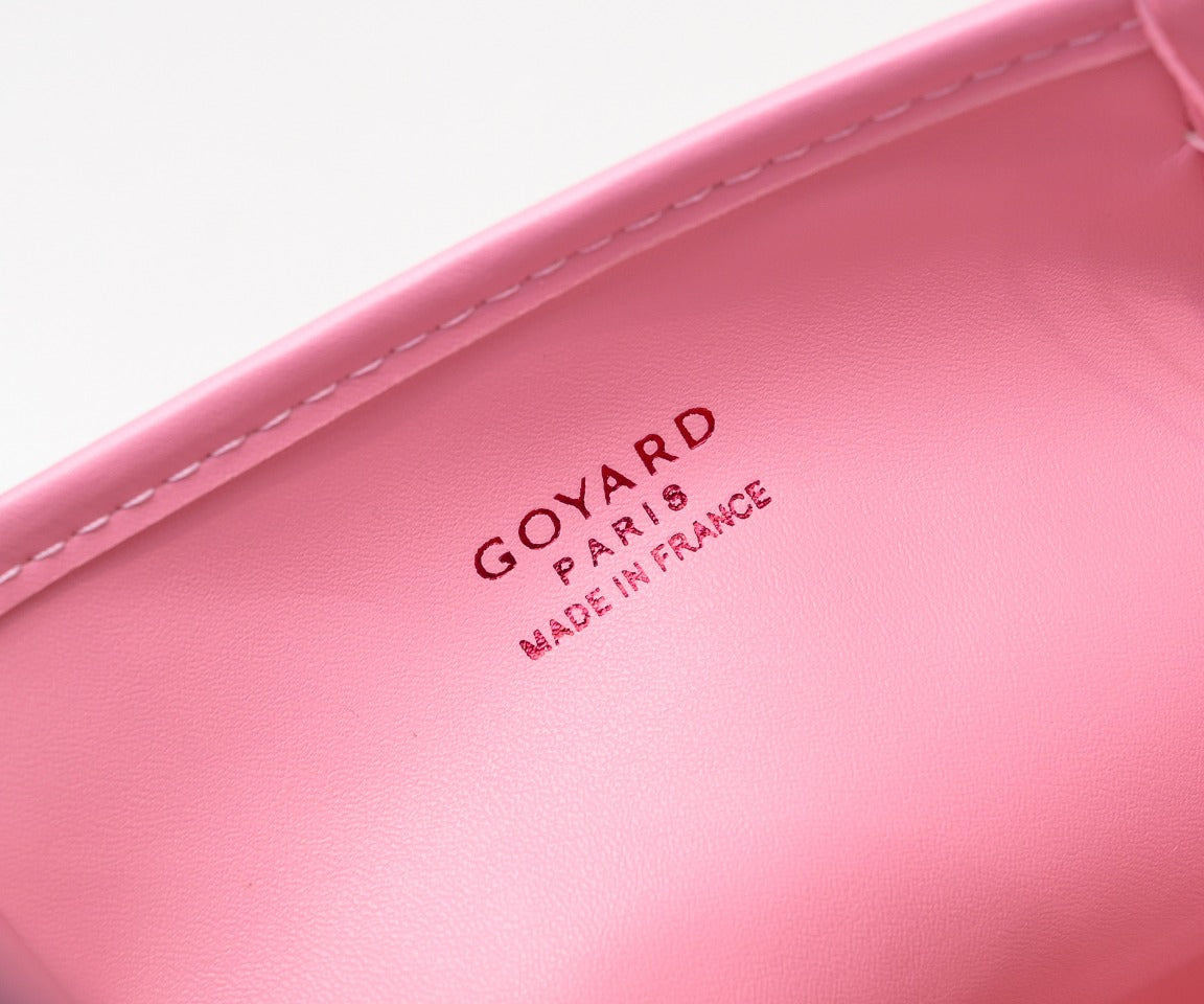 Introducing the Anjou Mini Handbag in stunning pink, a perfect blend of style and functionality. This versatile accessory features a reversible design, allowing you to choose between the iconic Goyardine waterproof coated canvas and luxurious soft calfskin. Despite its compact size, the Anjou Mini offers ample internal space and high utility, making it ideal for everyday use or travel. Equipped with inner pockets for organizing small essentials and valuables, this handbag is both chic and practical.