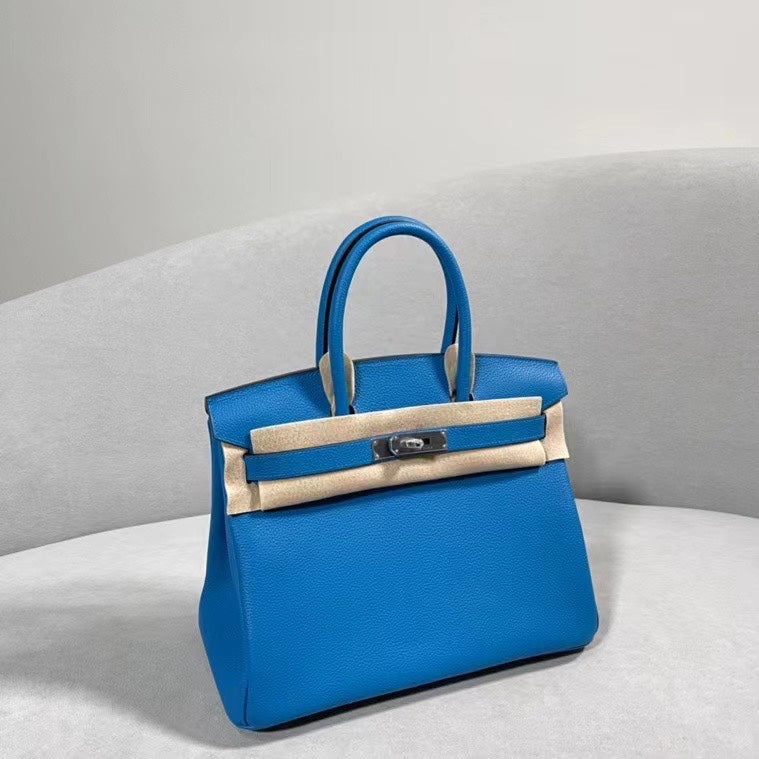 Elevate your style with our semi-hand-stitched original leather Birkin 30cm bag in the stunning Tanzania Blue, featuring an elegant silver buckle. This timeless piece embodies sophistication and versatility, seamlessly complementing any outfit—be it casual, elegant, or chic. Crafted from premium Togo leather, the Birkin bag is designed for both functionality and fashion, making it a must-have accessory for any wardrobe. Perfect for various occasions, this classic bag is your go-to choice for effortless elegance.