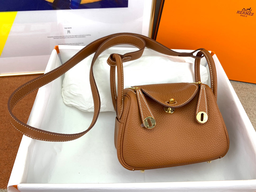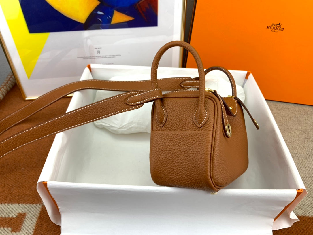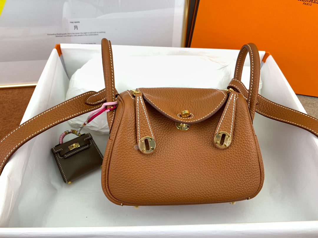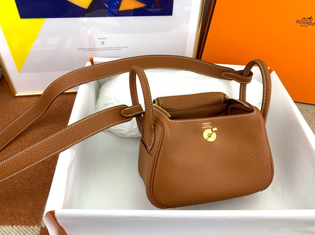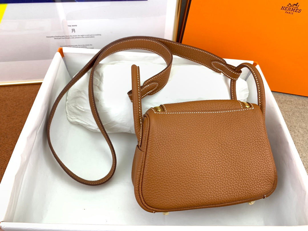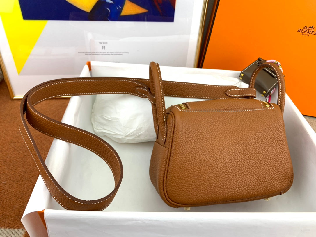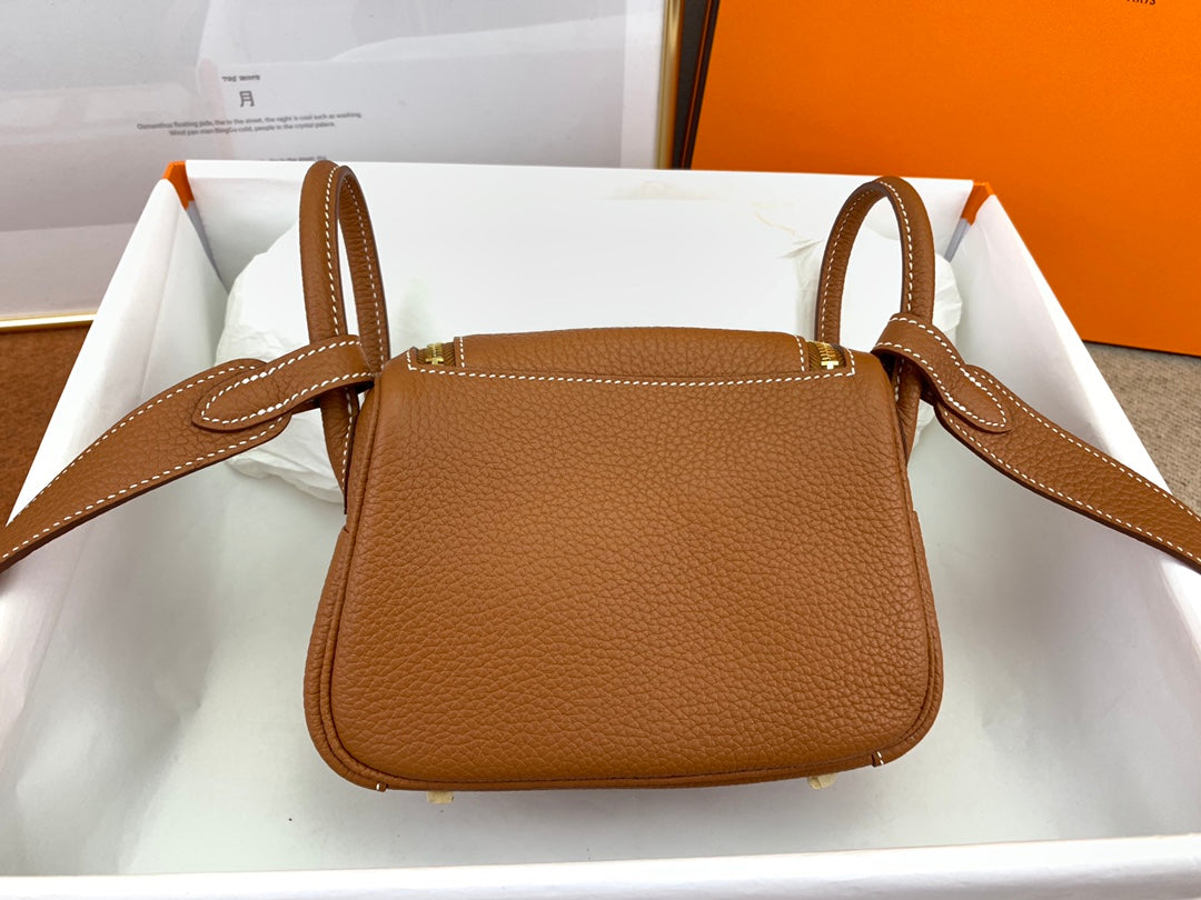 Discover the charm of our fully handmade Lindy Mini Bag, crafted from imported TC leather in an exquisite CK37 gold hue. This stylish 19cm bag features a unique open design with a luxurious hand-stitched finish using high-quality gold beeswax thread. It includes both shoulder straps and handles for versatile carrying options. With two inner pockets and two outer pockets, this bag offers ample space for your essentials while maintaining a chic and compact silhouette. Perfectly combining functionality and style, this adorable mini bag is a must-have for every fashion enthusiast.