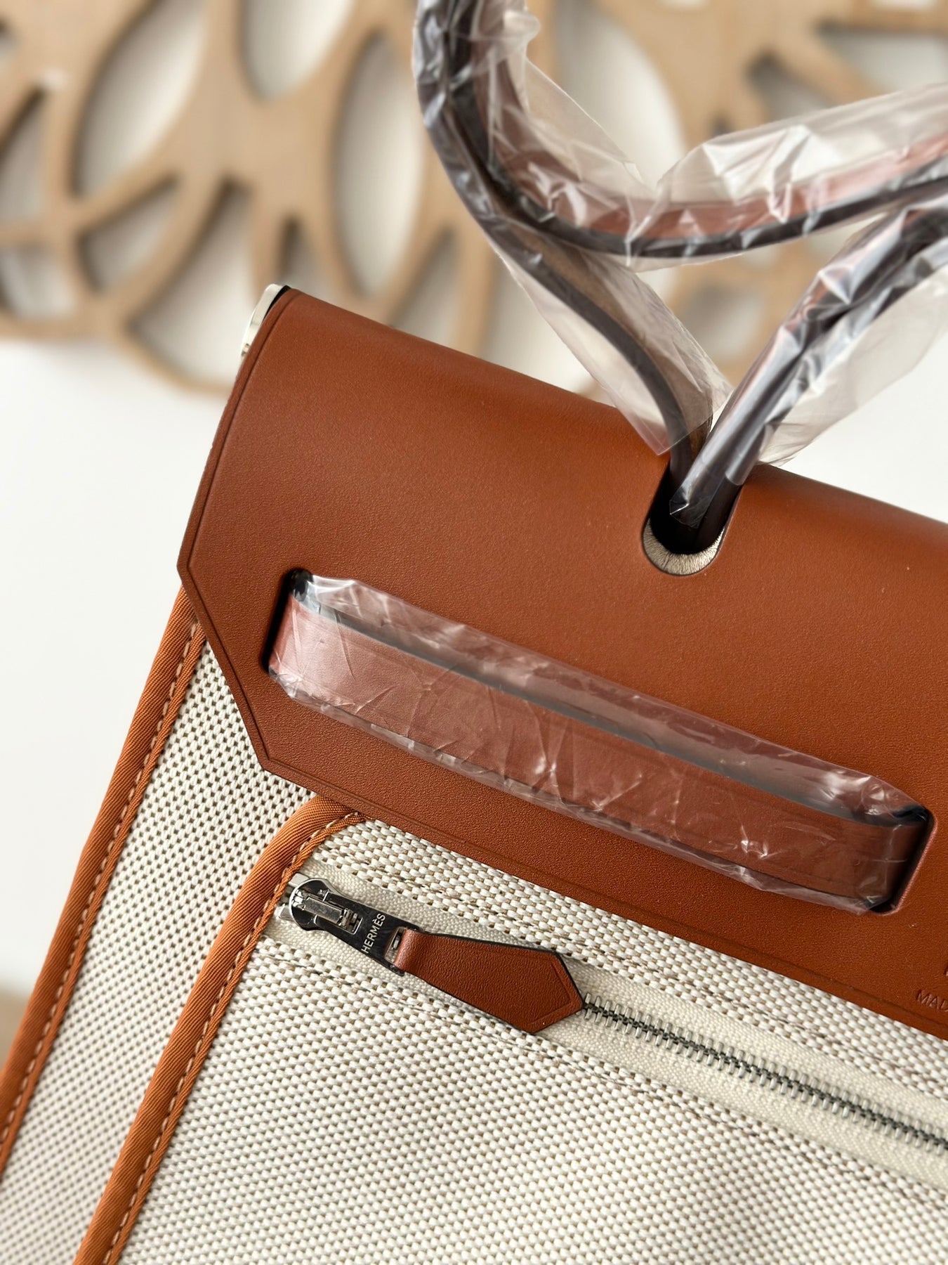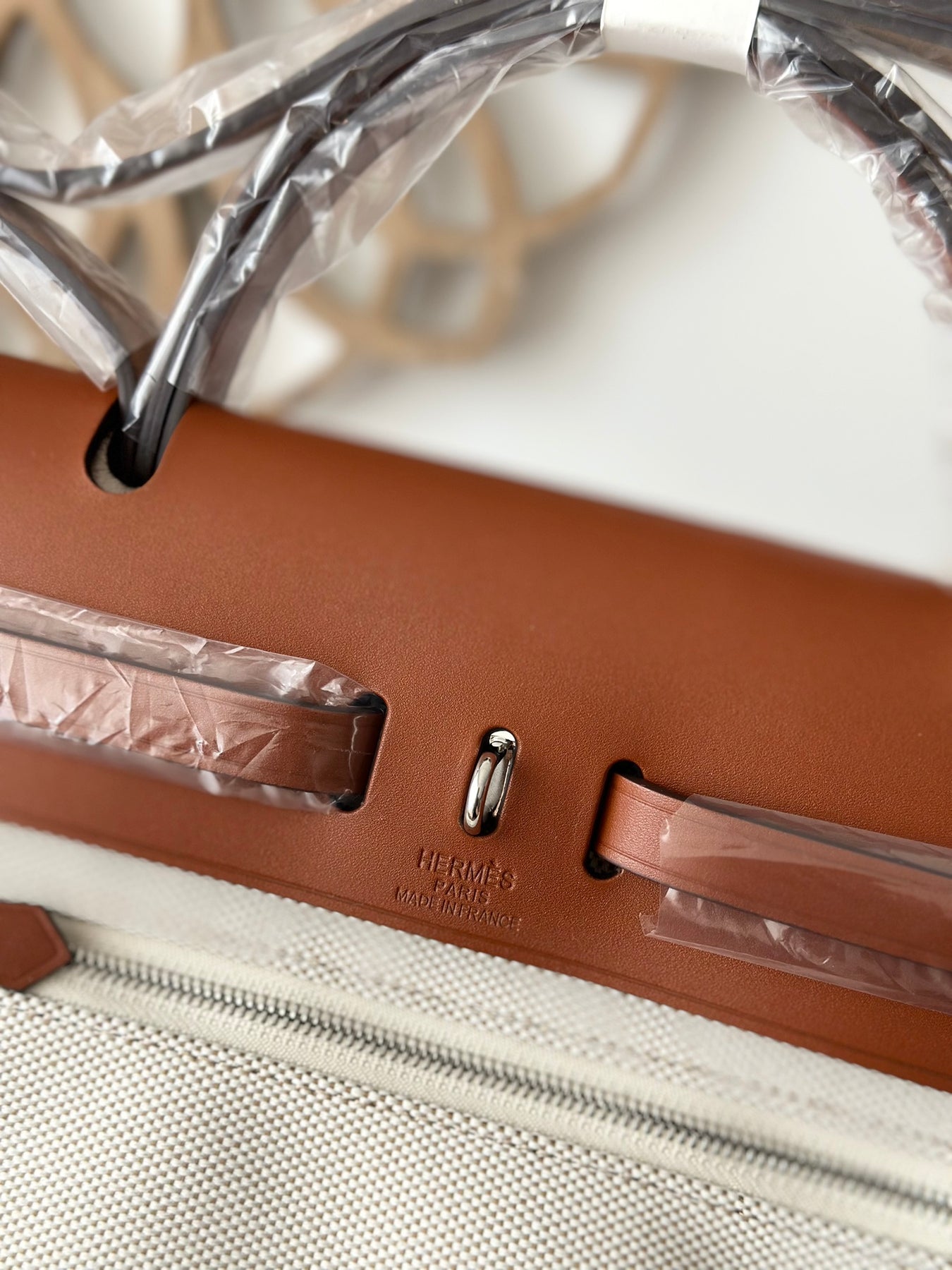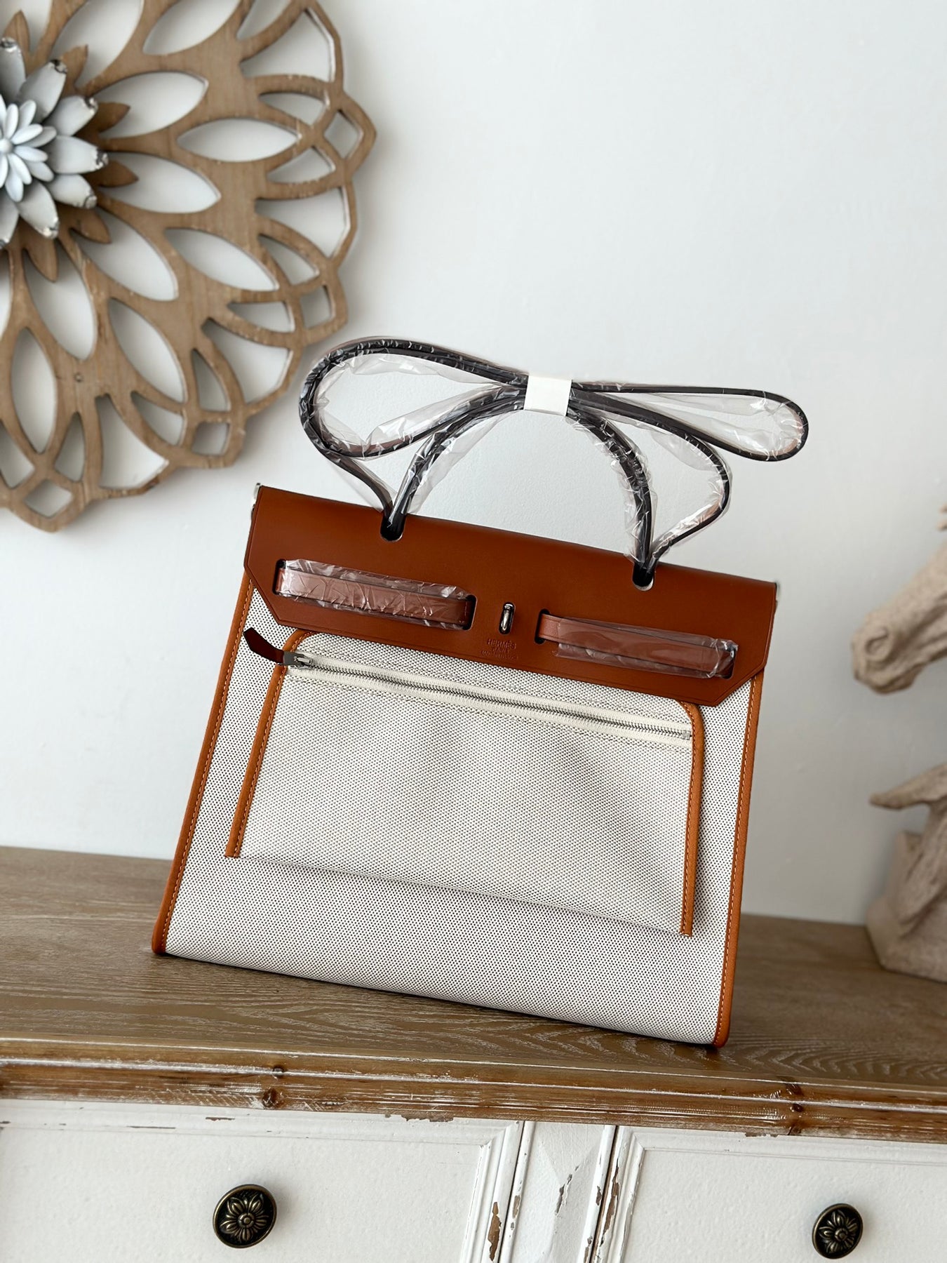 Introducing the exquisite Hermes Herbag 31cm, now available in an elegant golden brown and white combination. This premium handbag is handcrafted from the finest imported leather, featuring genuine raw steel accents and high-quality waterproof fabric—offering a stylish yet lightweight alternative to full leather bags.