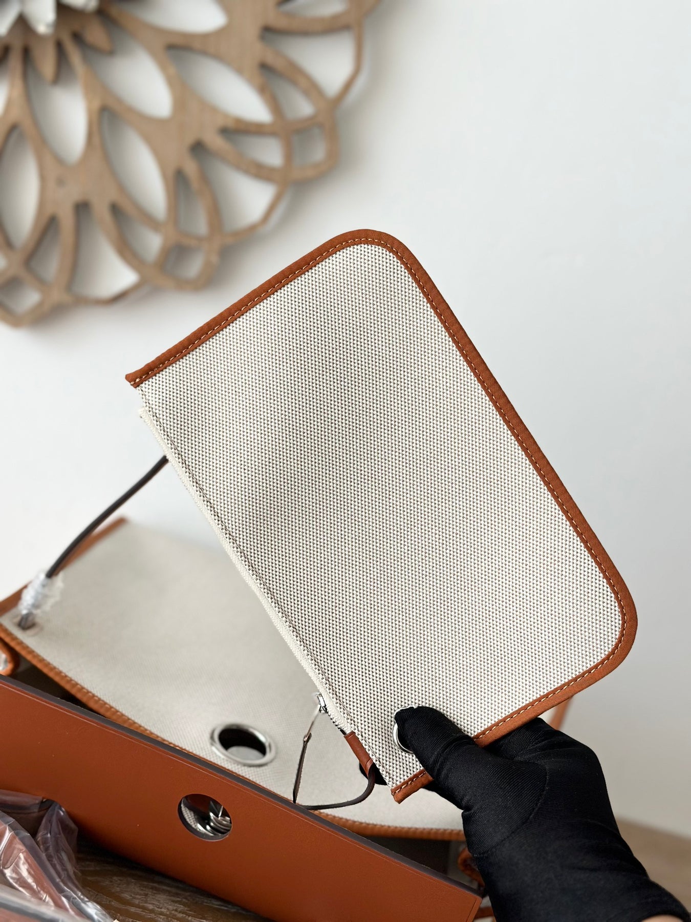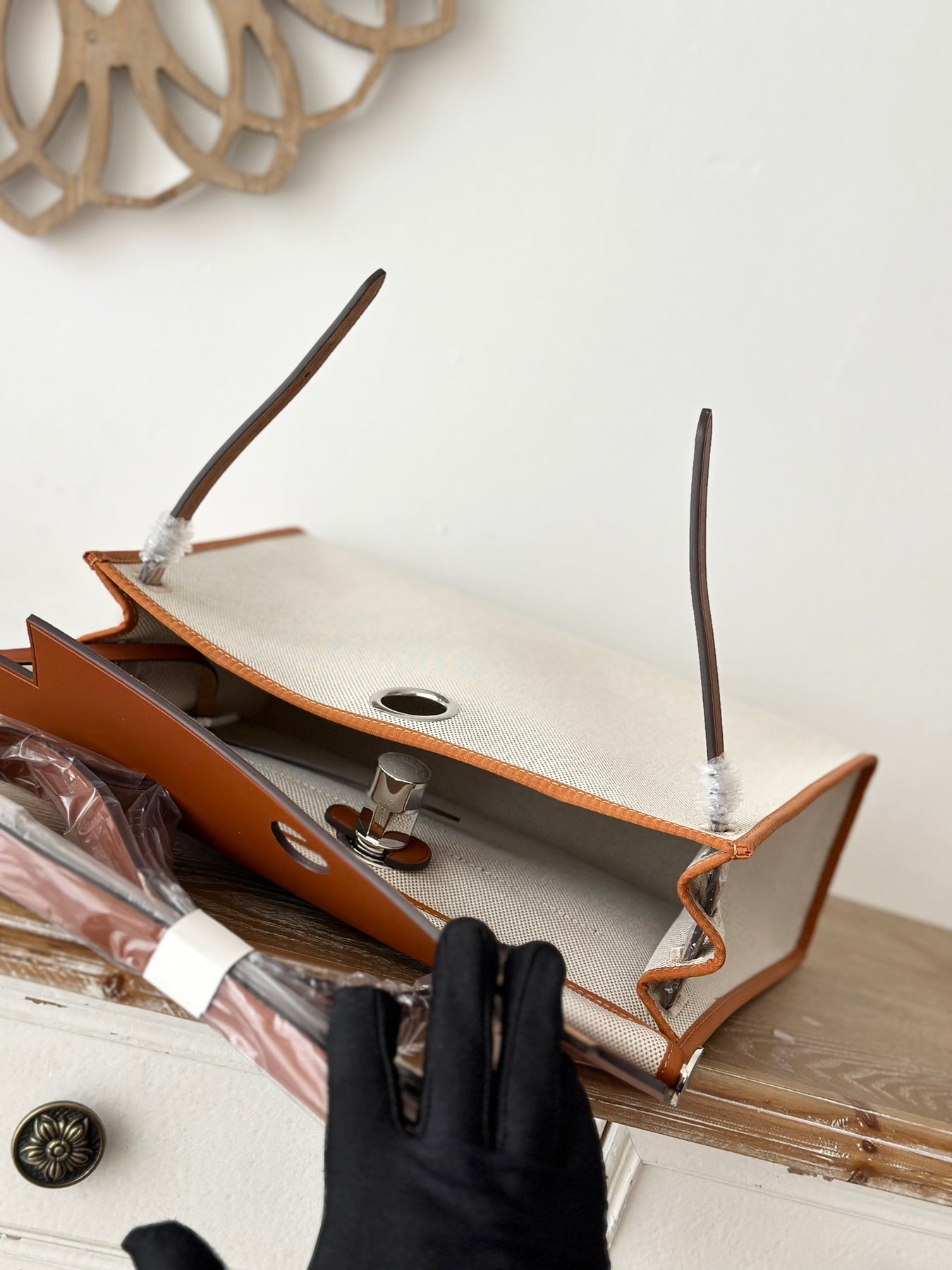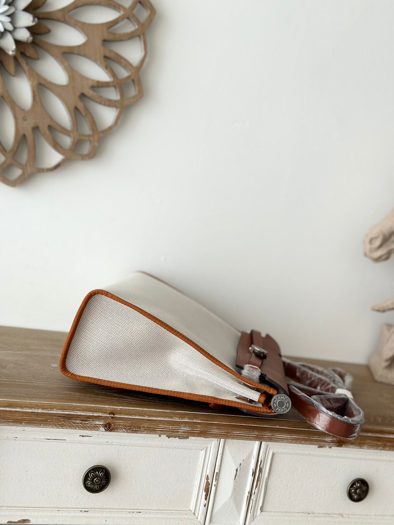 Introducing the exquisite Hermes Herbag 31cm, now available in an elegant golden brown and white combination. This premium handbag is handcrafted from the finest imported leather, featuring genuine raw steel accents and high-quality waterproof fabric—offering a stylish yet lightweight alternative to full leather bags.