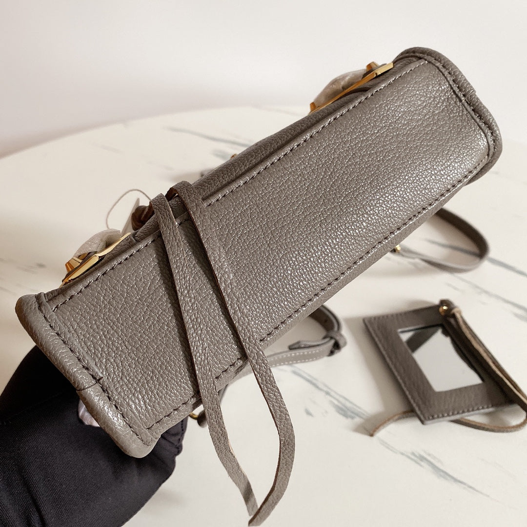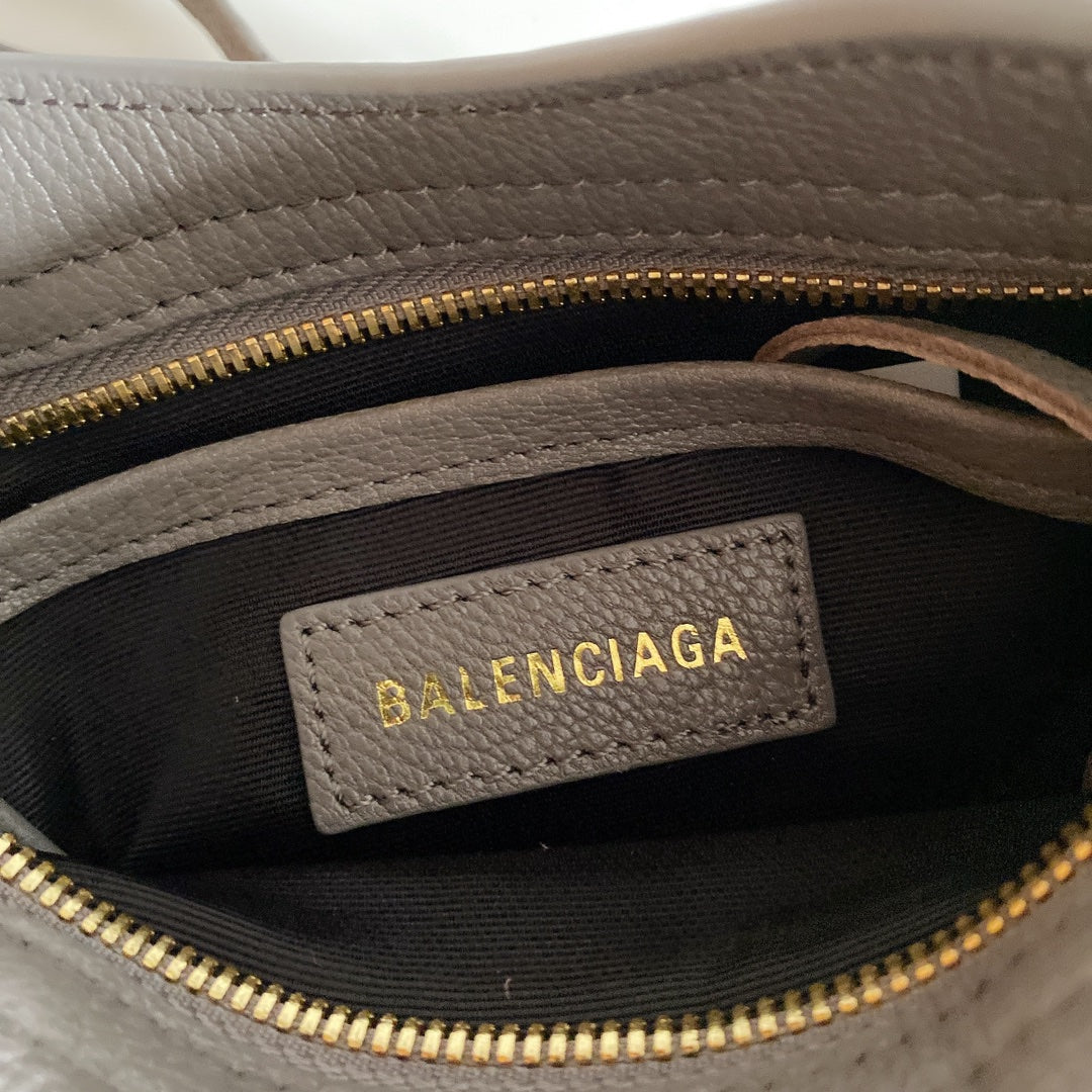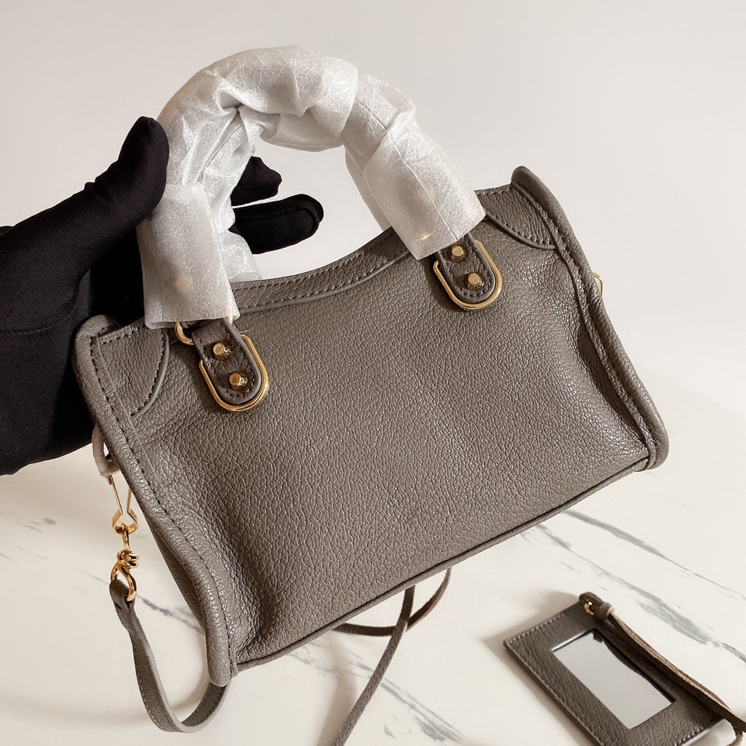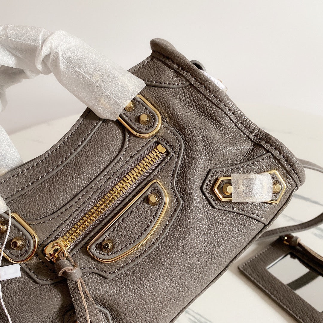 Designed for versatility, it comes with a hand-sewn handle and a detachable shoulder strap for effortless carrying. Inside, you'll find an organized layout, including an internal zipper pocket and a leather mirror for added convenience. The bag is beautifully adorned with an engraved Balenciaga gold logo, showcasing its luxury appeal.