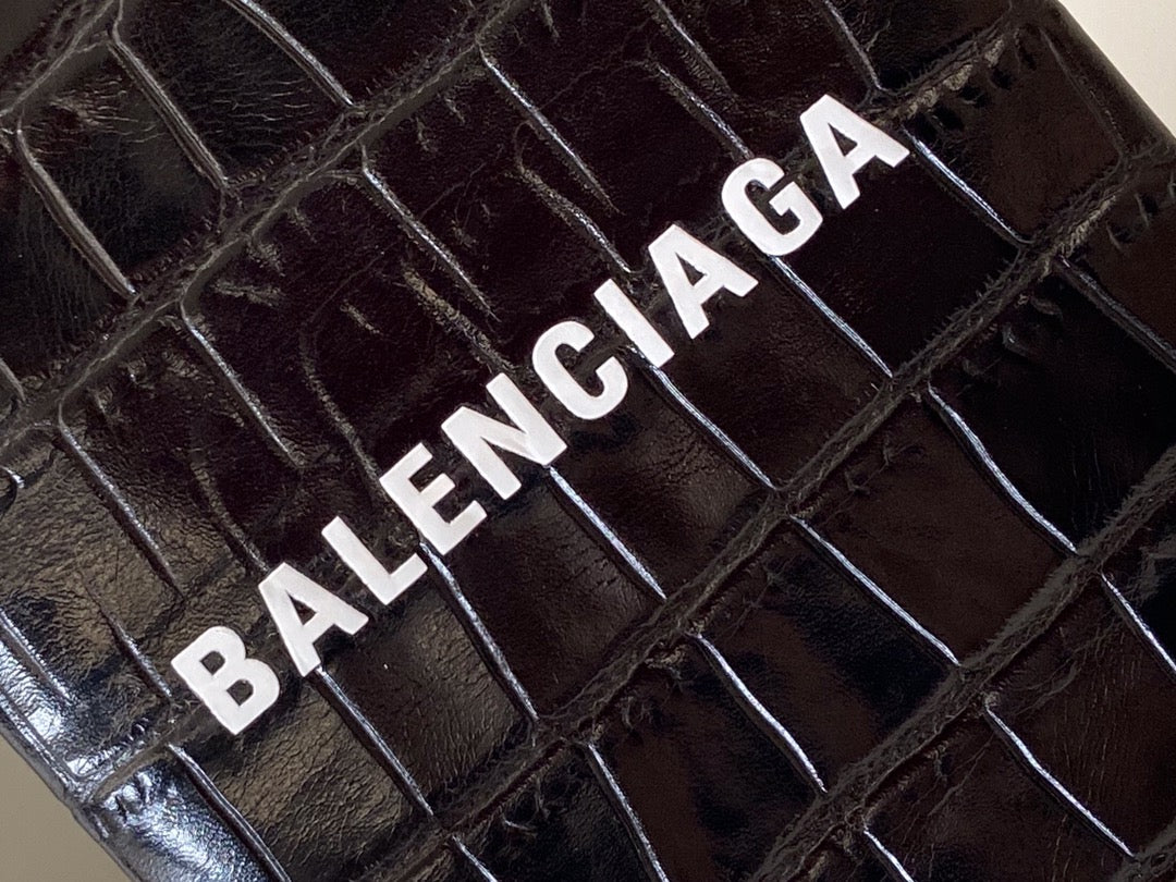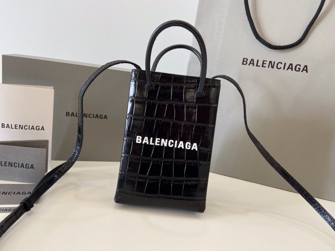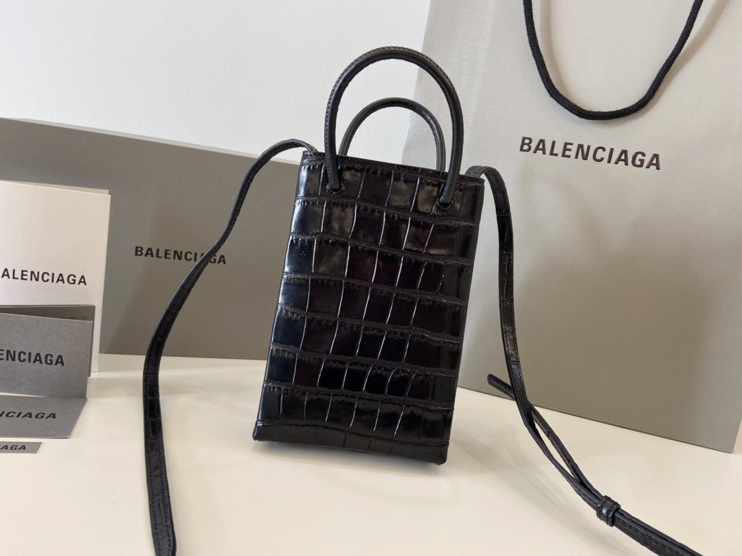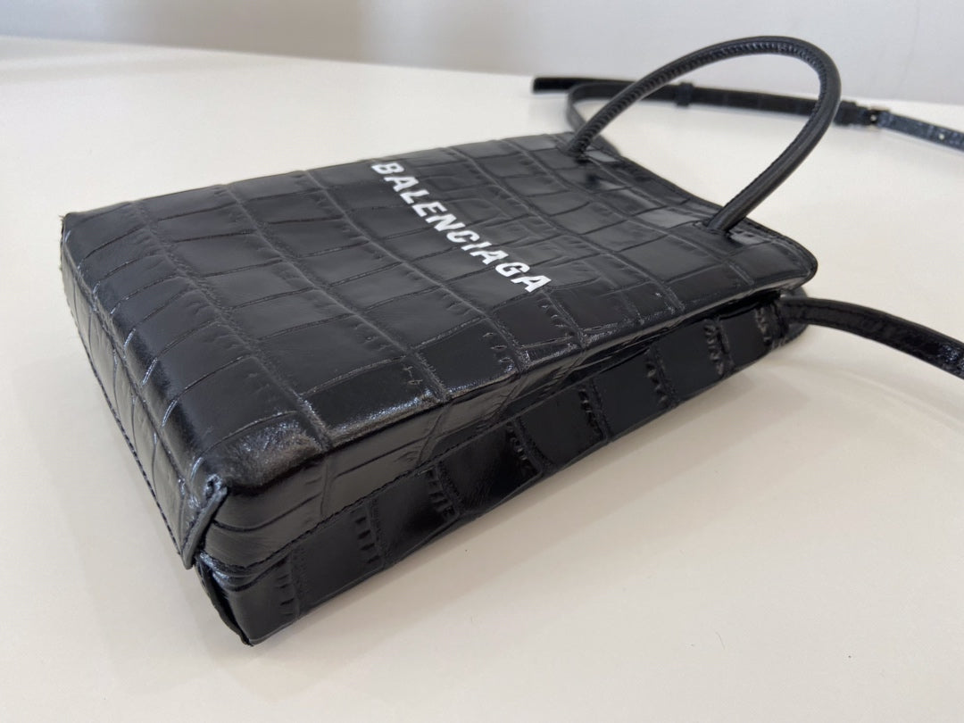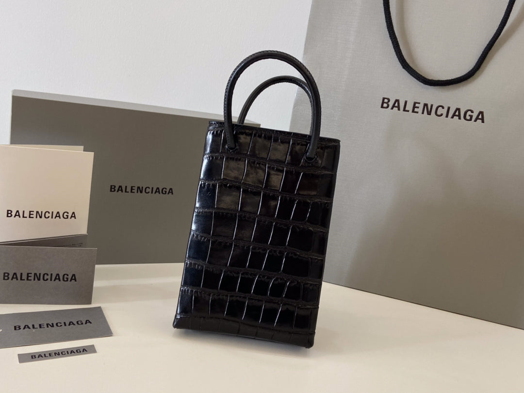 Introducing the Balenciaga Crocodile Black Shopping Bag, a must-have accessory that combines style and practicality. Crafted from high-quality cowhide, this compact bag is designed to effortlessly hold your mobile phone and other essentials, making it the perfect companion for any outing.