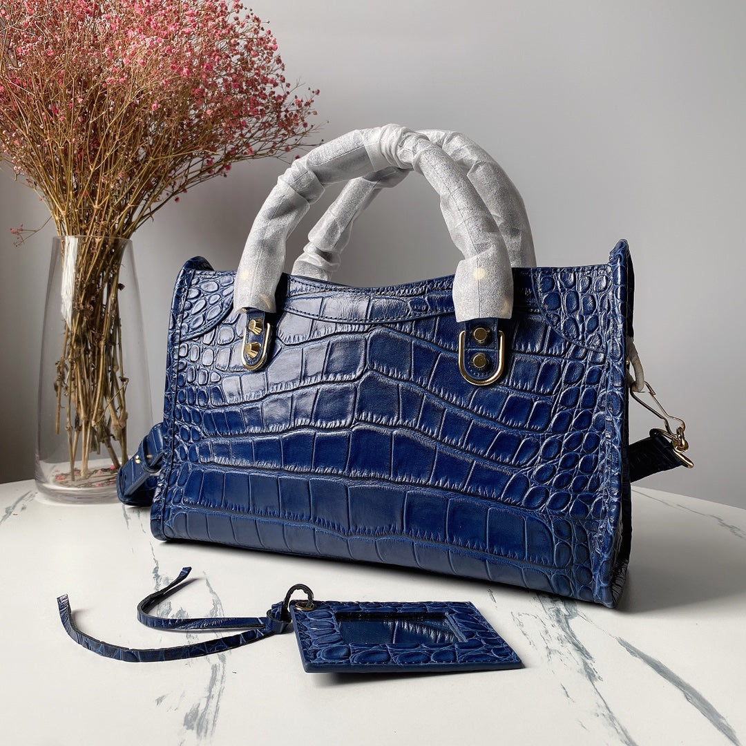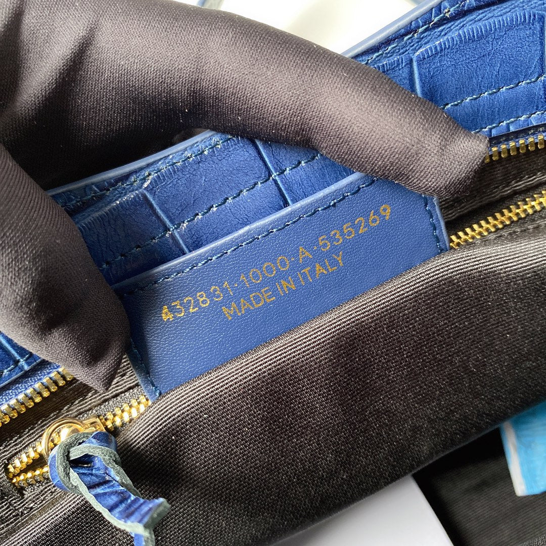Introducing the Balenciaga Crocodile Pattern Biker Bag in a striking royal blue. Crafted from luxurious crocodile-effect calfskin, this high-quality motorcycle bag features a hand-stitched handle for added elegance.