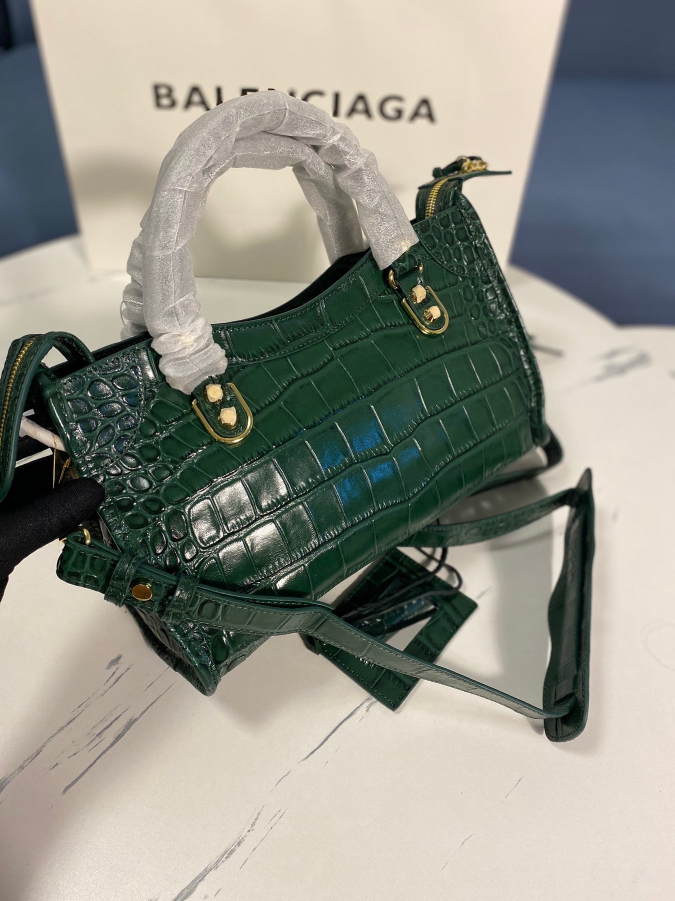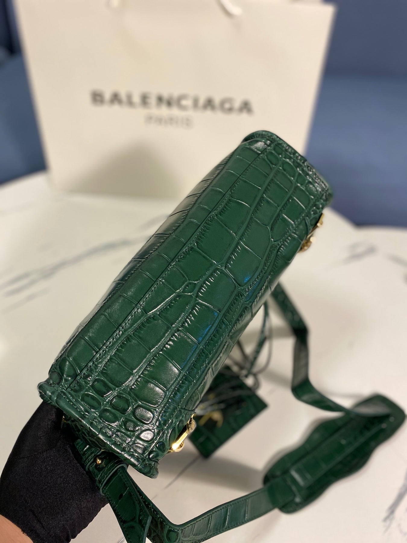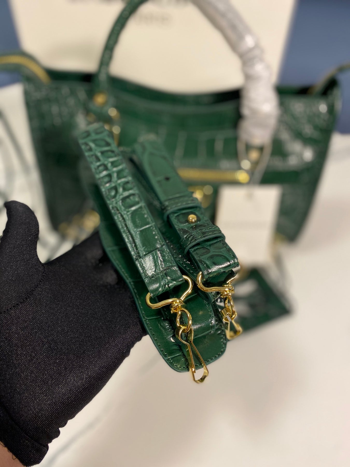 Elevate your style with the Balenciaga Crocodile Pattern Green Motorcycle Bag. Crafted from premium calfskin with a stunning crocodile effect, this luxurious bag is designed for the modern biker enthusiast. The hand-stitched handle offers a comfortable grip, while the detachable shoulder strap provides versatility for any occasion.