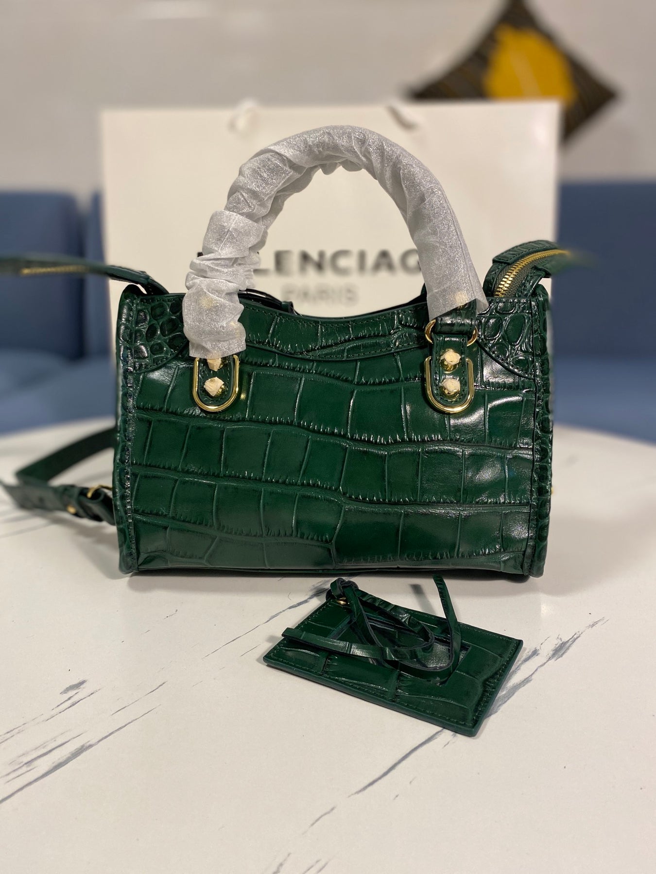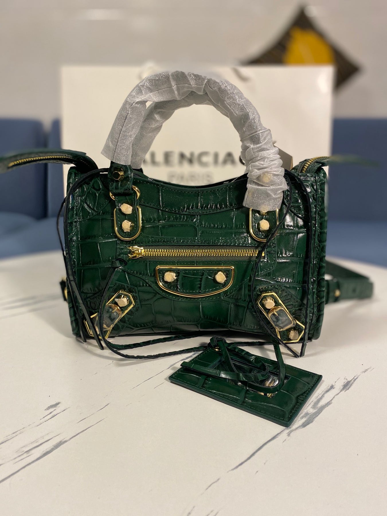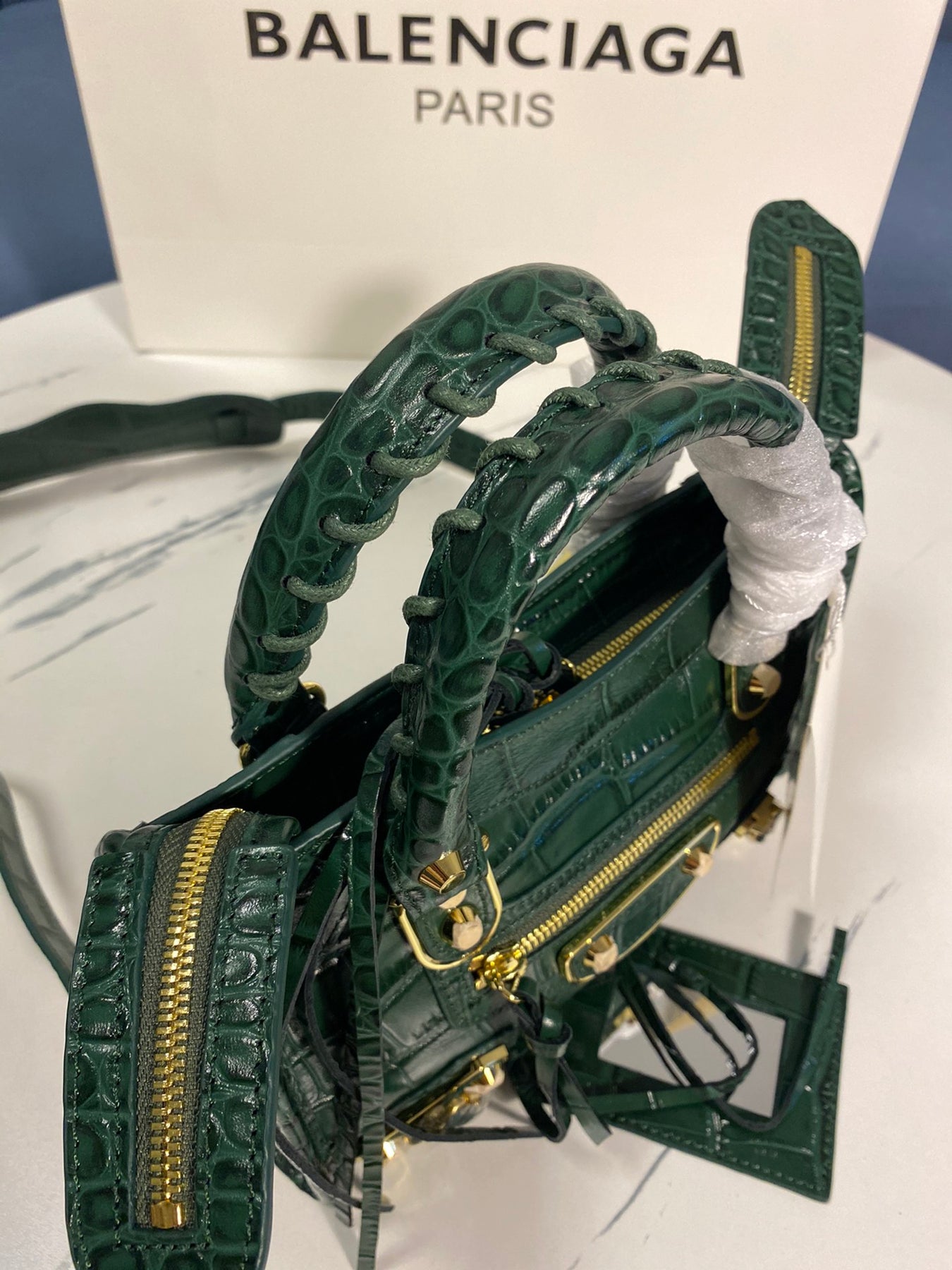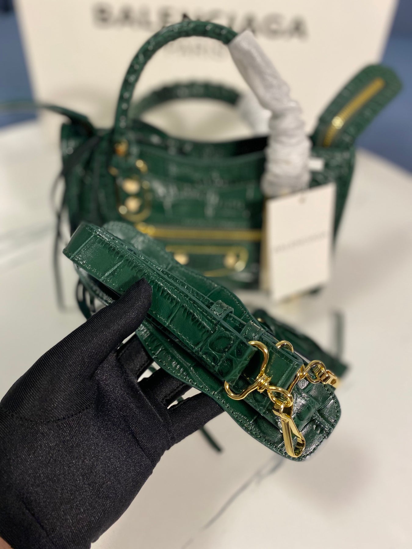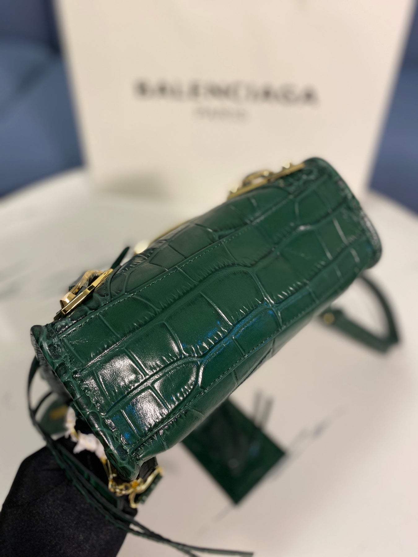 - An engraved Balenciaga gold logo, showcasing high-end craftsmanship