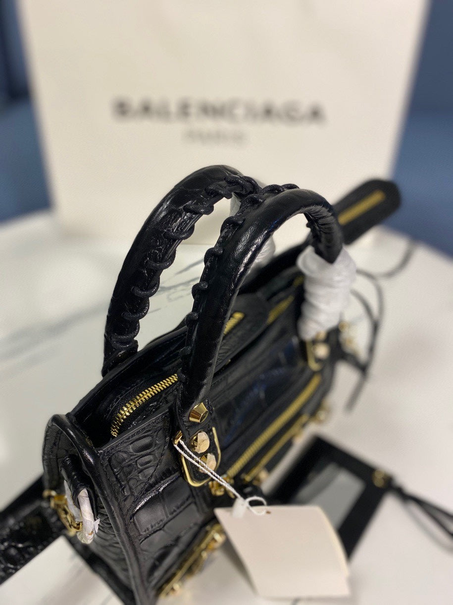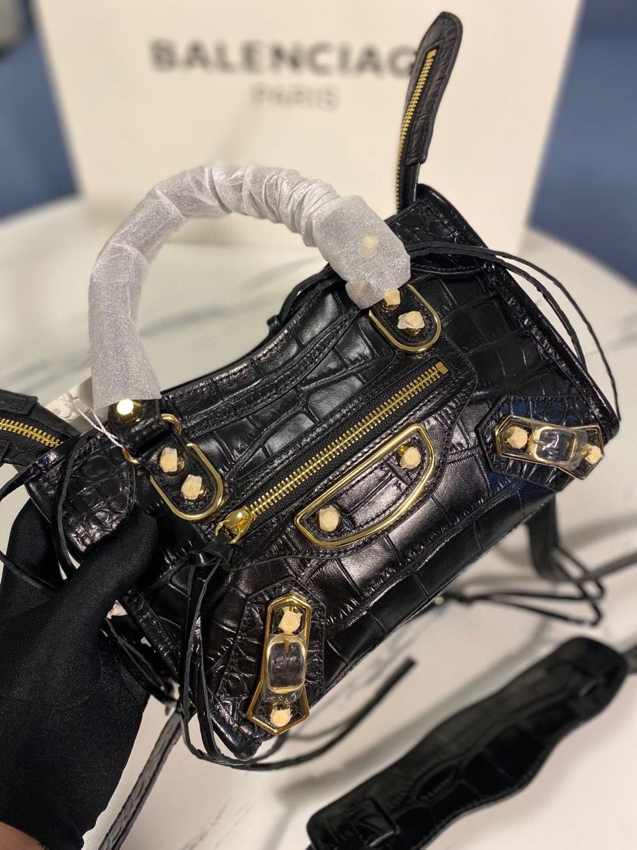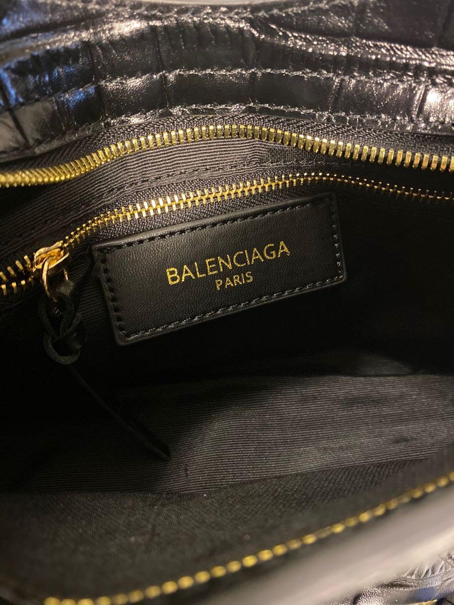 Equipped with a detachable shoulder strap, this bag offers versatility in style, while the ultra-premium gold-rimmed hardware adds a touch of luxury. The thoughtful design includes a secure internal zipper pocket and a leather mirror, along with the iconic Balenciaga gold logo engraved for a distinguished finish.