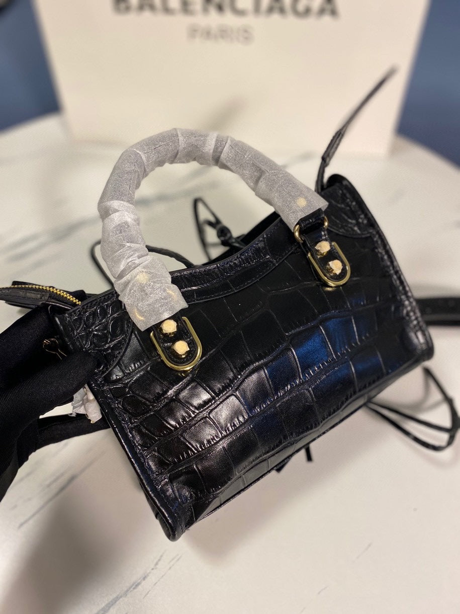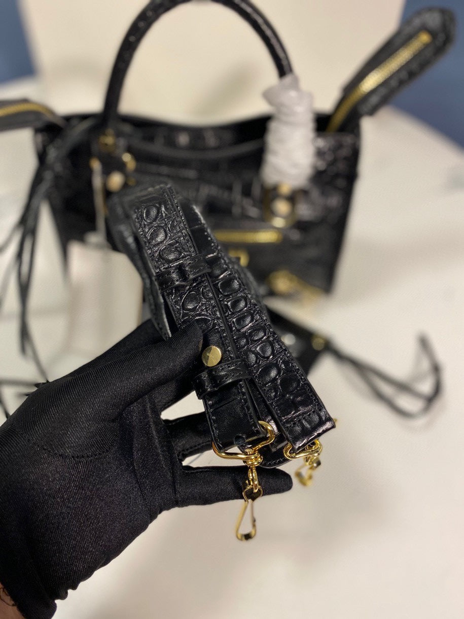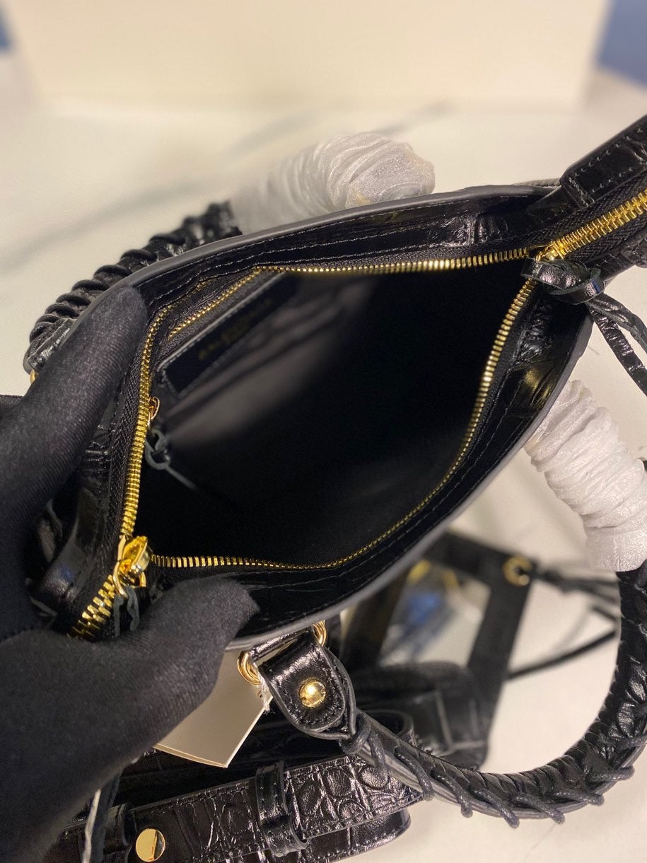 Introducing the Balenciaga Crocodile-Pattern Motorcycle Bag, a striking blend of elegance and functionality. This luxurious bag features a sophisticated crocodile-effect calfskin exterior, complemented by hand-stitched handles for a refined touch. With a size of 23cm x 15cm x 9cm, it's perfect for everyday use or special occasions.