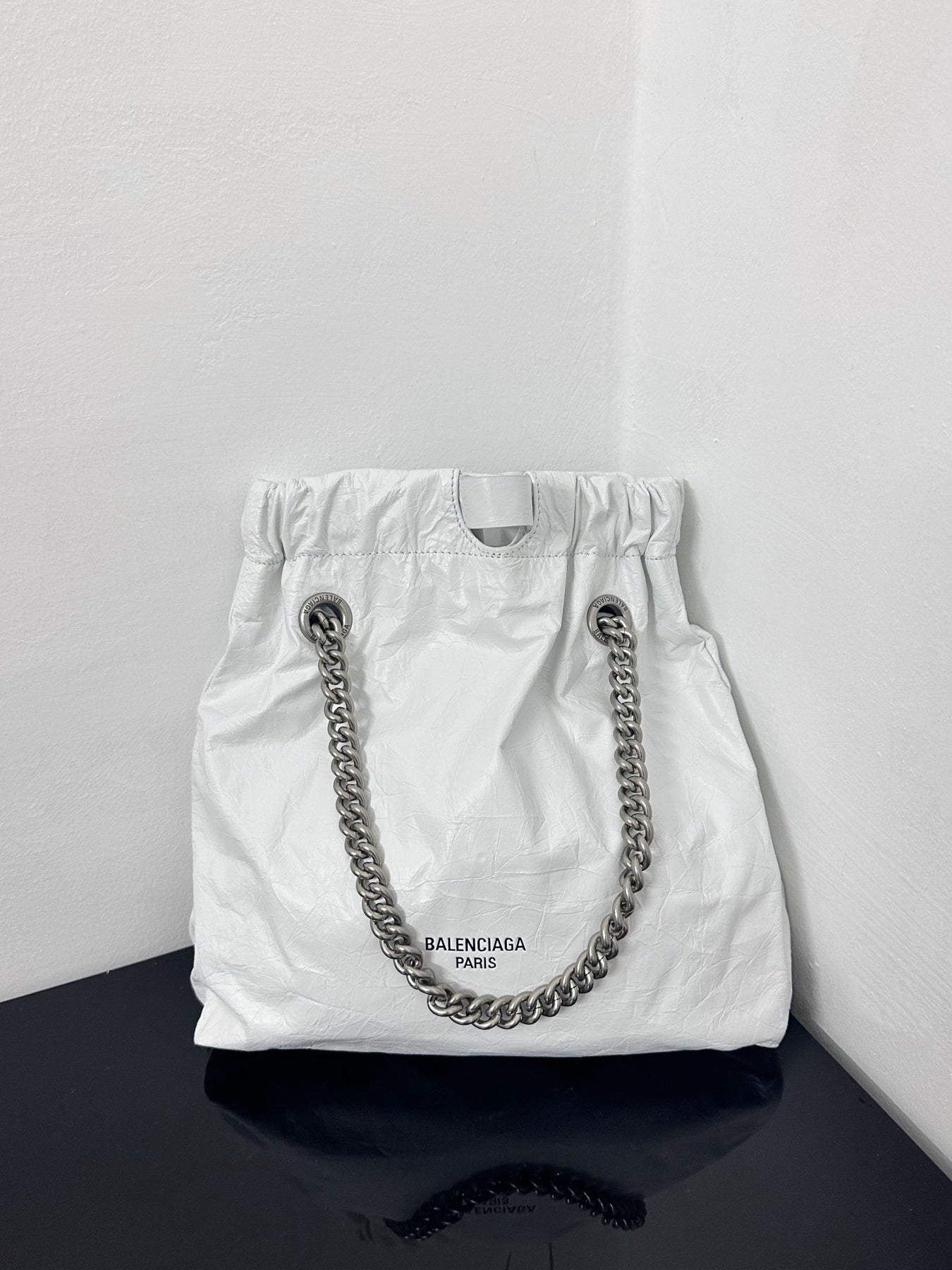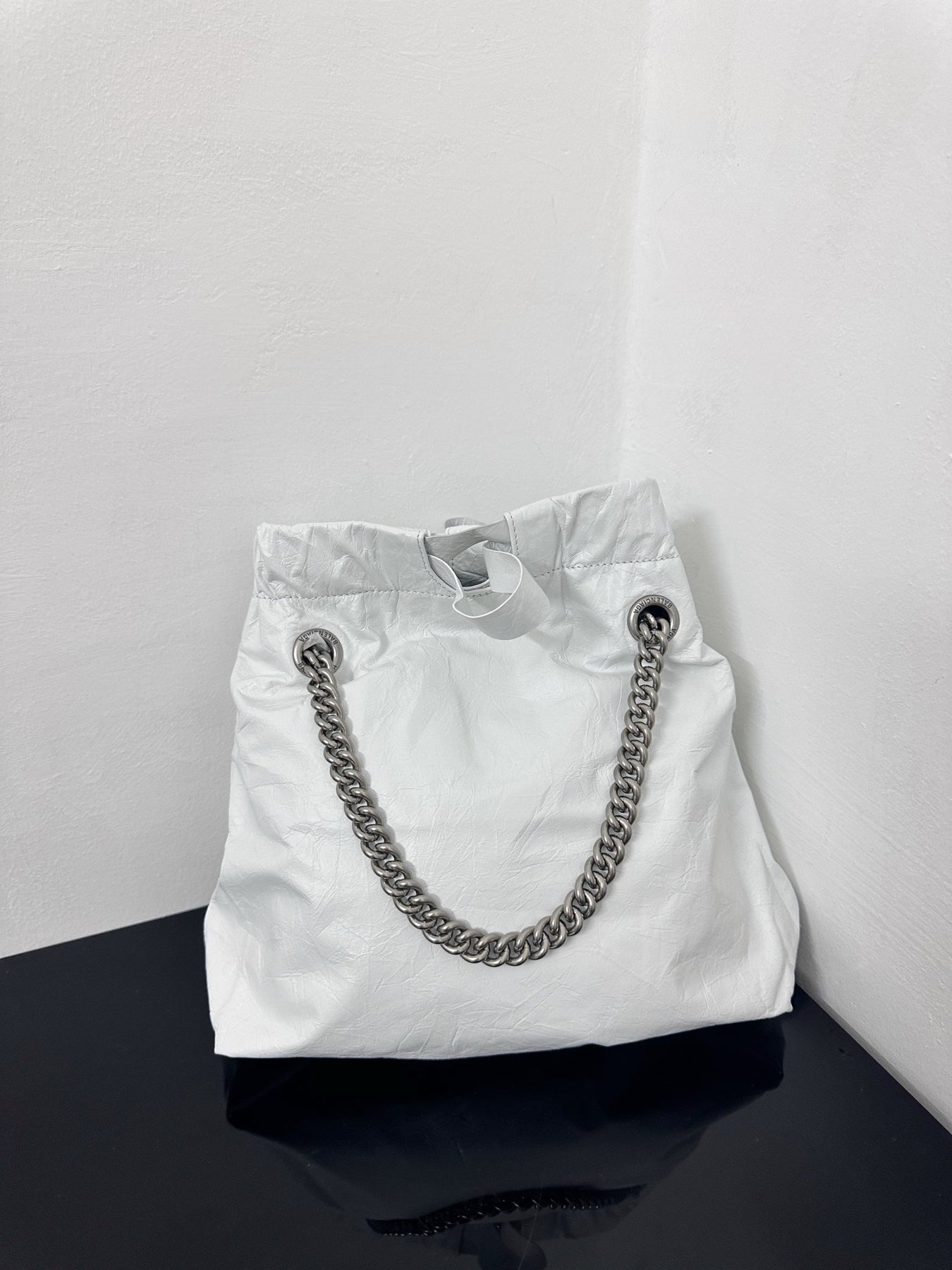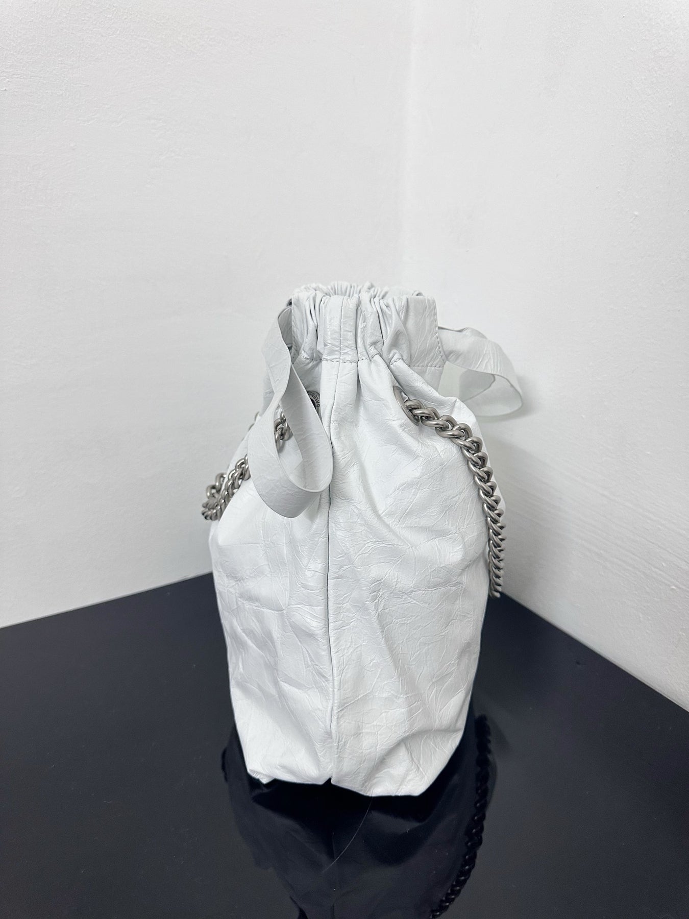 Introducing the Balenciaga Crush Tote Bag in Pleated White, a chic and sophisticated accessory that redefines everyday functionality. Crafted from glossy, wrinkled calfskin, this innovative bag simulates the texture of a classic plastic bag while exuding a high-end, fashionable vibe.