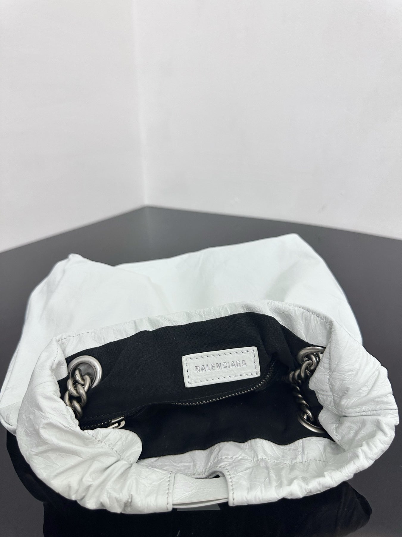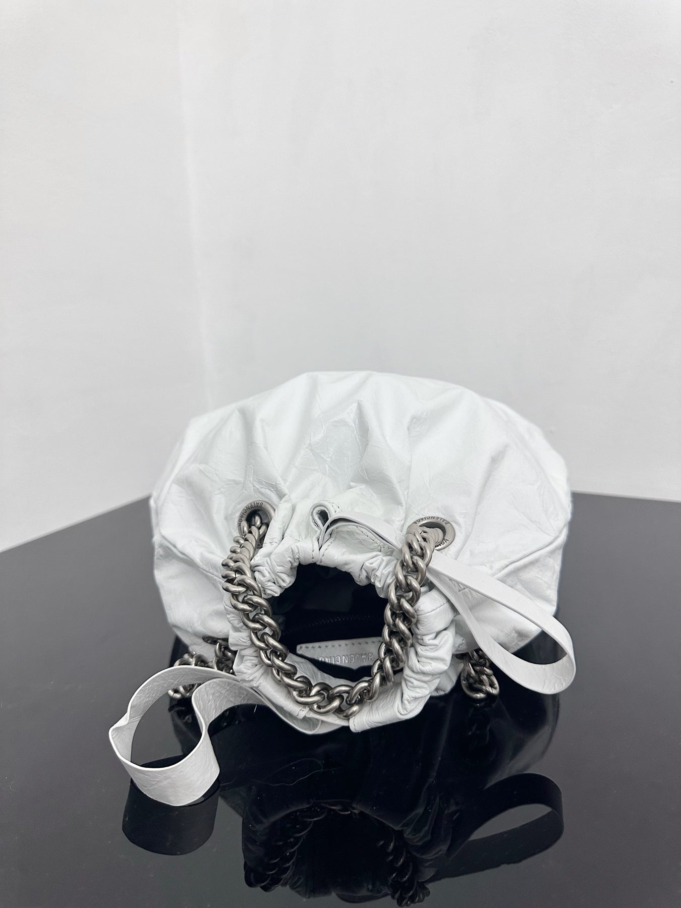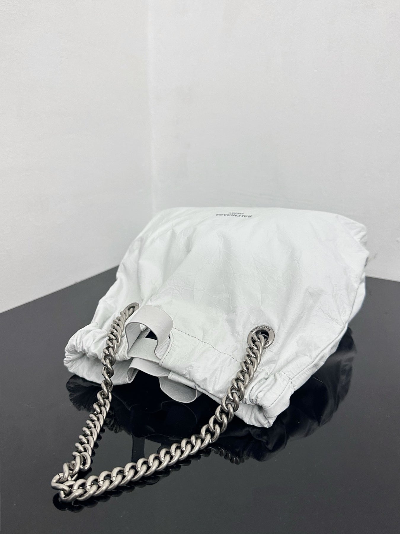 Introducing the Balenciaga Crush Tote Bag in Pleated White, a chic and sophisticated accessory that redefines everyday functionality. Crafted from glossy, wrinkled calfskin, this innovative bag simulates the texture of a classic plastic bag while exuding a high-end, fashionable vibe.