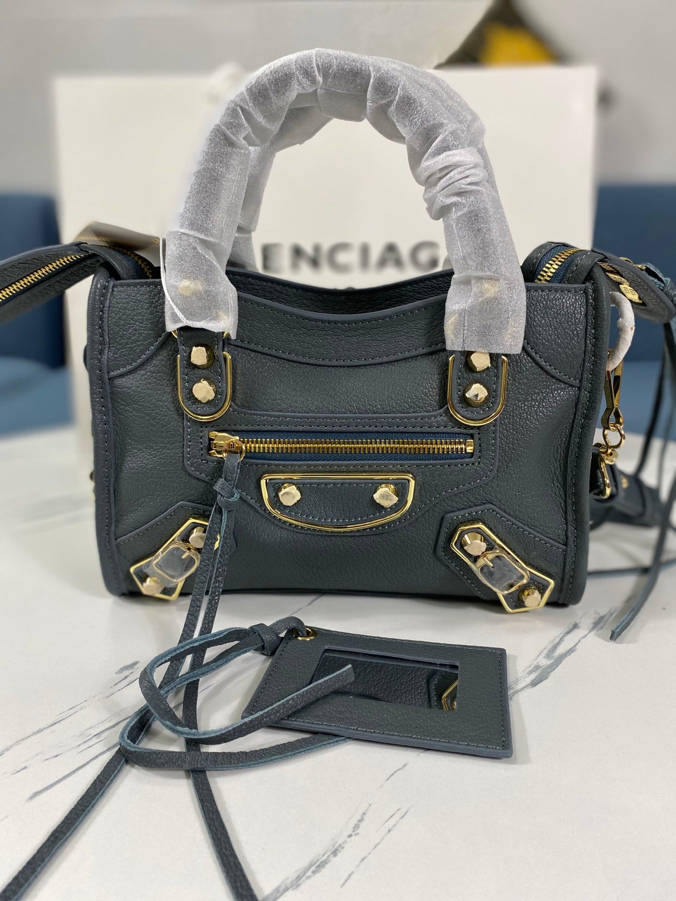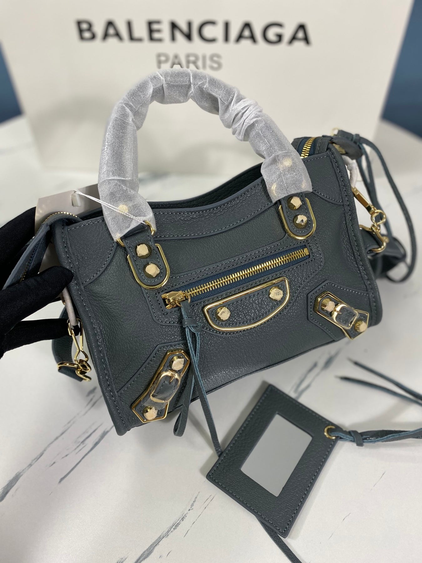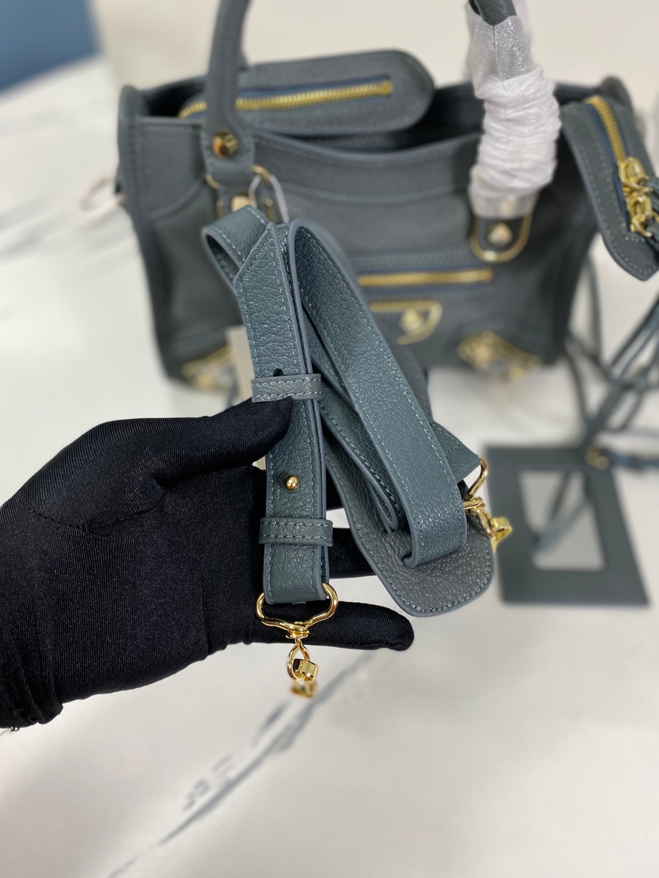 Discover the Balenciaga Goatskin Mini Motorcycle Bag, a classic masterpiece in luxurious gray-blue. Crafted from original, high-quality goatskin, this bag offers both beauty and durability. Measuring 23cm x 15cm x 9cm, it features an elegant gold buckle and comes with a detachable, adjustable shoulder strap (total length approx. 100cm) for versatile carrying options. The bag also includes a cosmetic mirror, making it perfect for on-the-go touch-ups. Available in three sizes, this stylish accessory is a must-have for any fashion-forward individual. Elevate your style with this iconic piece today!