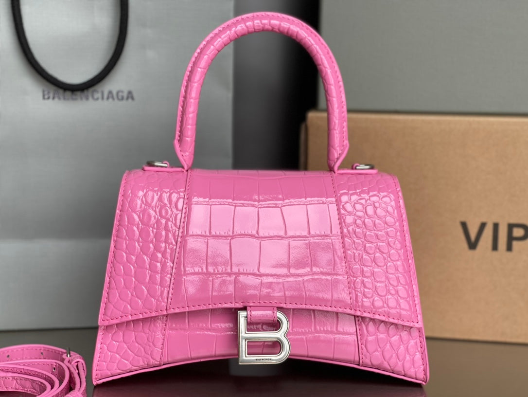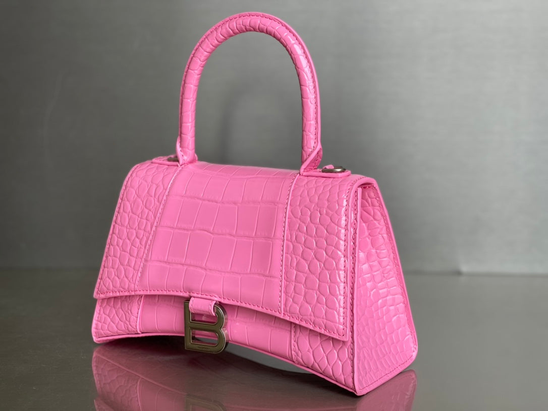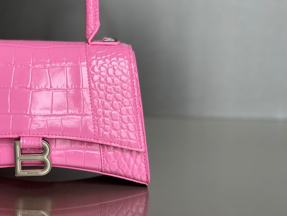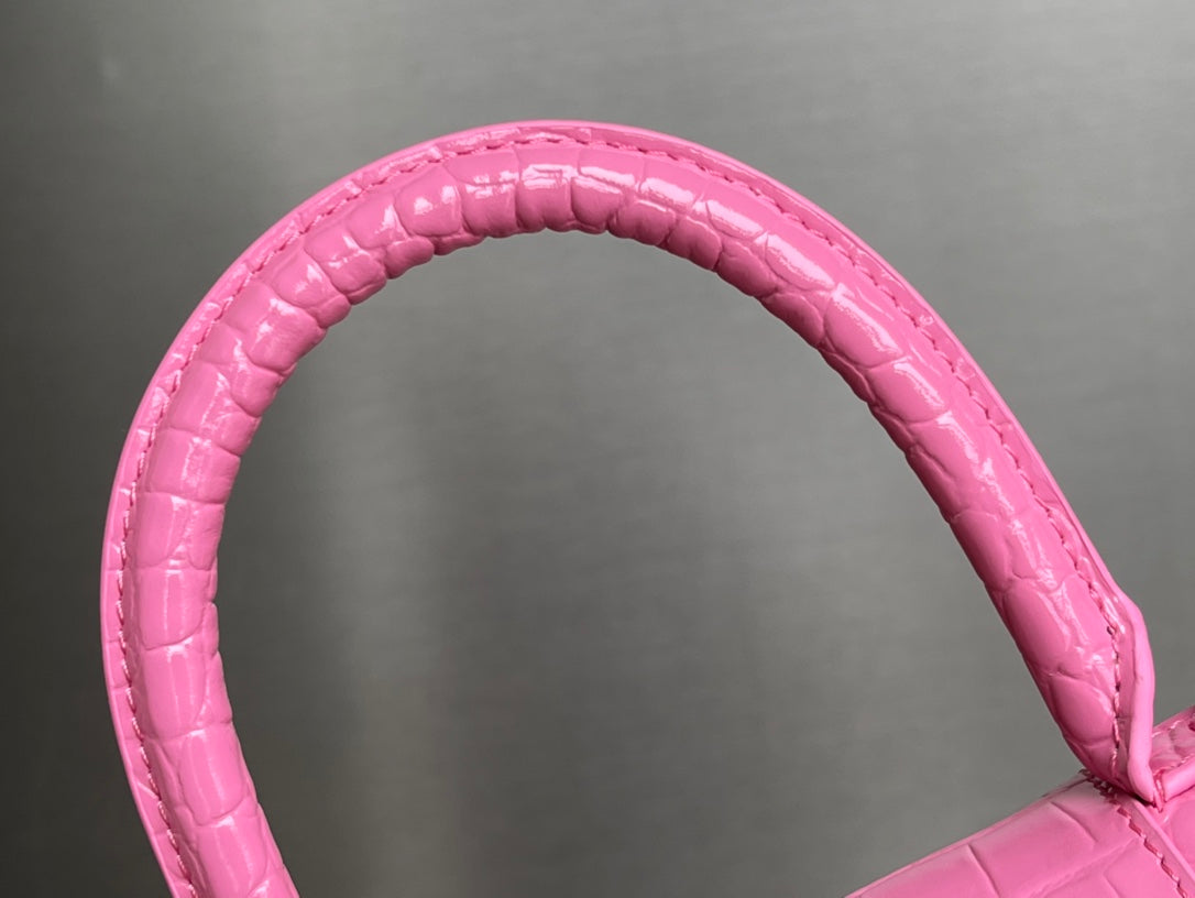 Introducing the Balenciaga Hourglass Bag in a stunning pink crocodile pattern with a luxurious silver buckle, available in size S (23cm). Crafted from premium Italian cowhide, this bag not only exudes elegance but also feels incredibly soft to the touch.
