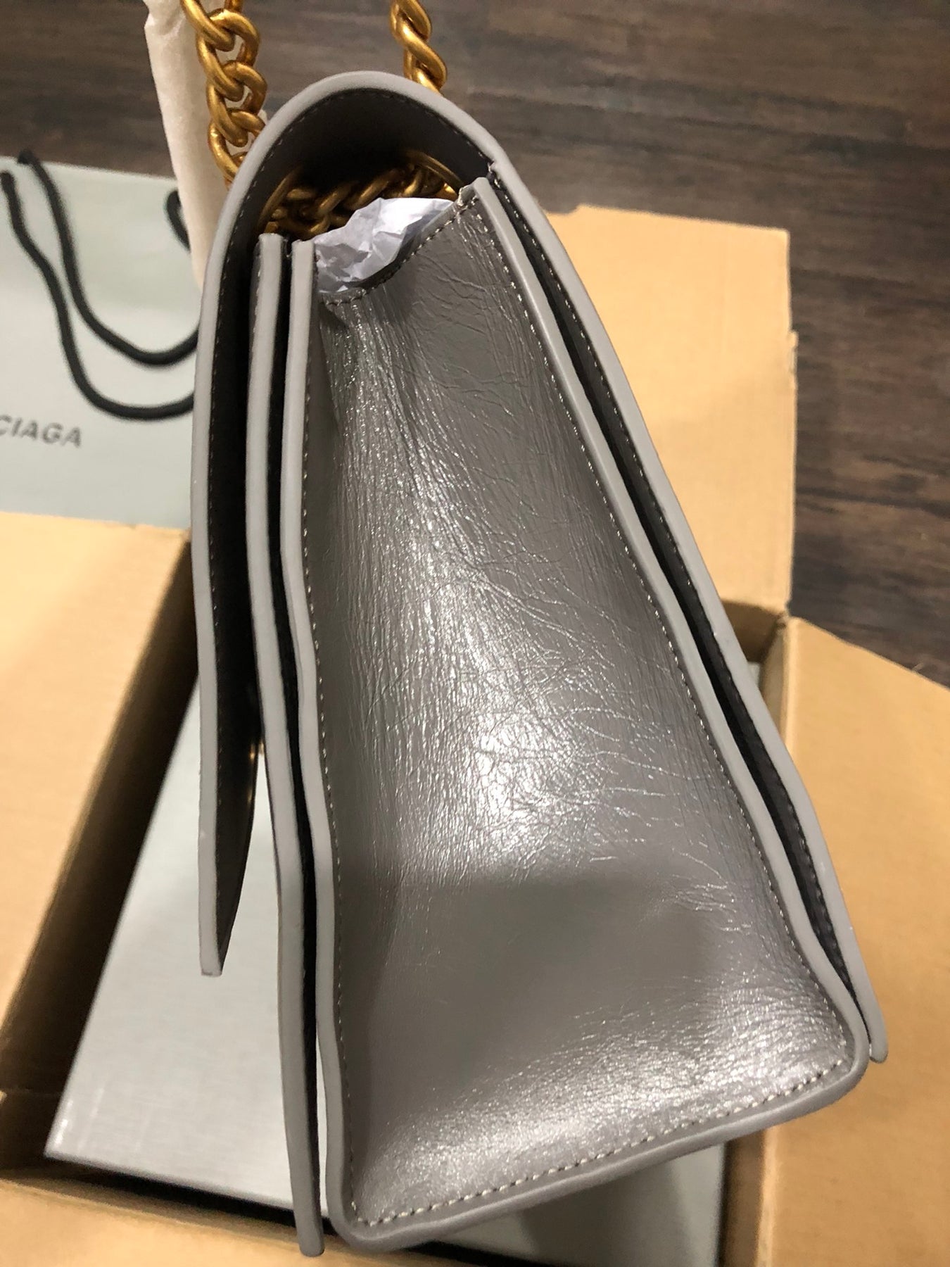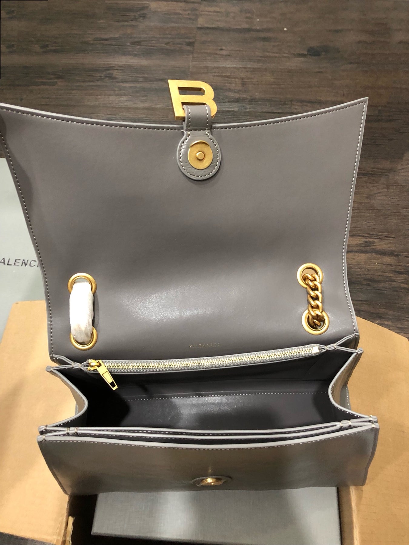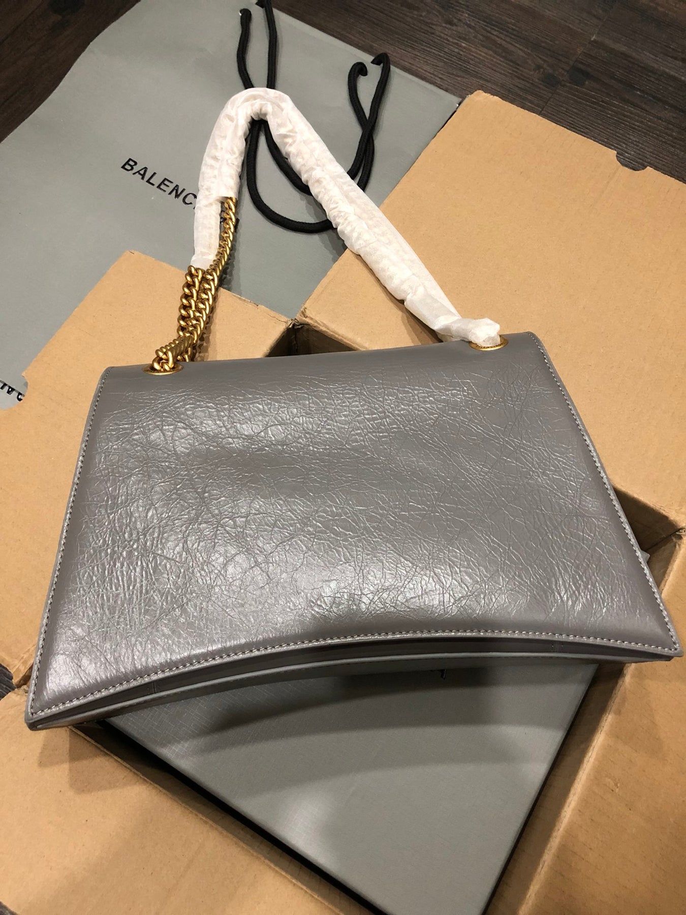 Introducing the Balenciaga Hourglass Chain Bag, a statement piece that merges elegance with contemporary style. Featuring a medium gray hue and a distinctive cracked gold buckle, this bag is designed to turn heads with its unique arc shape that nods to timeless classics.