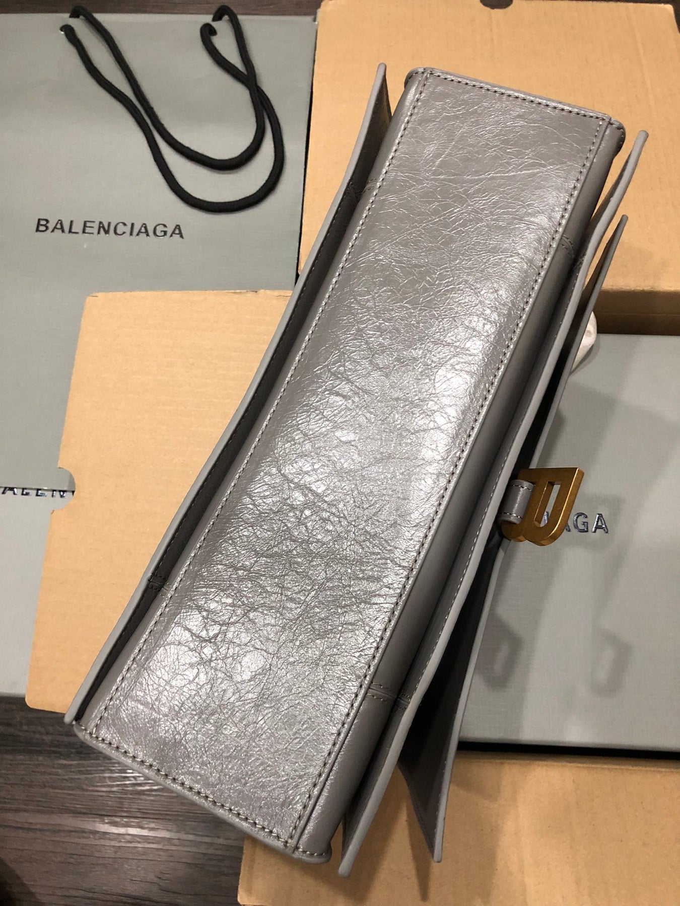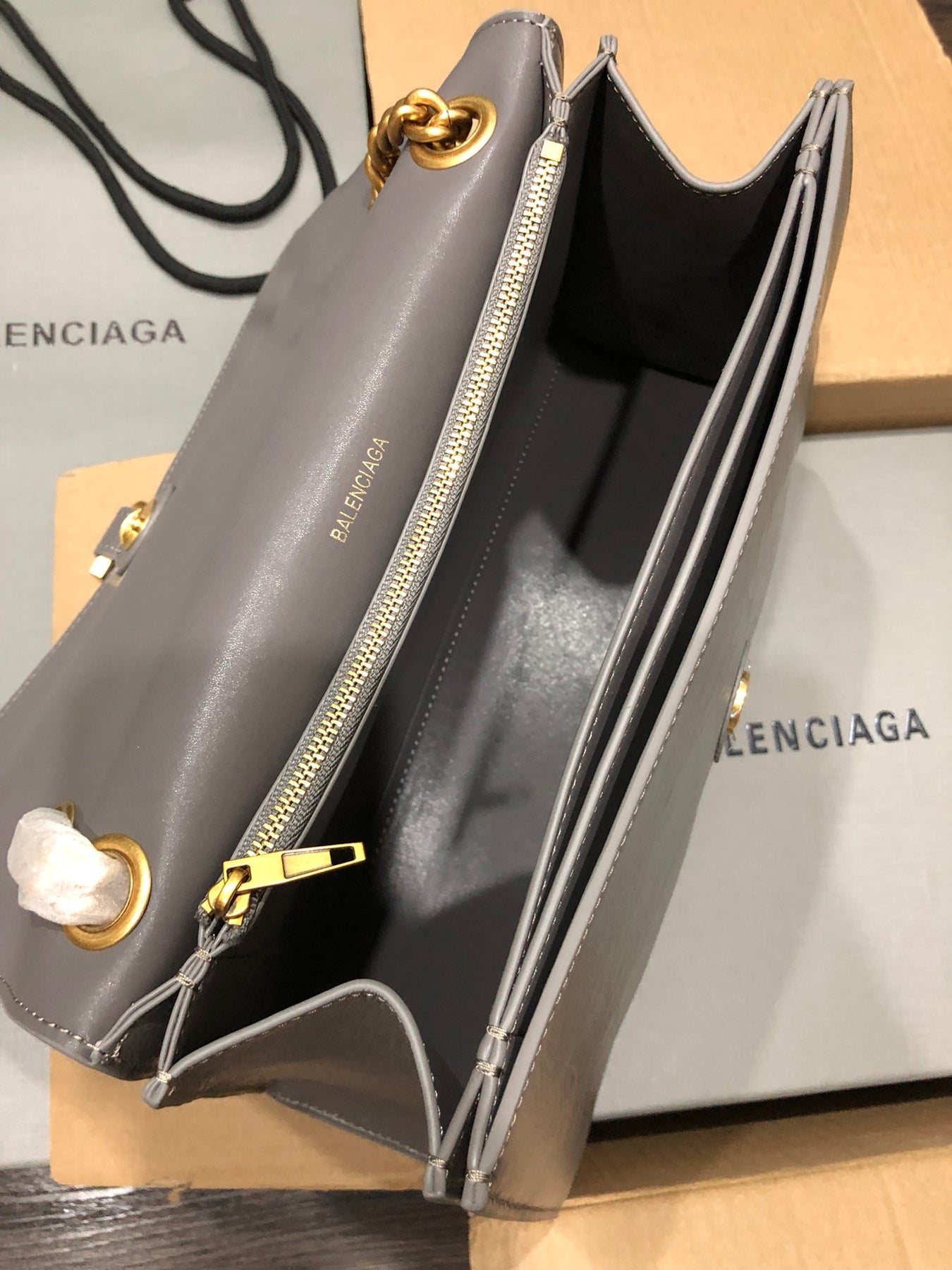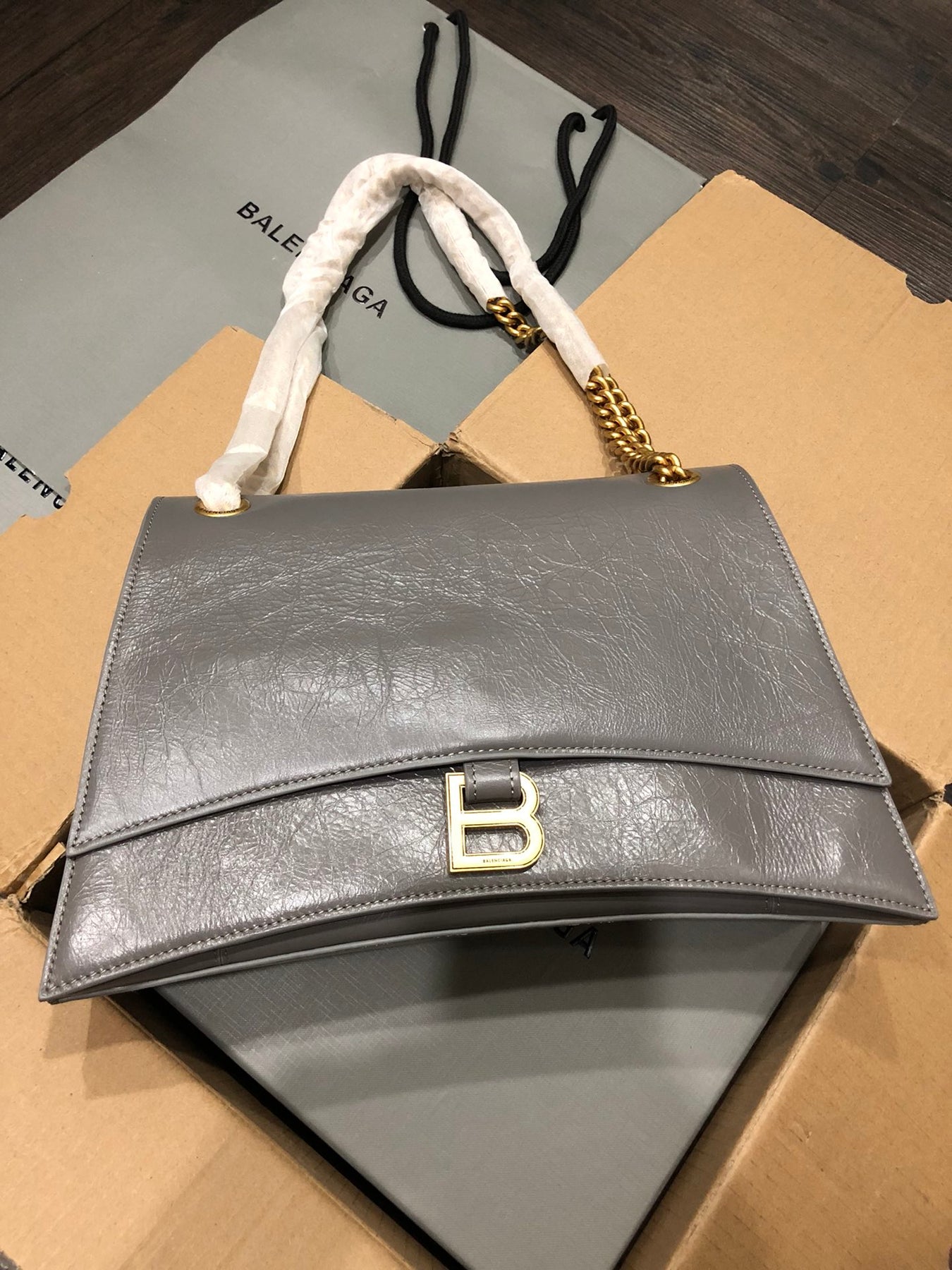 Introducing the Balenciaga Hourglass Chain Bag, a statement piece that merges elegance with contemporary style. Featuring a medium gray hue and a distinctive cracked gold buckle, this bag is designed to turn heads with its unique arc shape that nods to timeless classics.