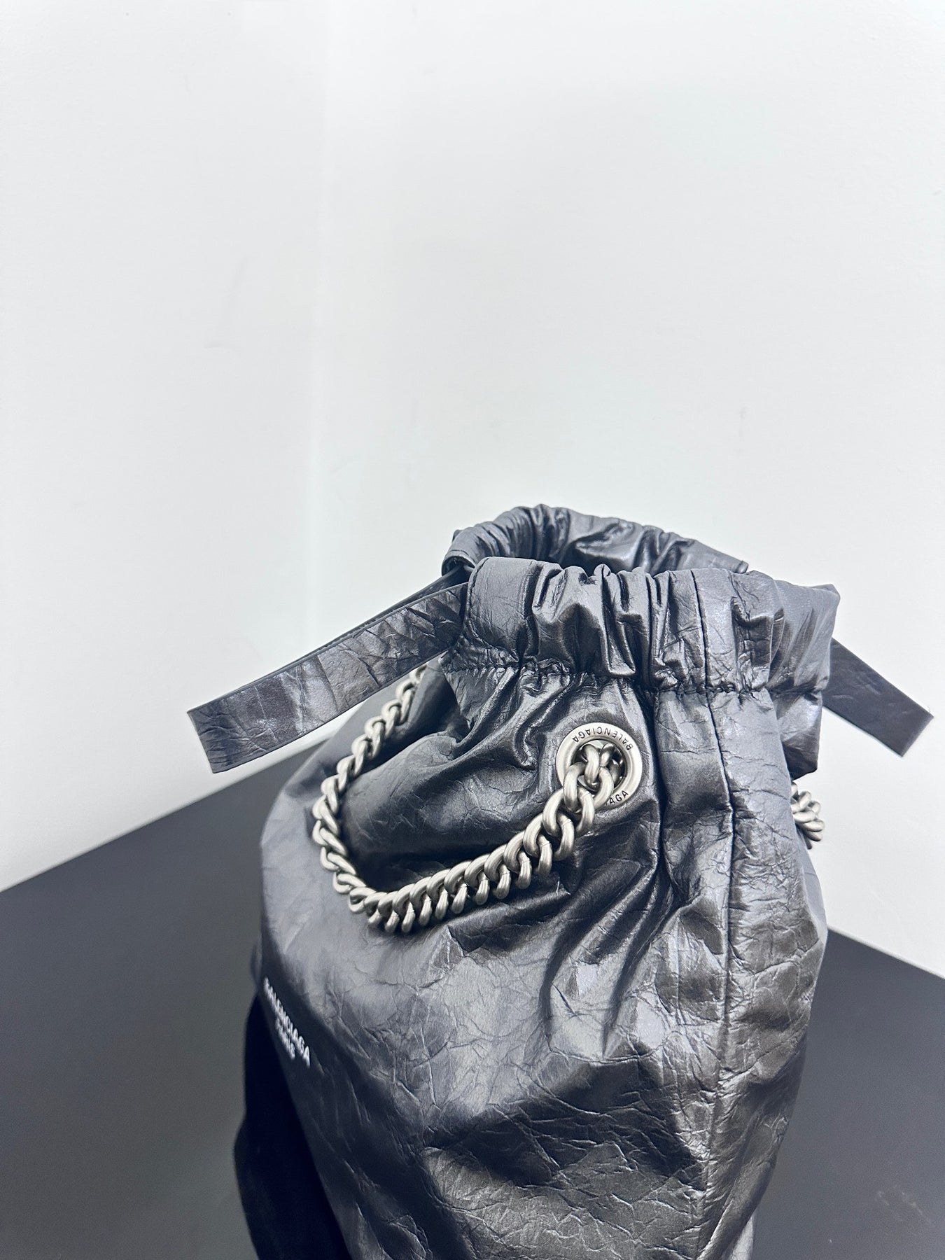Discover the latest Balenciaga Crush Tote Bag, crafted from glossy wrinkled calfskin for a striking look that mimics the texture of a plastic bag. This chic and innovative design features a front logo and a convenient drawstring closure, making it a fashionable yet functional accessory.