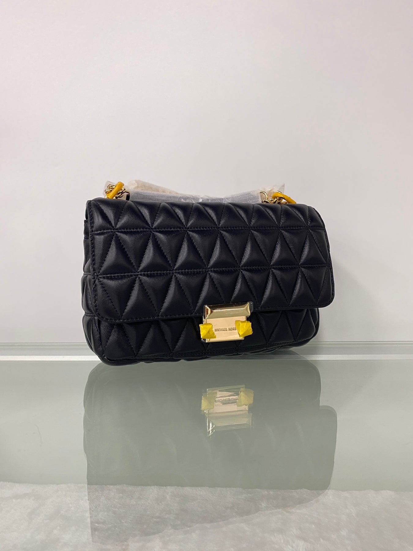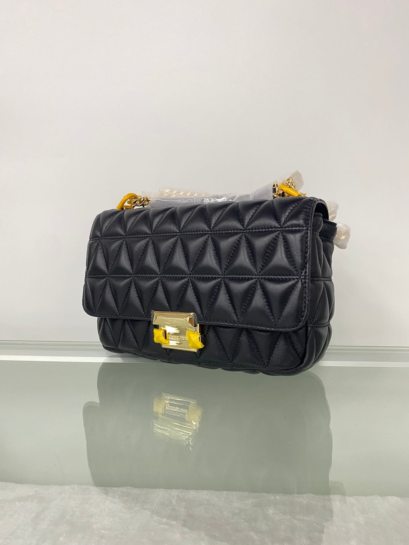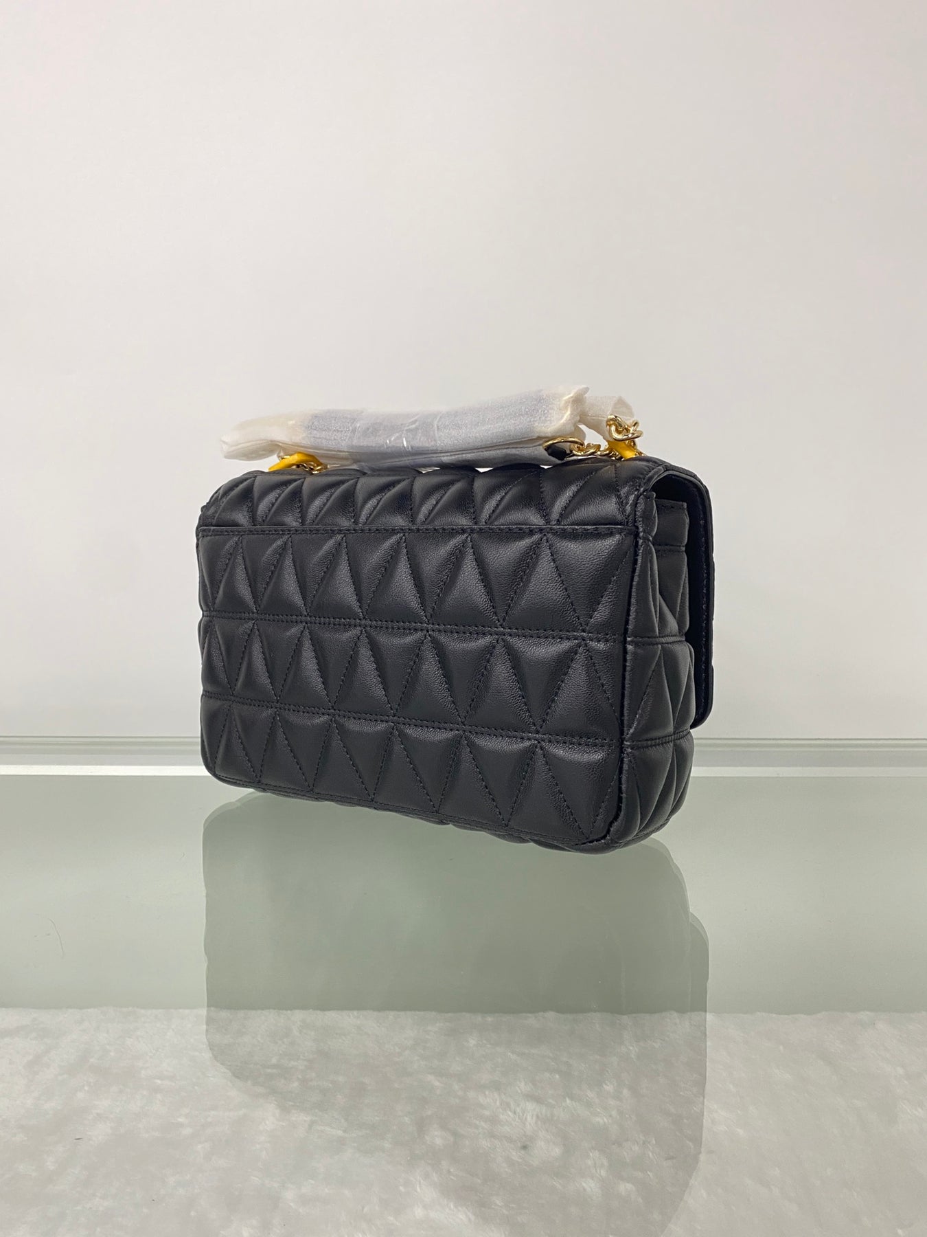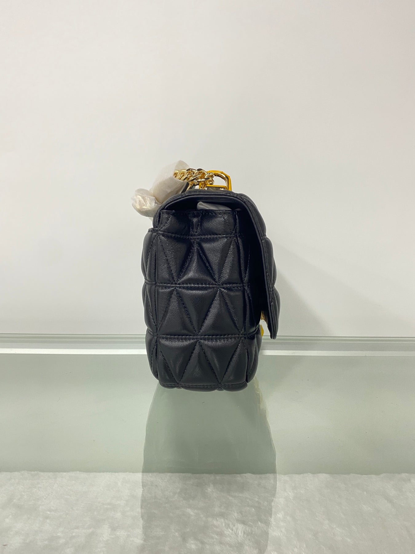 Elevate your style with our Sloan Series Black Diamond Sheepskin Medium Women's Chain Bag. Crafted from soft, delicate sheepskin, this elegant bag features a unique locking mechanism and adjustable shoulder straps for ultimate versatility. Its diamond-embossed design adds a touch of sophistication, making it the perfect accessory to complement any outfit. With compact dimensions of 26cm x 17cm x 8cm, this bag beautifully merges practicality with luxury. Perfect for day or night, the Sloan Series bag is a must-have addition to your wardrobe.