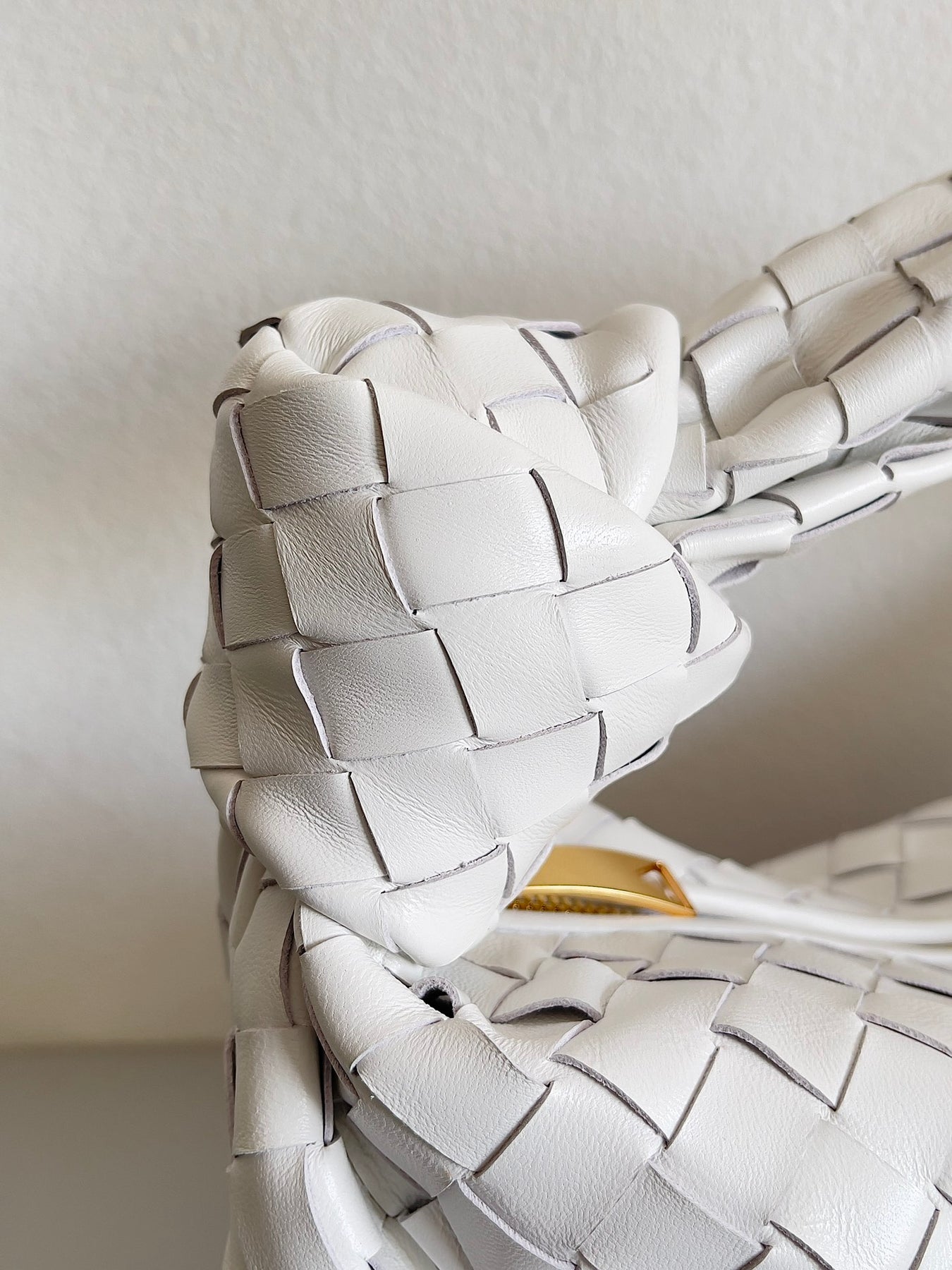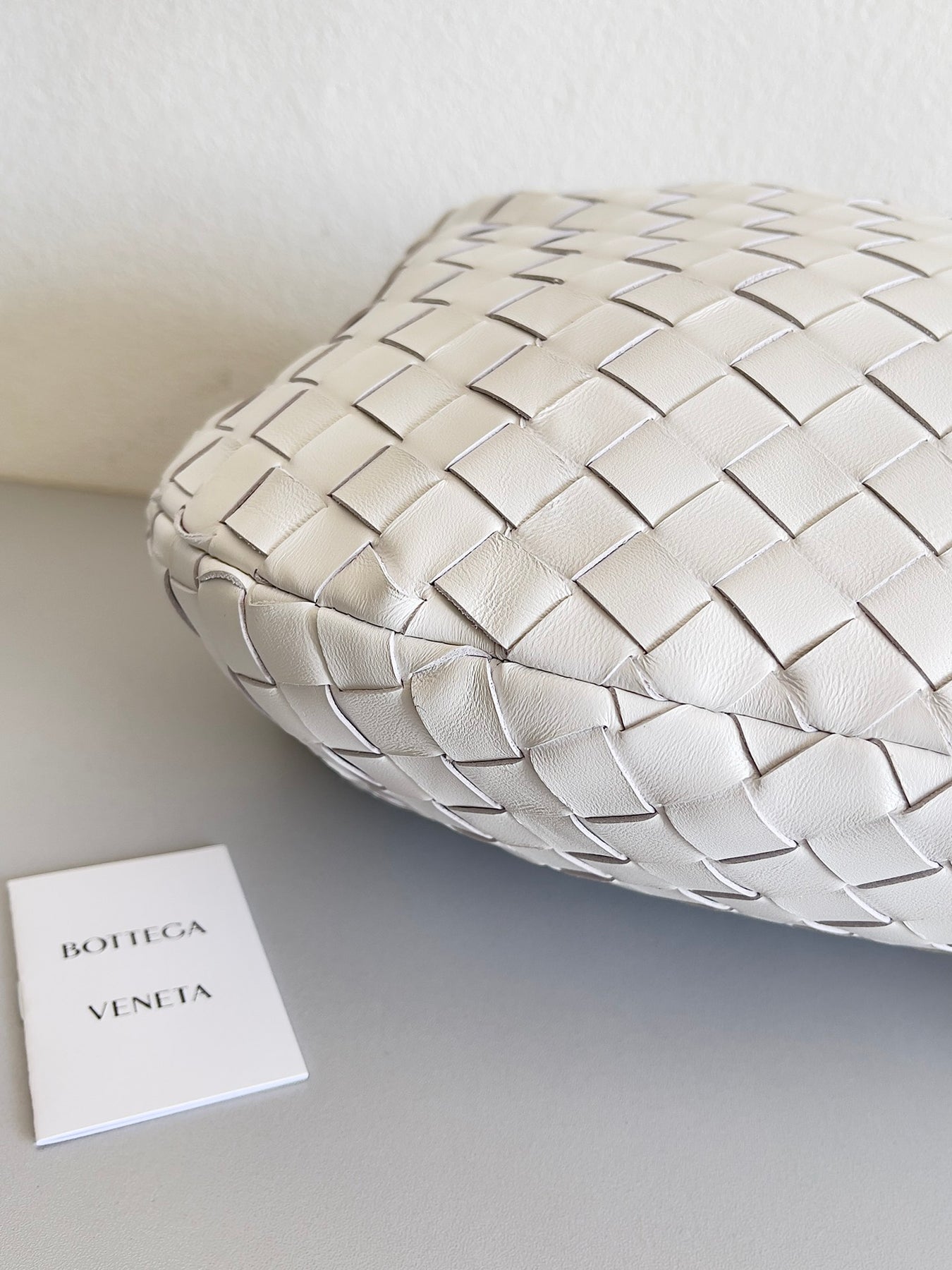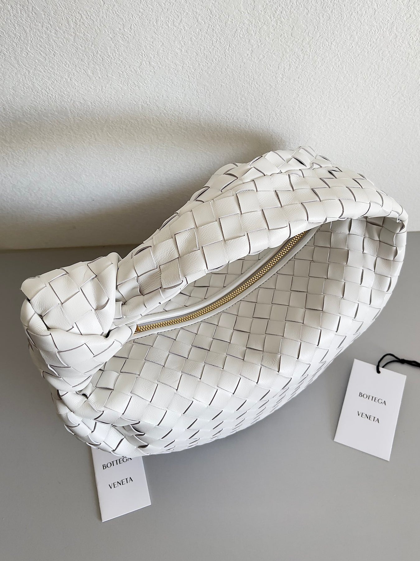 Discover the elegance of the Botega Veneta Jodie handbag in pure white. This medium-sized masterpiece combines aesthetic appeal with exceptional durability, making it a perfect choice for any occasion.