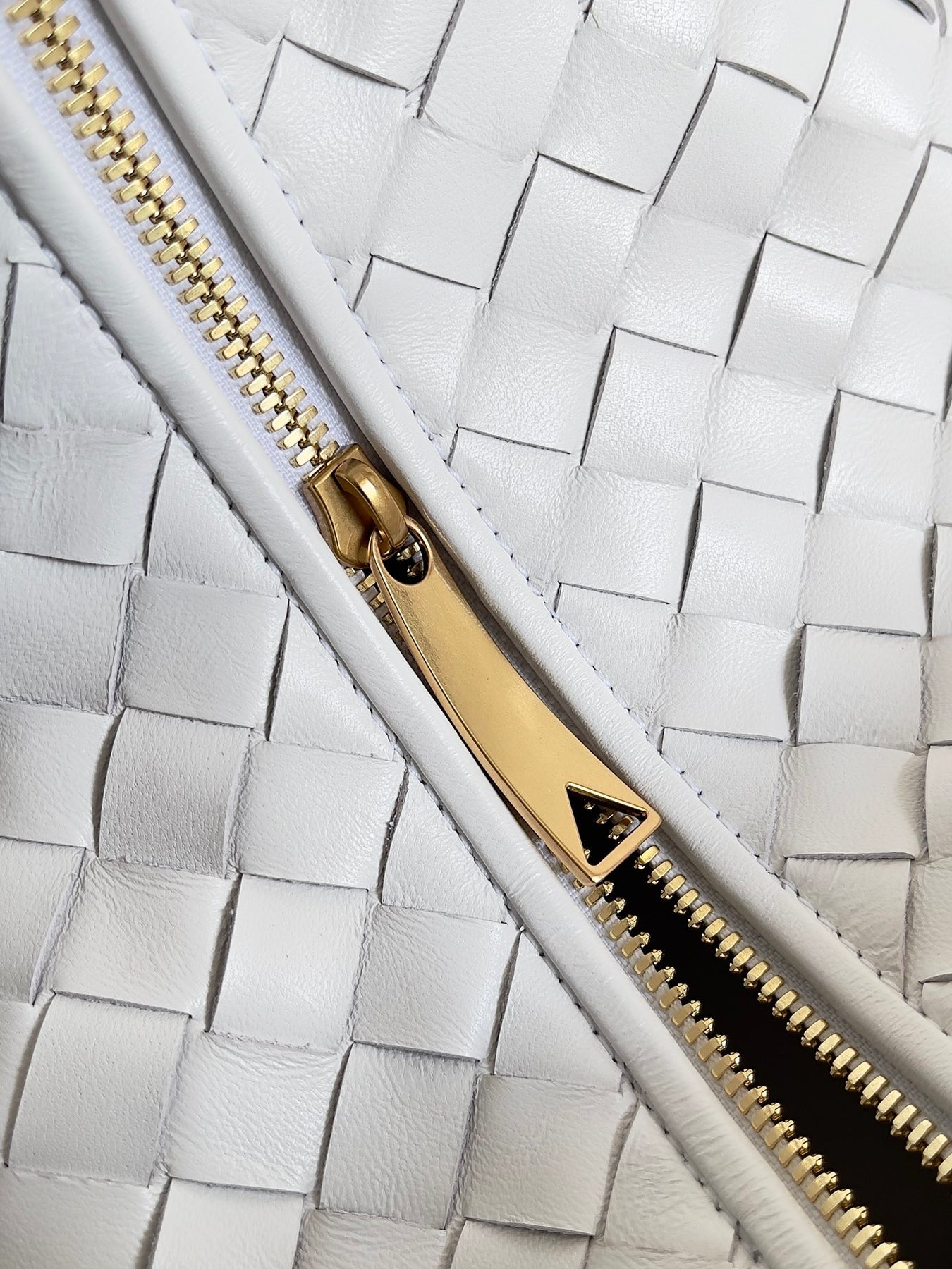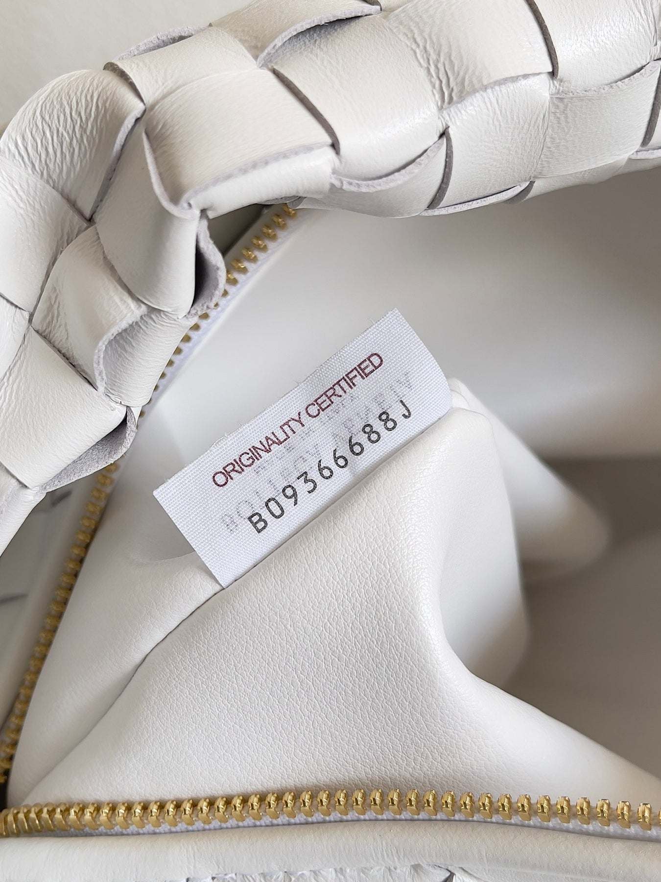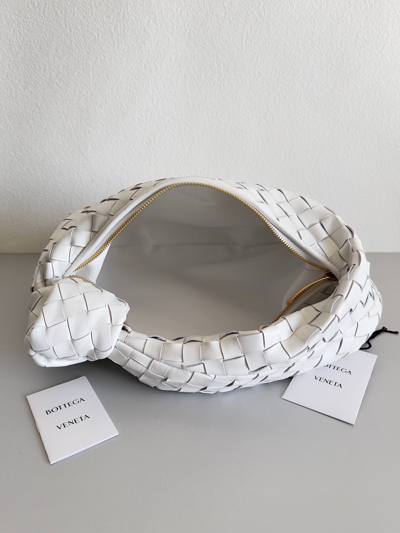 Discover the elegance of the Botega Veneta Jodie handbag in pure white. This medium-sized masterpiece combines aesthetic appeal with exceptional durability, making it a perfect choice for any occasion.