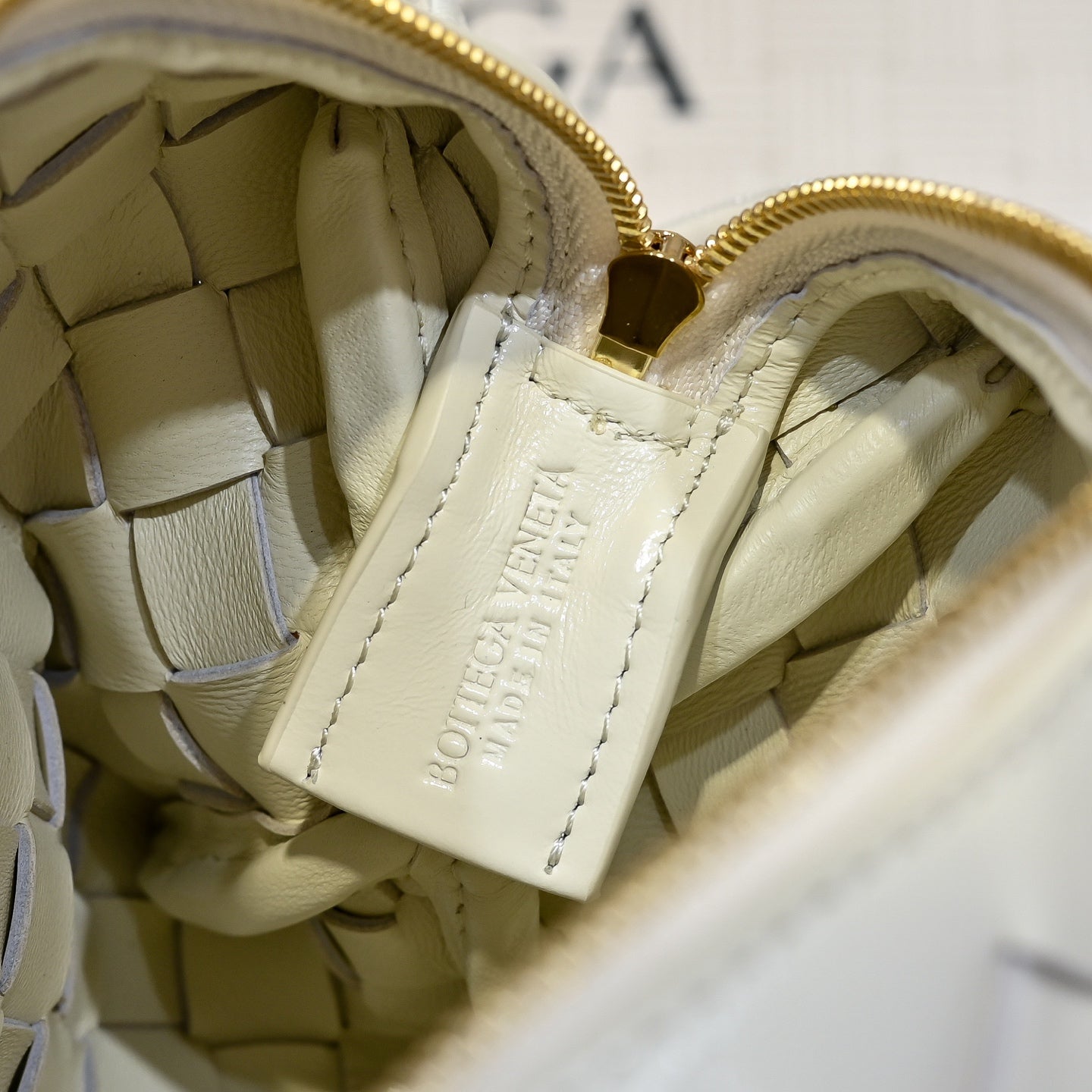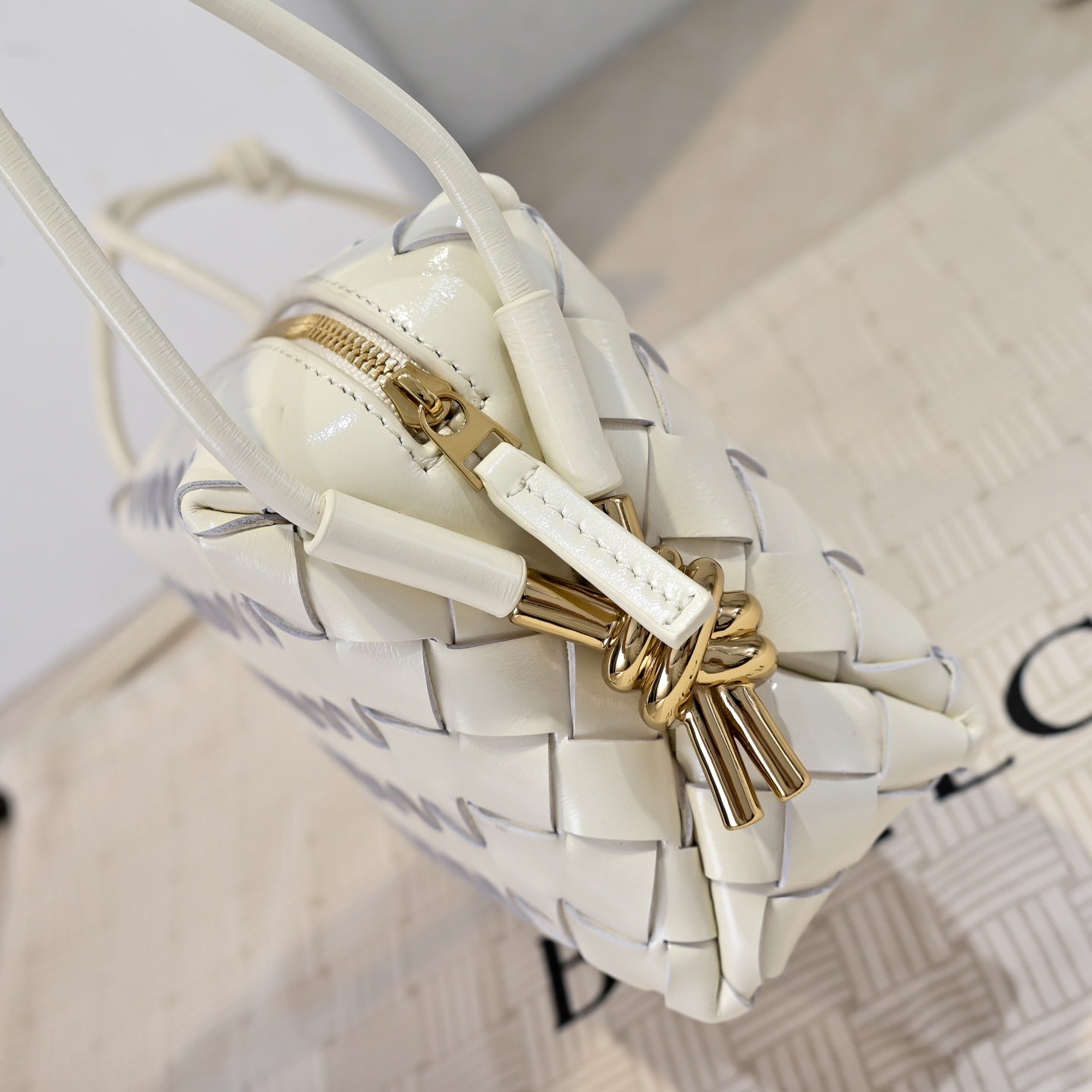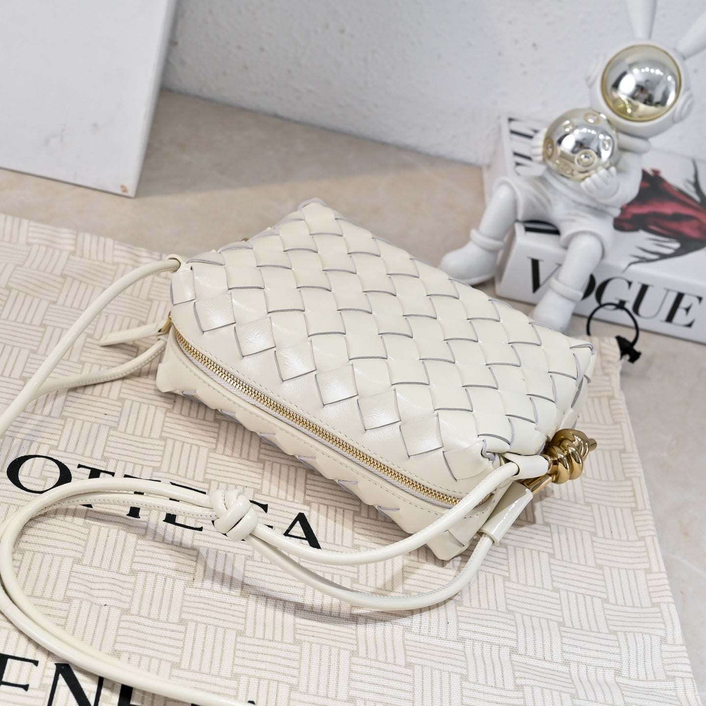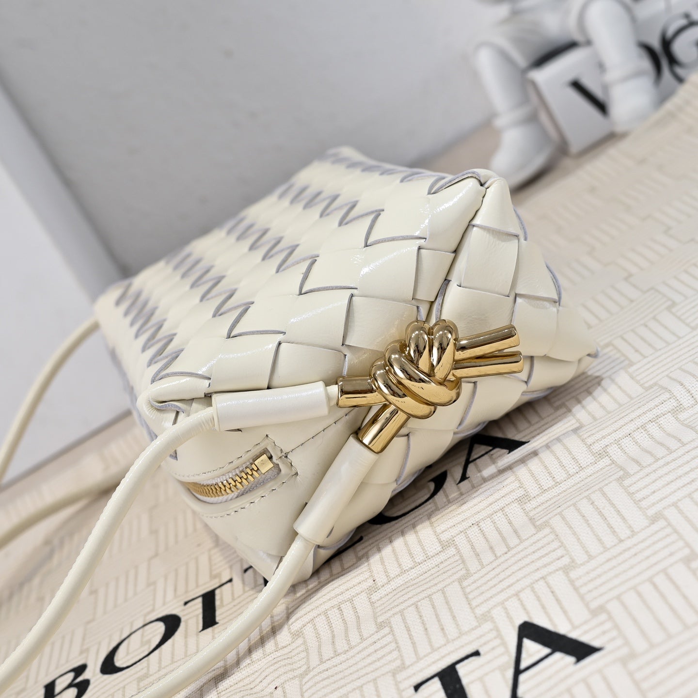 Introducing the Botteg Veneta Loop Camera Bag, the latest in stylish, cost-effective accessories. Crafted from high-quality wax leather, this bag features a large woven texture and thoughtful design elements such as a secure zipper and decorative hardware on both sides. The adjustable drawstring allows for a customizable fit, making it perfect for those with a petite frame. This lightweight bag can accommodate all your essentials while remaining fashionable, making it an ideal choice for girls of all ages.