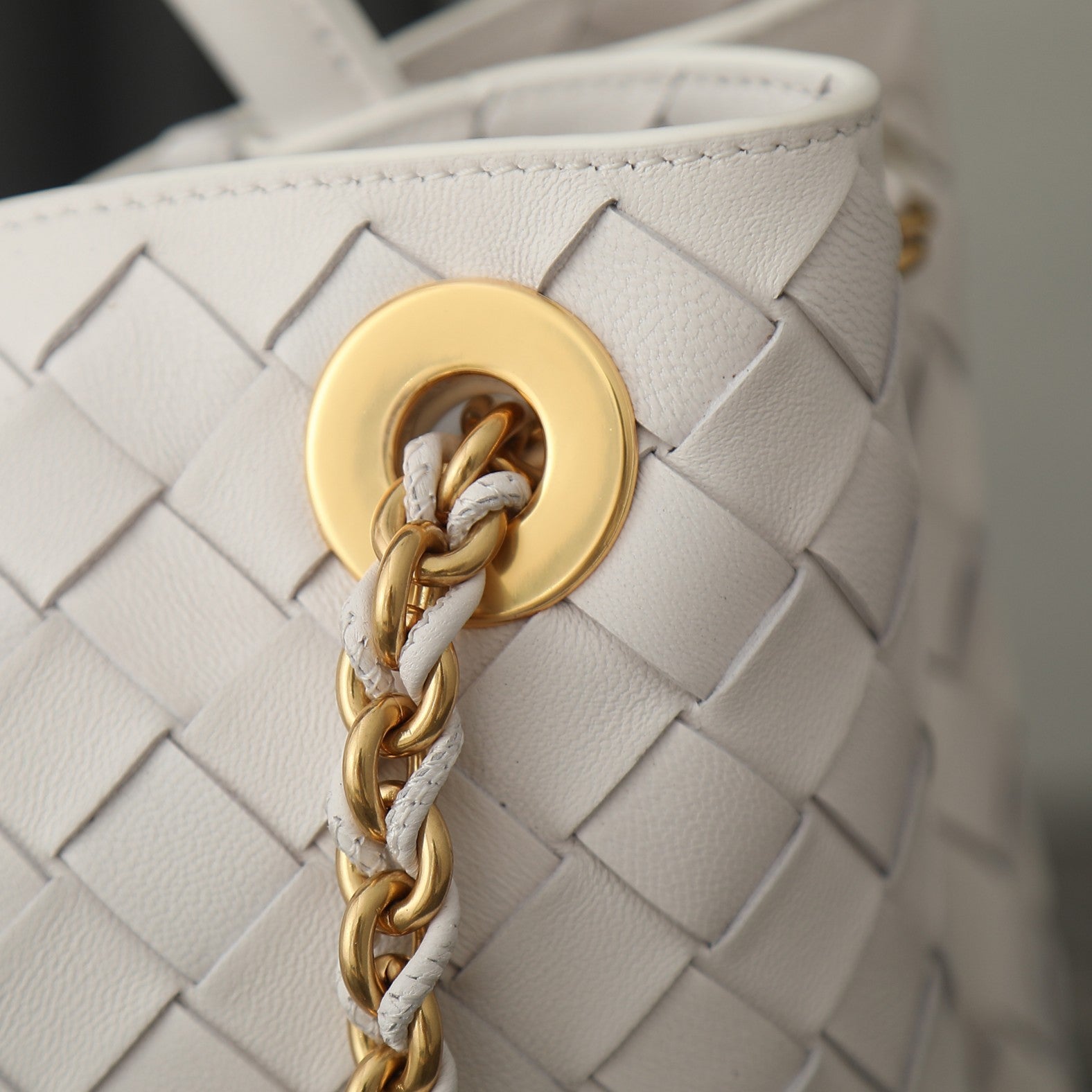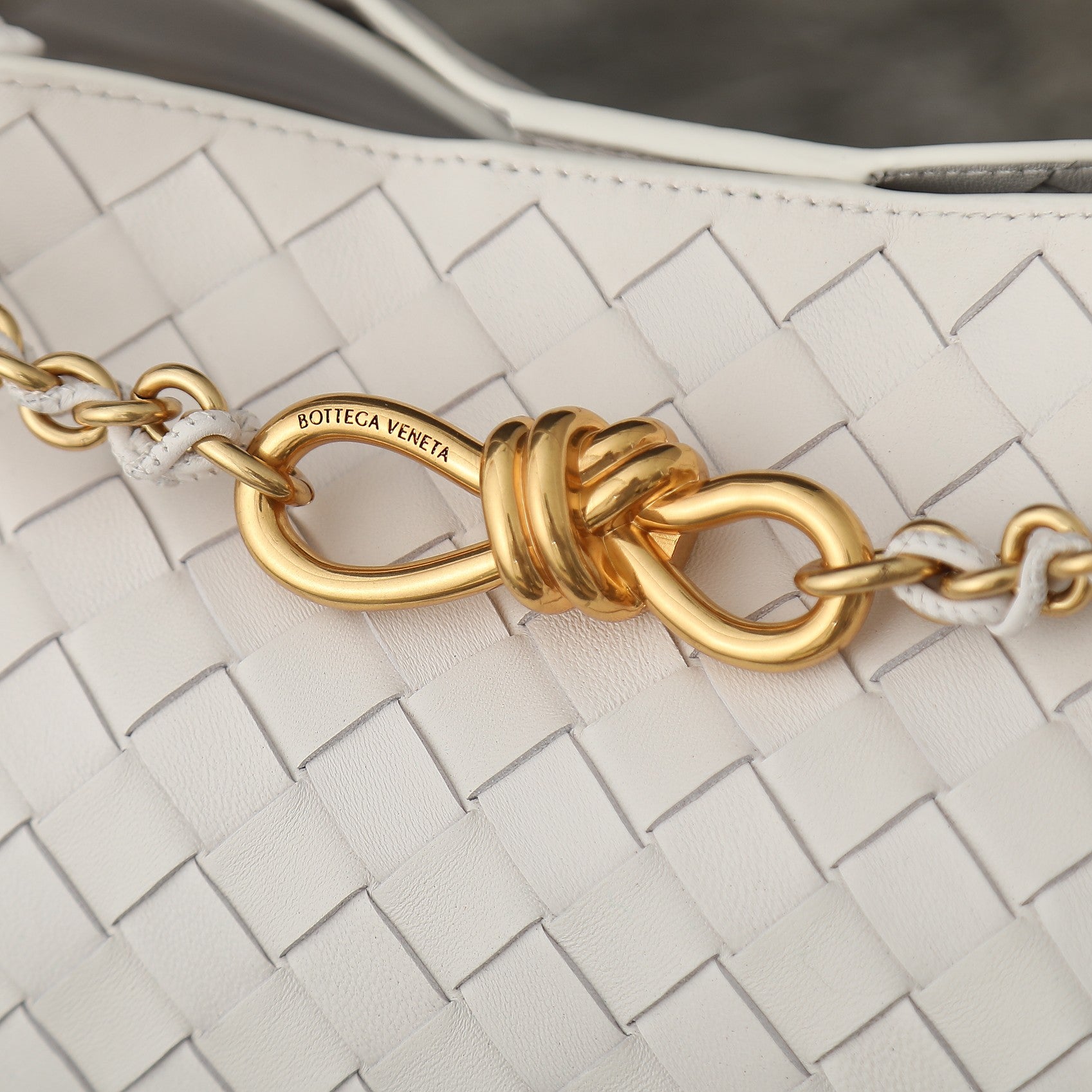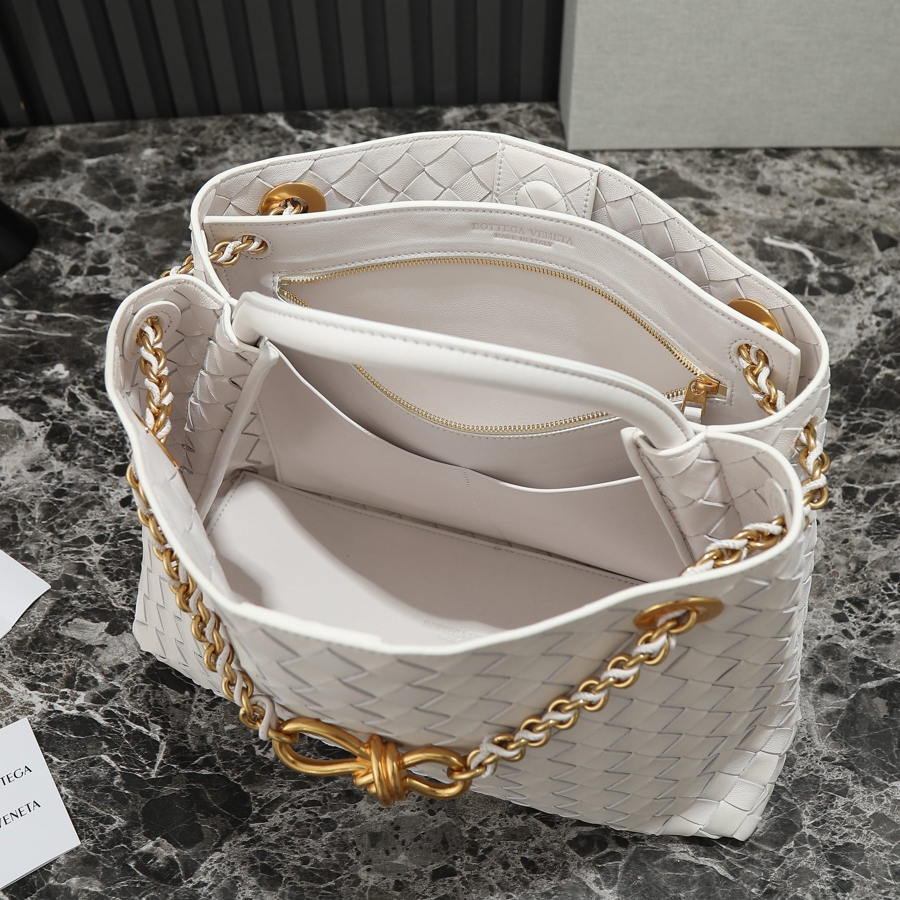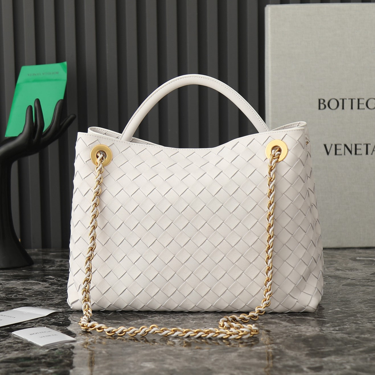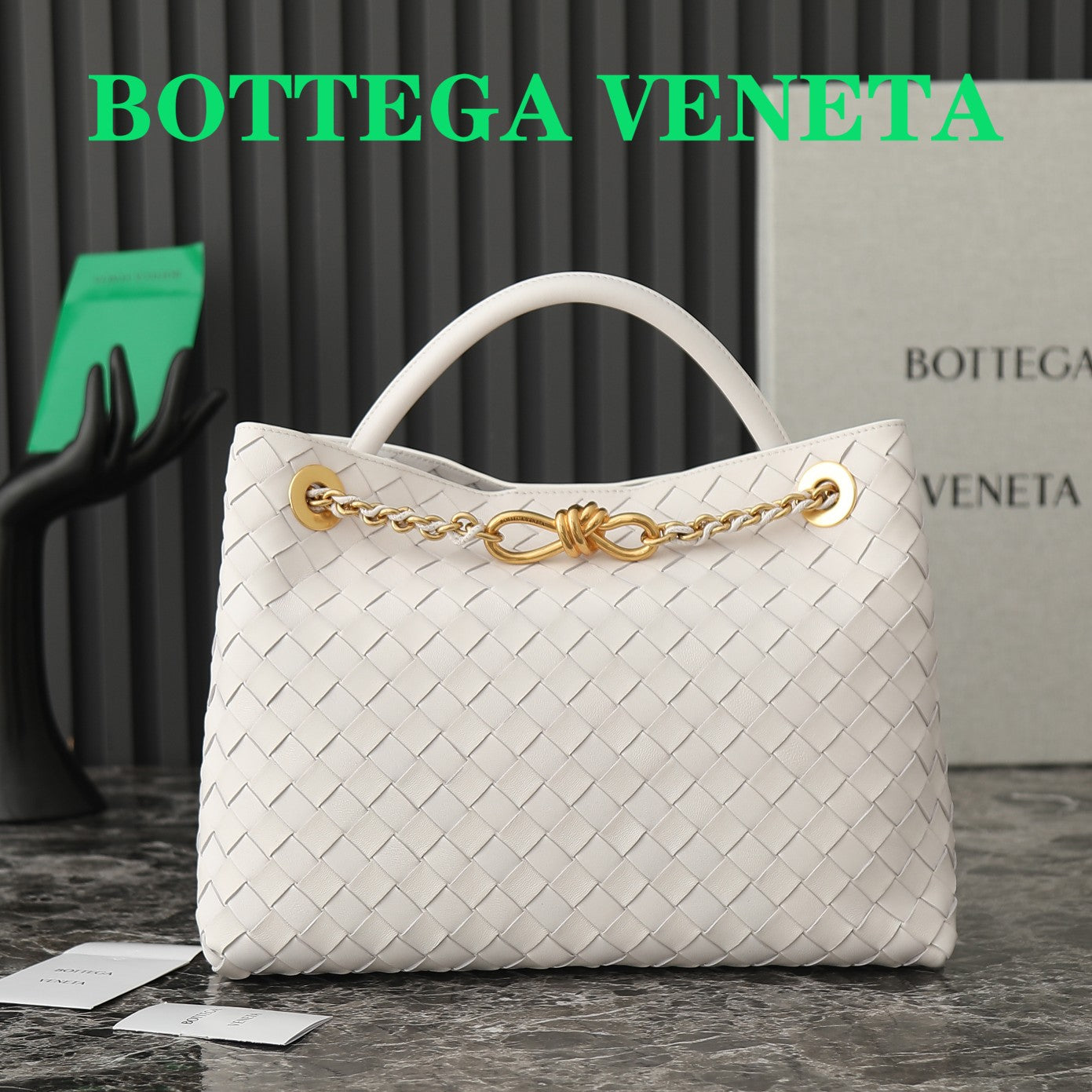 Discover elegance and luxury with the upgraded Bottega Veneta Andiamo Medium Chain Bag. This exquisite piece features a refined chain strap, designed to minimize wear and tear while enhancing comfort. The elegant black leather is beautifully accented with a sophisticated gold chain, creating a striking contrast. Its casual yet chic silhouette, characterized by rounded lines and a minimalist aesthetic, makes it a perfect addition to any wardrobe. With dimensions of 32 cm x 24 cm x 12 cm, this bag effortlessly combines functionality with high-end style. Elevate your accessory game with the Andiamo Chain Bag, a true reflection of timeless sophistication. Model number: 786009.