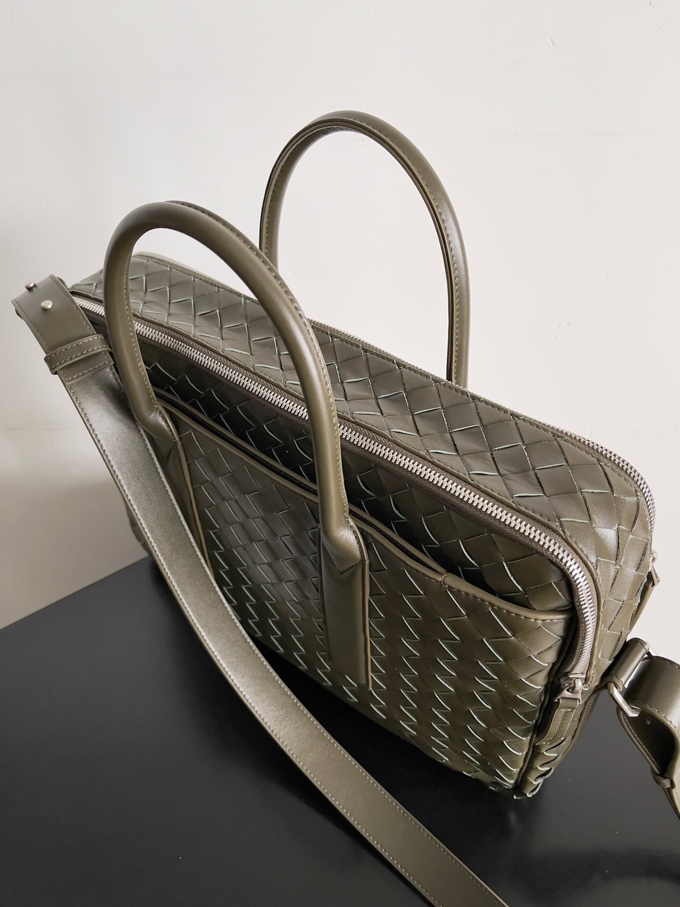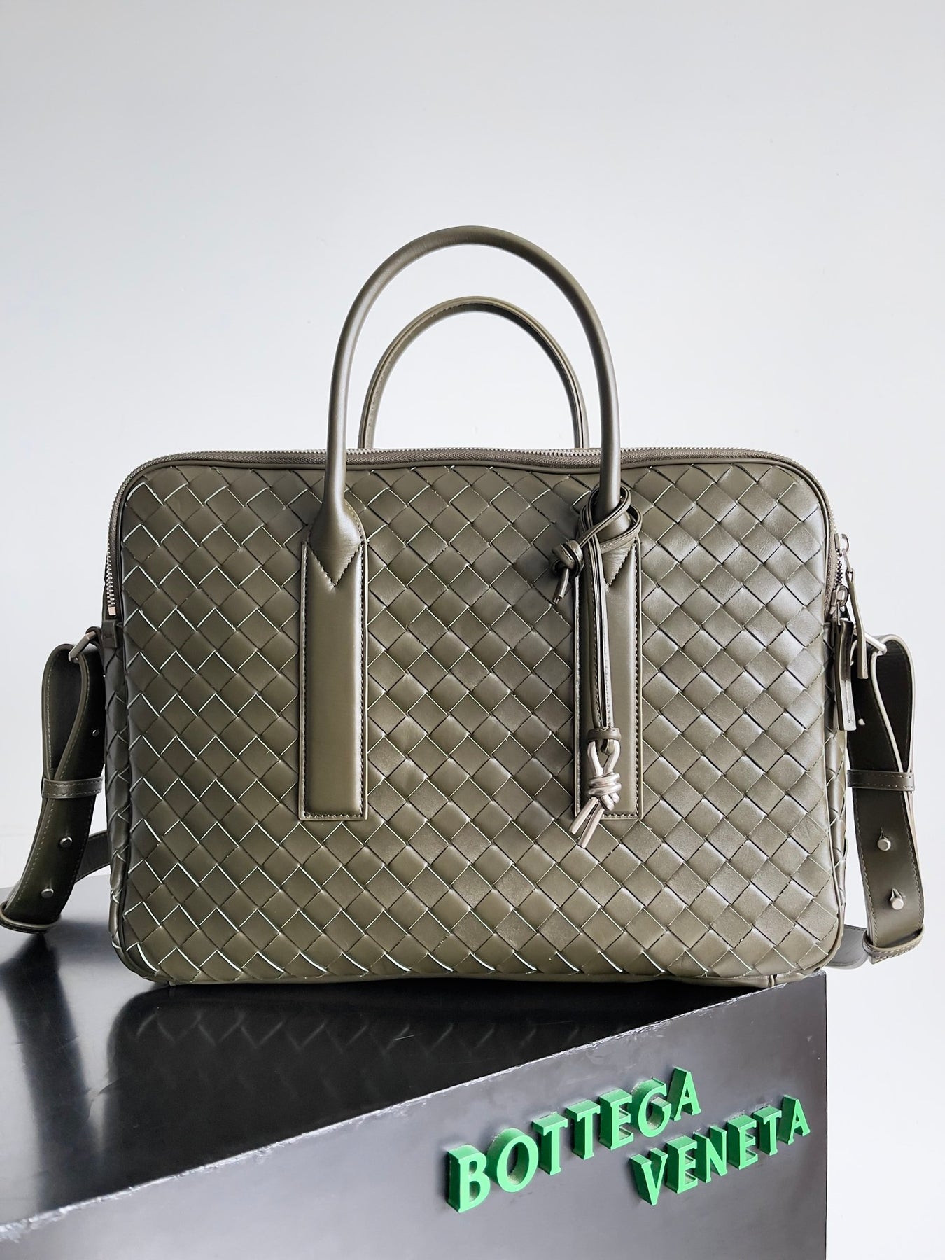 The adjustable shoulder straps are designed for comfort, ensuring ease of wear even during extended periods. With dimensions of 39 x 28.5 x 8 cm, this spacious briefcase offers ample room for your essentials while maintaining a sleek and professional appearance. Elevate your professional attire with this versatile accessory from Bottega Veneta.