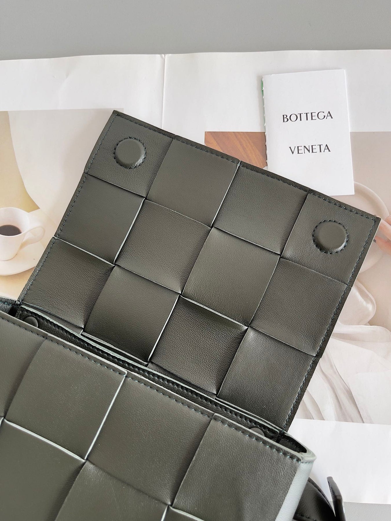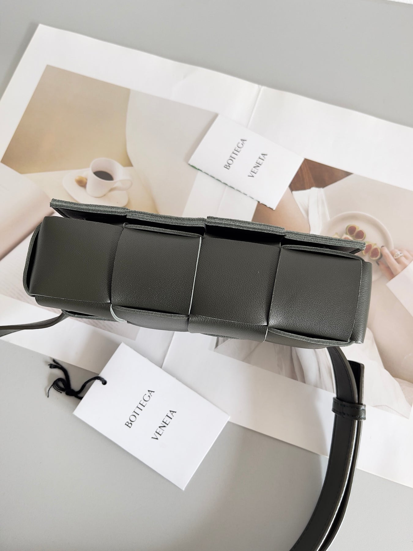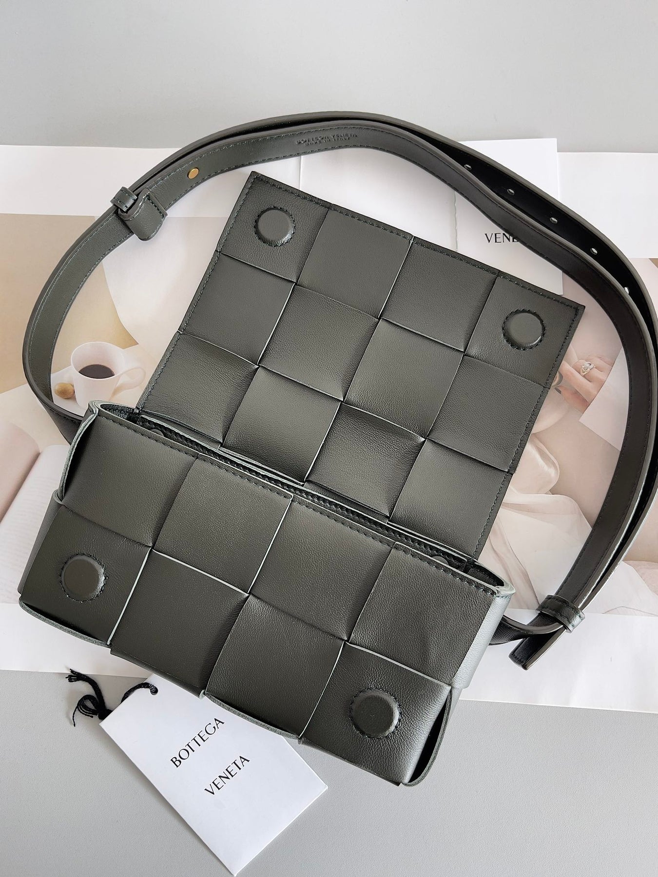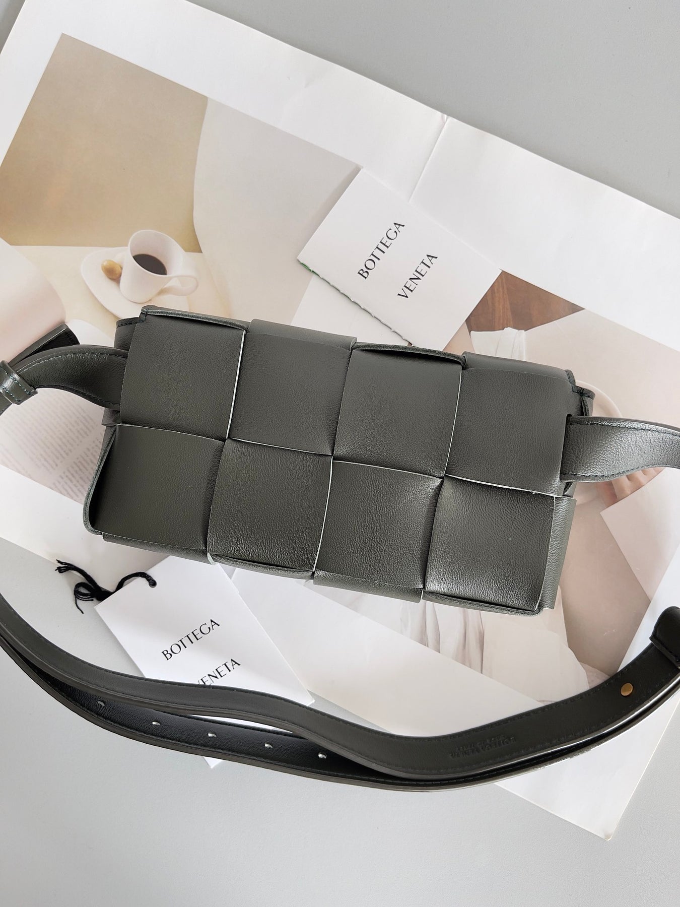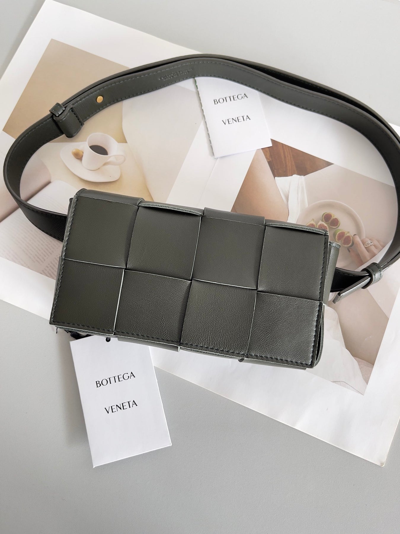 Discover the enchanting charm of the Bottega Veneta Mini Cassette Belt Bag in Field Green. Crafted from premium sheepskin and featuring the signature hand-woven design, this stylish waist bag combines functionality and elegance. Measuring 9.5 x 17.5 x 5 cm, it's perfect for storing your essentials while adding a touch of sophistication to any outfit. The belt bag comes complete with full packaging, making it an ideal gift for yourself or a loved one. Elevate your accessory game with a piece that radiates charm and style.