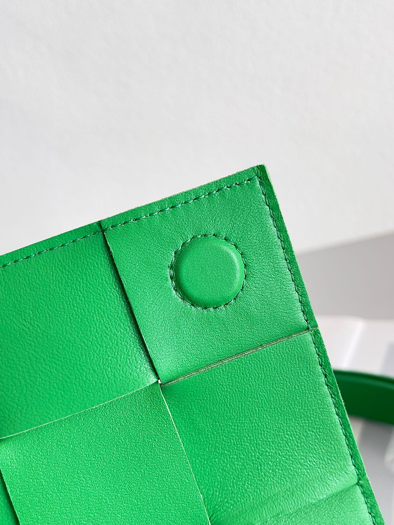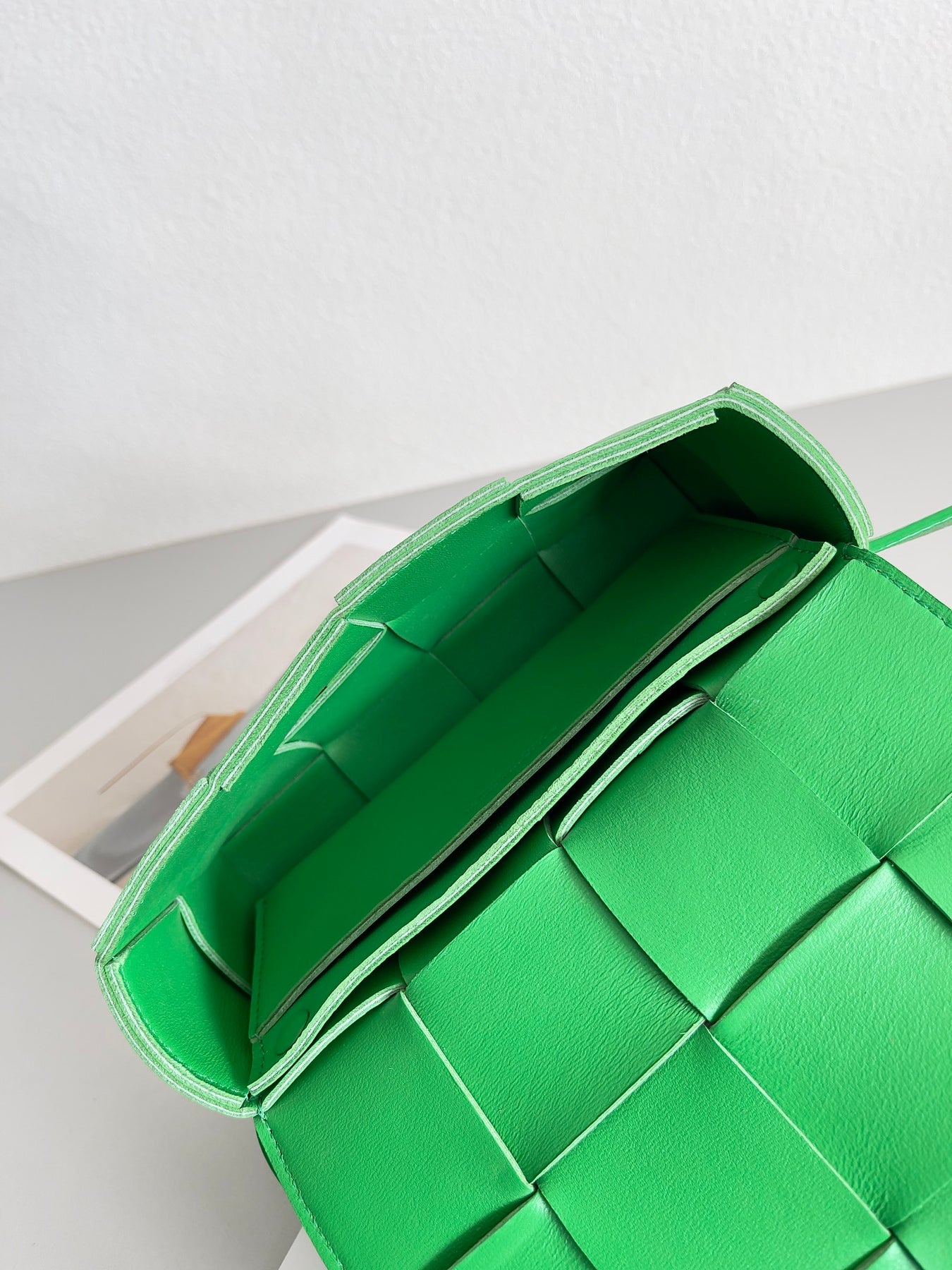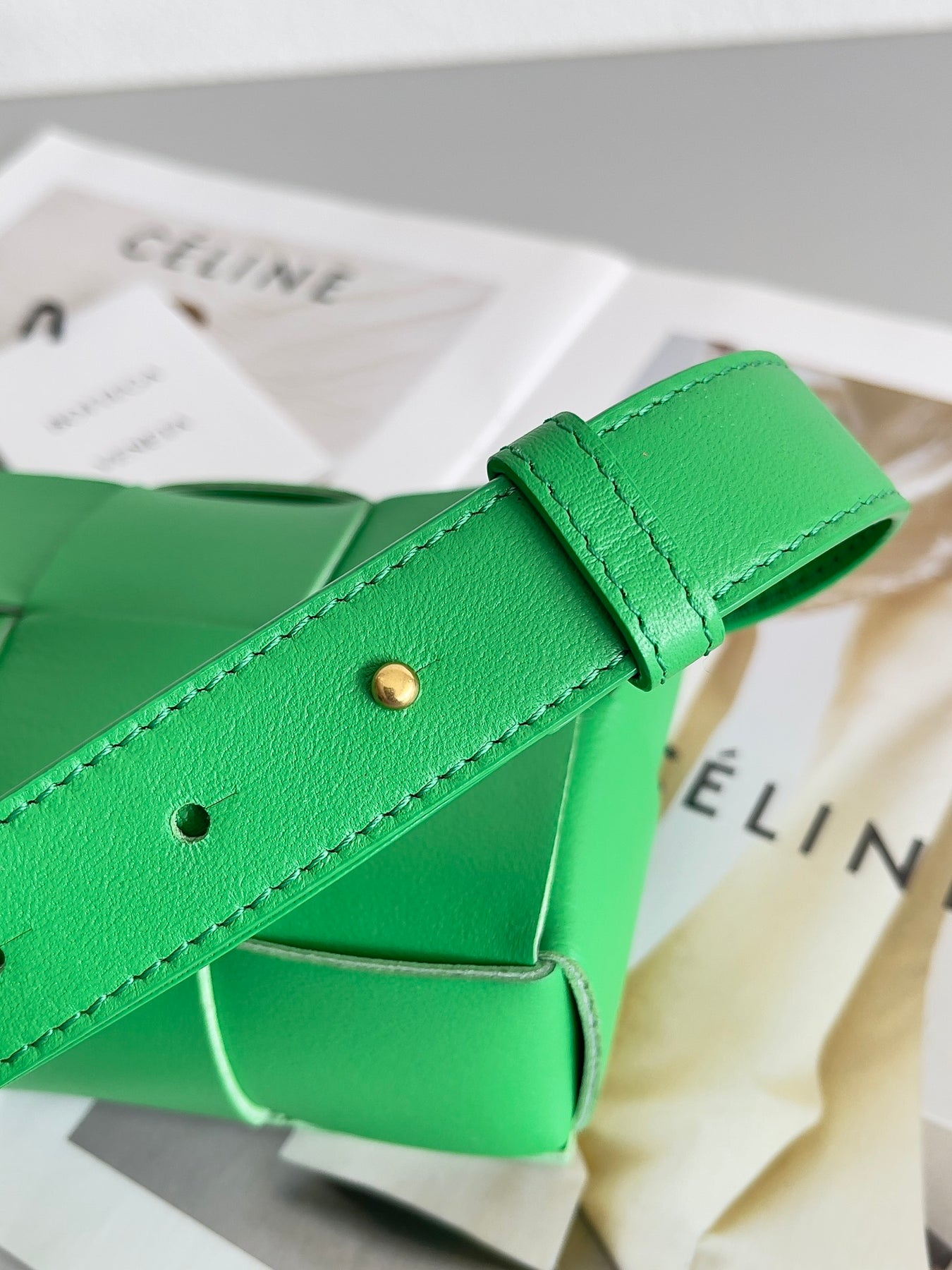 Introducing the Bottega Veneta Mini Cassette Belt Bag in a vibrant parrot green. This charming waist bag is expertly hand-woven from premium sheepskin, showcasing an eye-catching design that effortlessly blends style and functionality. Its compact dimensions (9.5 x 17.5 x 5 cm) make it the perfect accessory for any occasion. Elevate your wardrobe with this delightful bag that is sure to turn heads. Each purchase includes full packaging for a luxurious unboxing experience. Model number: 639367.