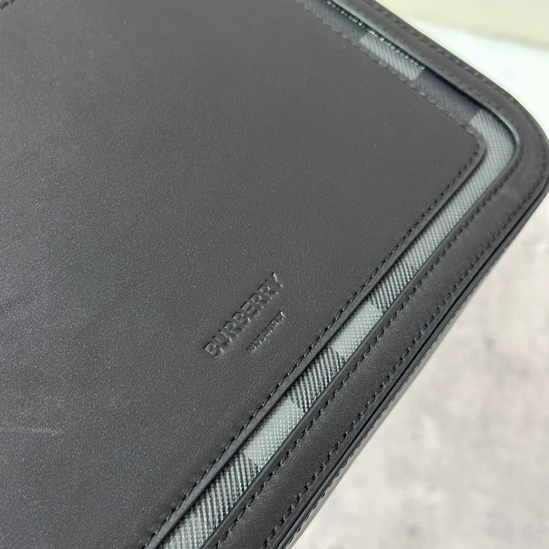 Keep your essentials organized with one external slip pocket and one internal slip pocket, while the top flap with magnetic closure ensures secure access. The hand-painted lacquered edges add a refined touch, and the 3D Burberry lettering logo on the front enhances its luxurious appeal. Embrace style and functionality with this timeless accessory.