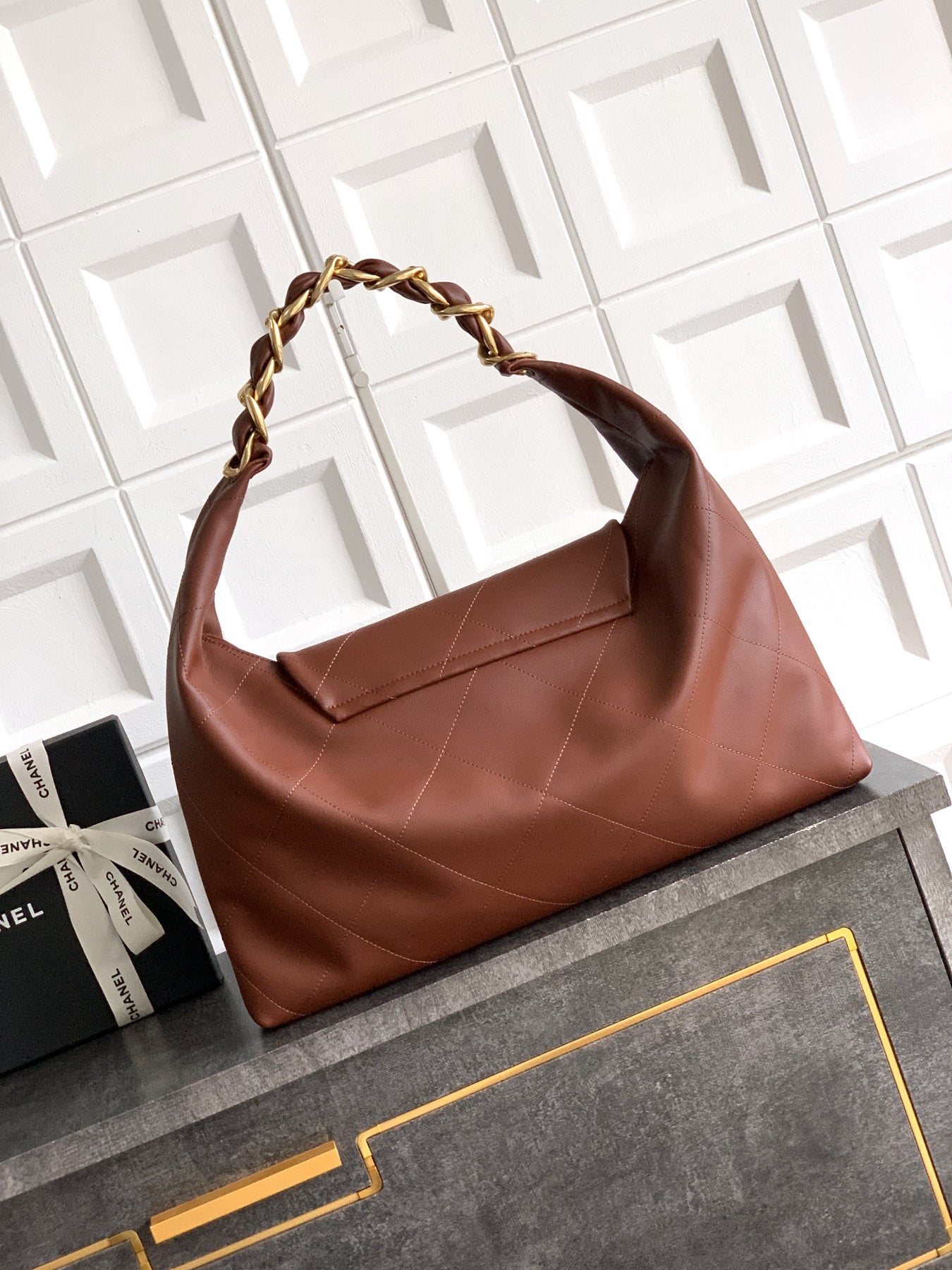 Introducing the Burgundy Oversized Hobo Bag, the perfect blend of style and functionality. Measuring 43×33×7 CM, this chic bag is crafted from glossy calf leather, offering a delicate and soft touch. Featuring an eye-catching thick gold chain, this versatile hobo bag effortlessly caters to both men and women, making it an ideal accessory for any occasion.