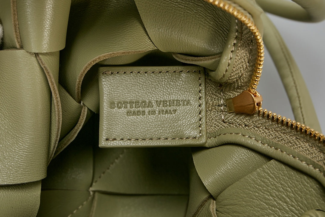 Crafted from premium woven leather in a beautiful travertine green, the bag is accented with elegant gold-finish hardware and lined with soft composite sheepskin for added luxury.