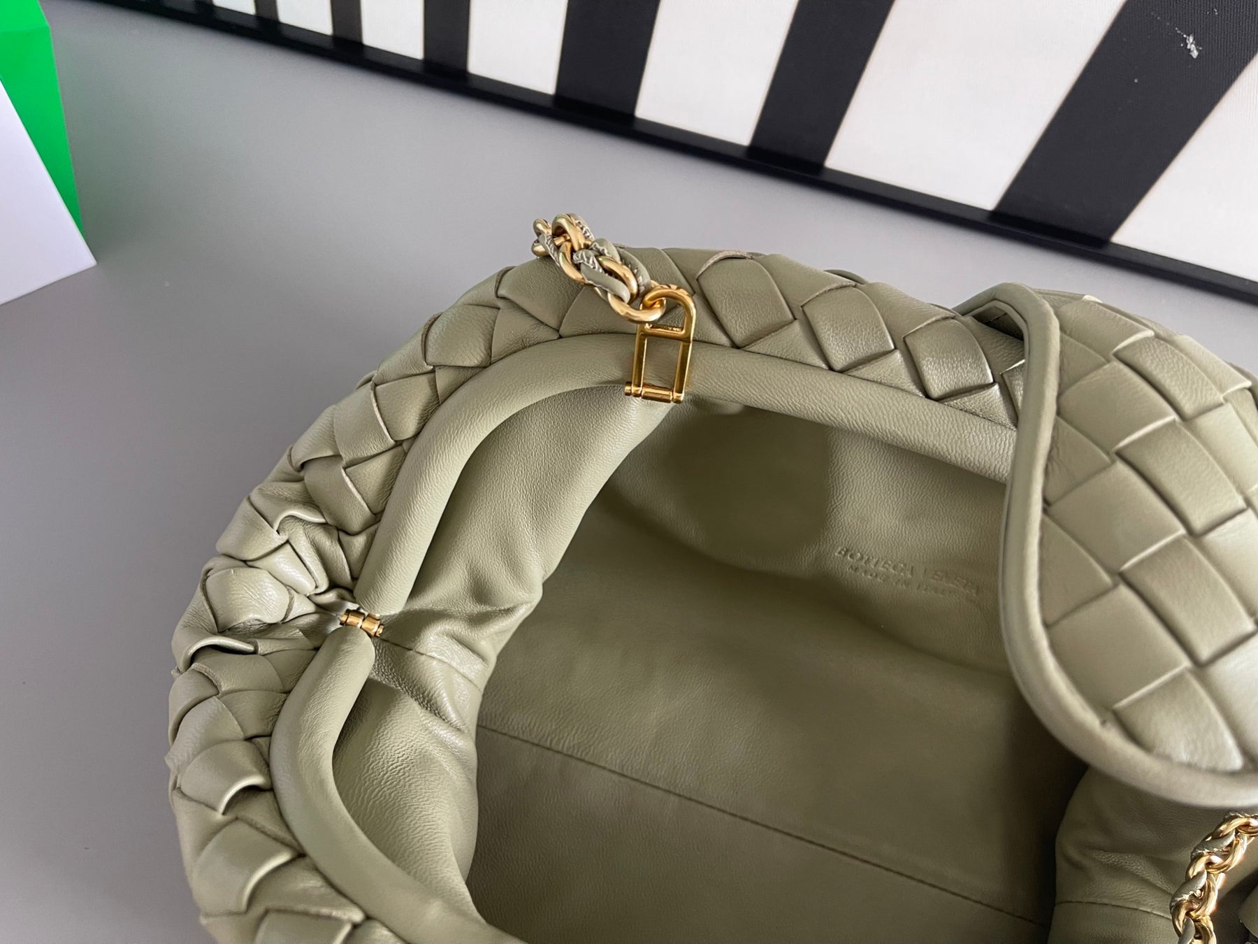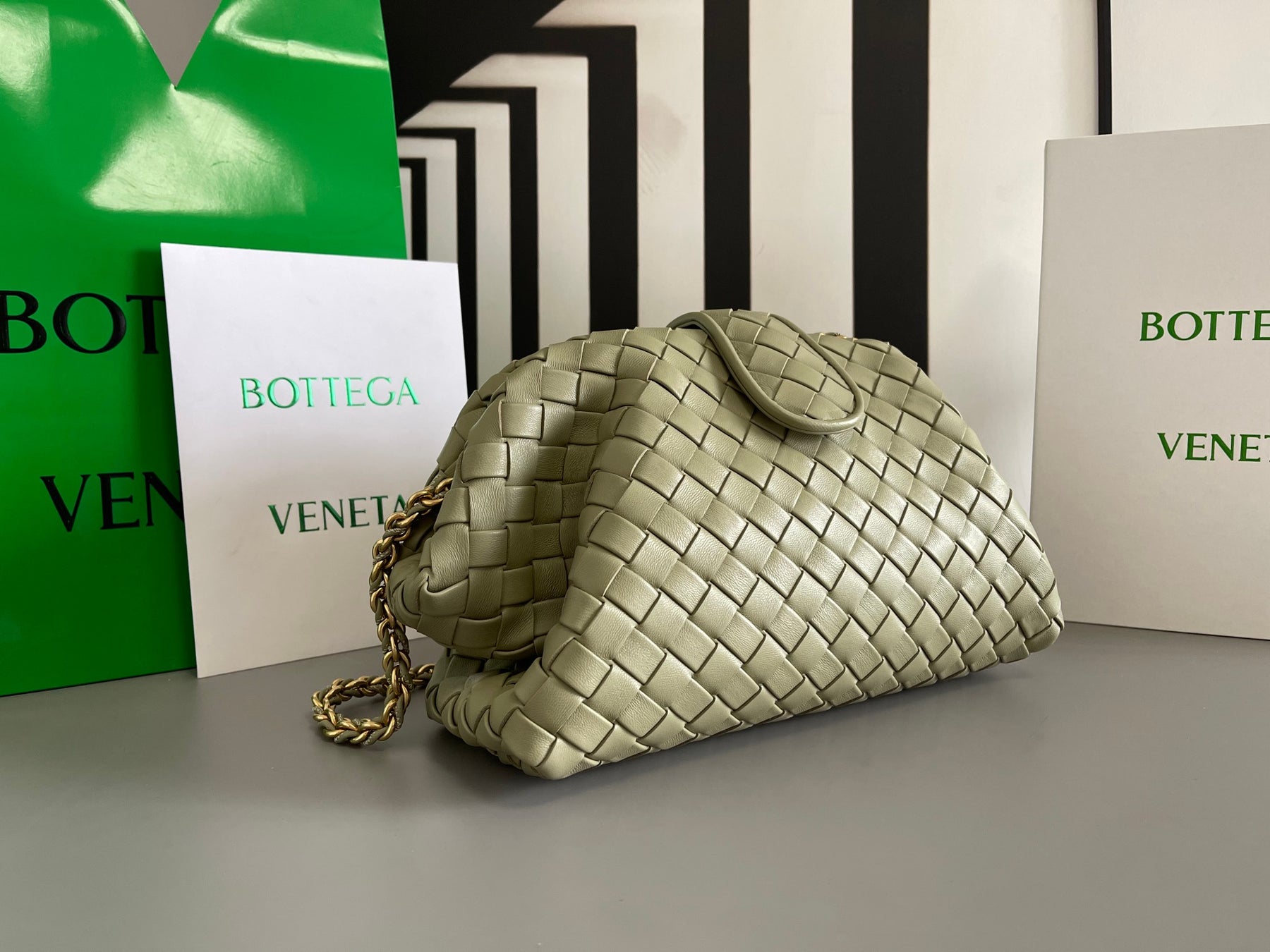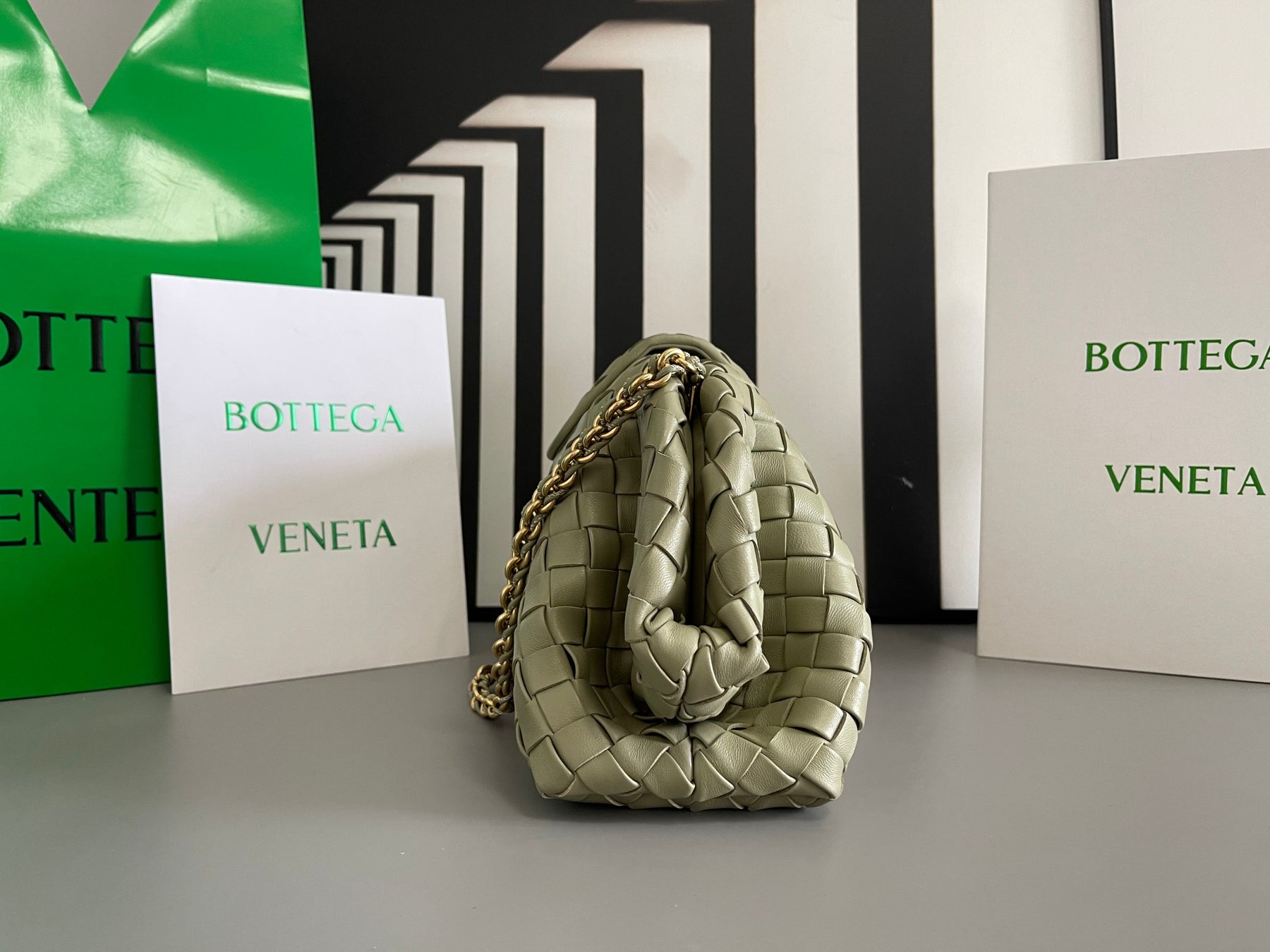 Crafted from exquisite padded intrecciato woven leather, this Teen size clutch is designed for the modern woman who desires style and sophistication. It features a single compartment with a secure magnetic flap closure, and is complemented by a chic leather-woven metal chain shoulder strap for added practicality.