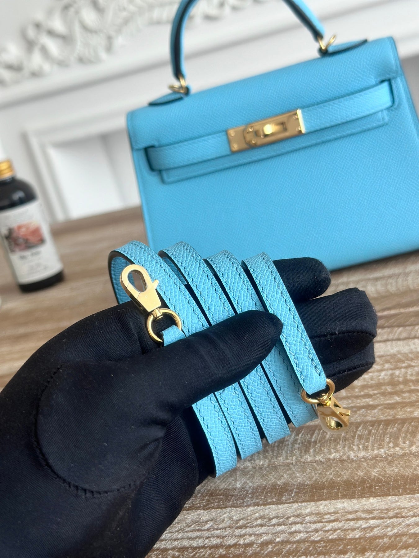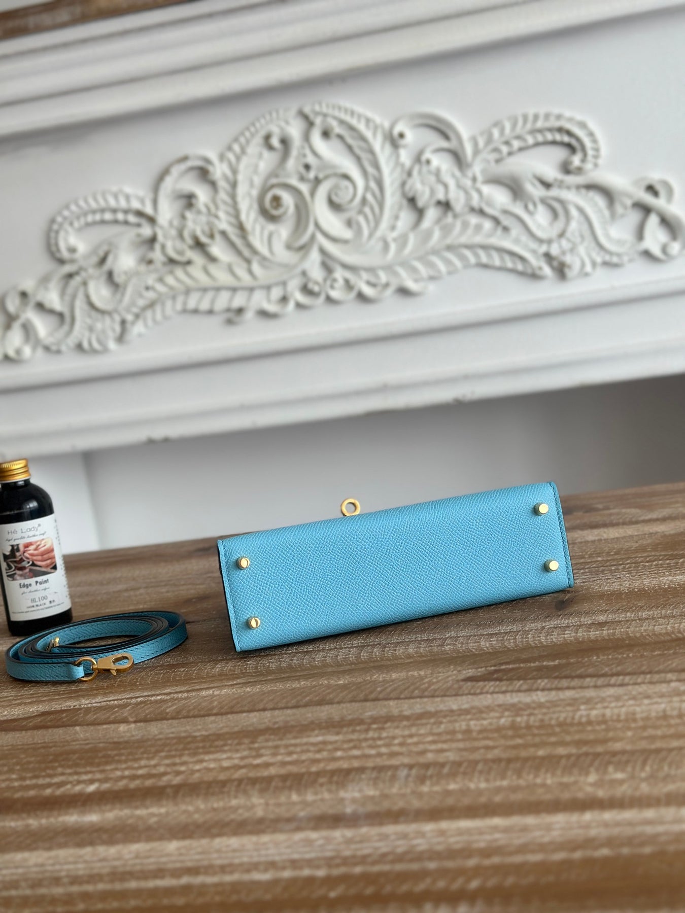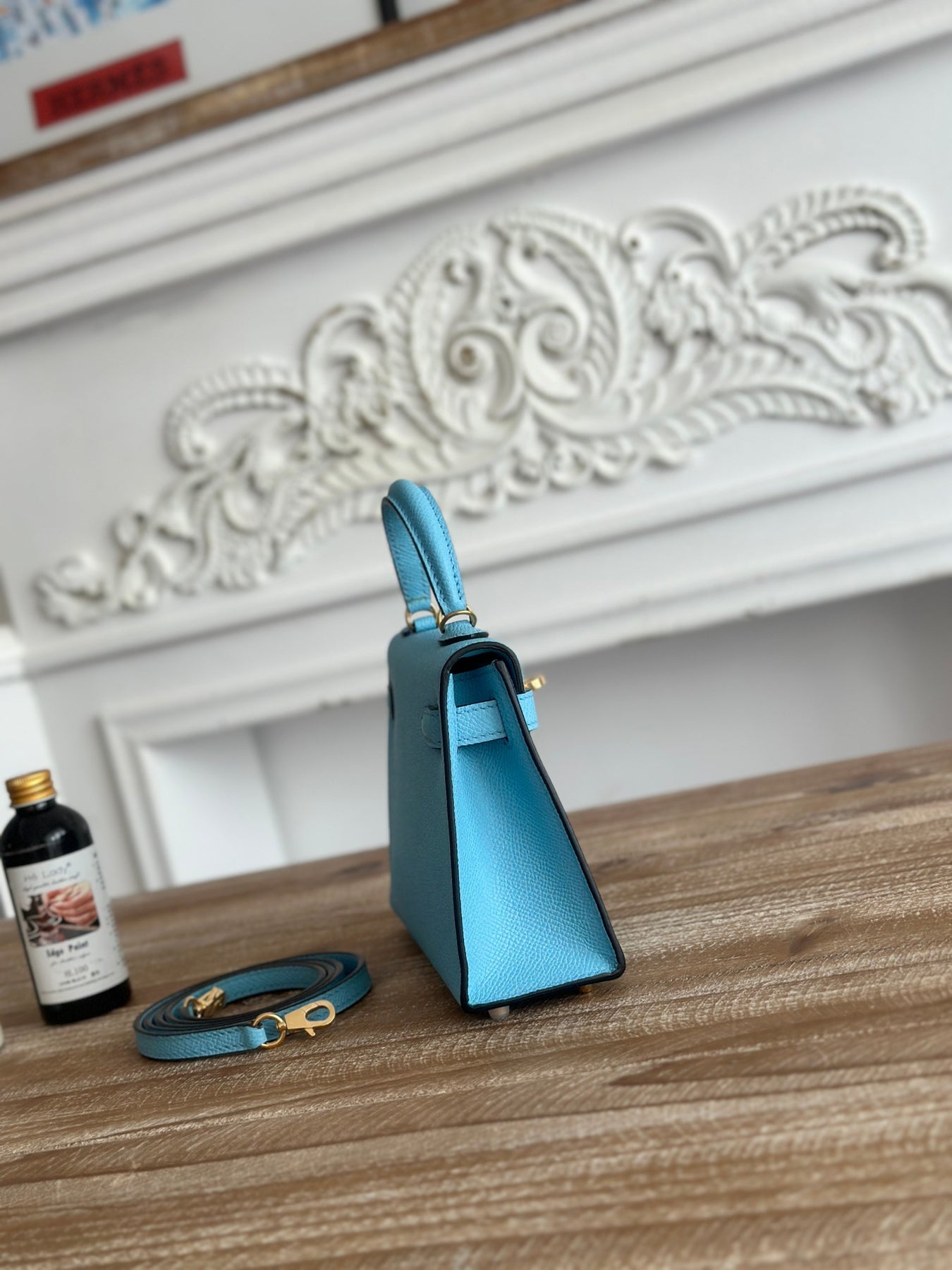 Discover the elegance of our Semi-Handmade Kelly Mini Bag, now in a stunning candy blue. This second-generation design features premium imported epsom leather for a luxurious feel and durability. Meticulously crafted with semi-handmade wax thread, this chic accessory measures 19cm, making it the perfect companion for both casual outings and special occasions. Enhance your style with this timeless piece that captures attention effortlessly.