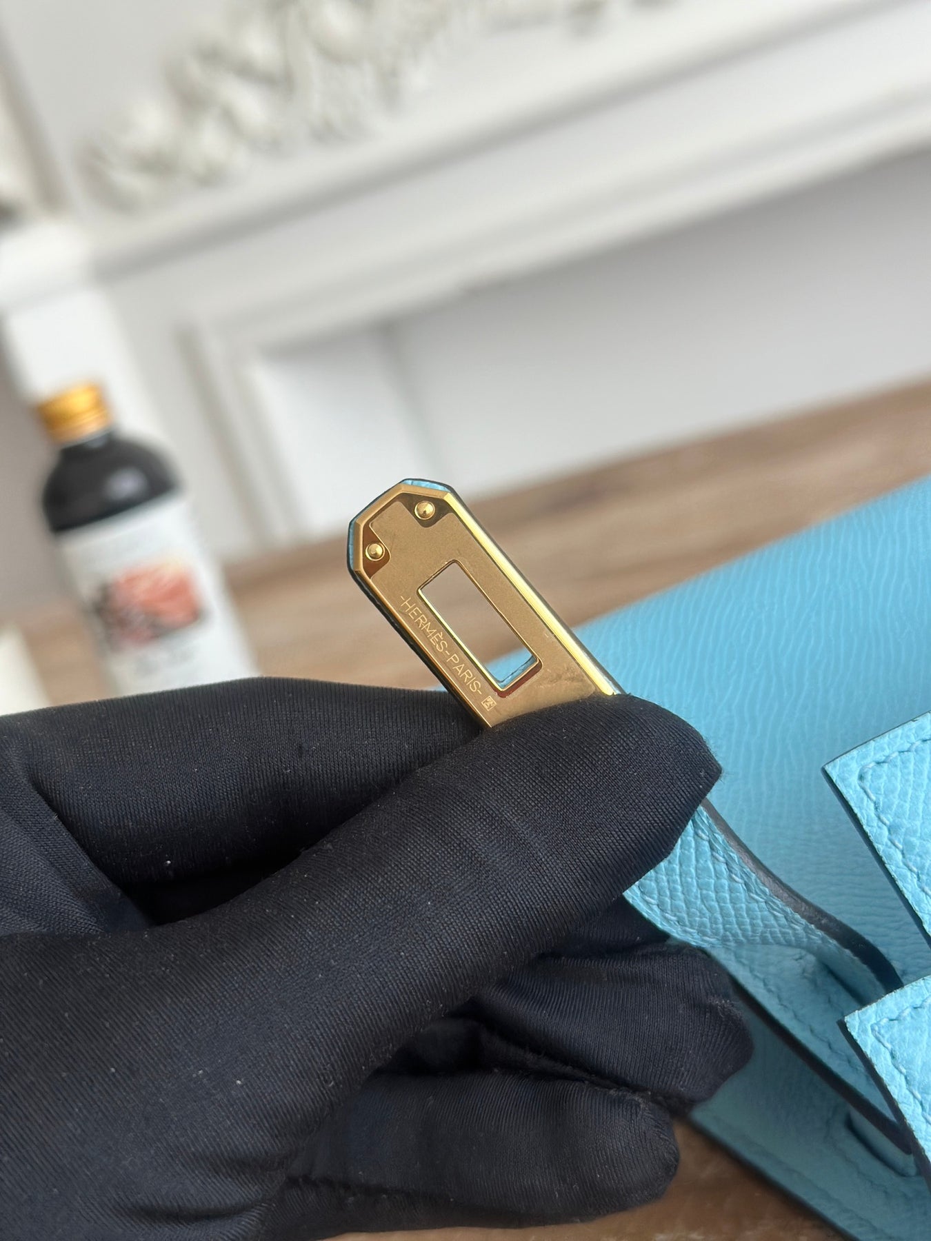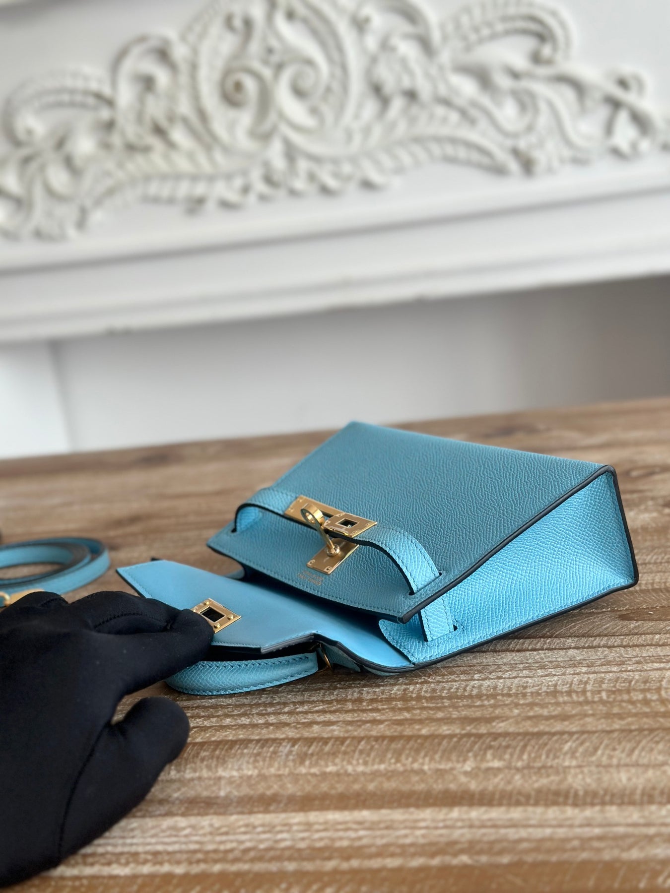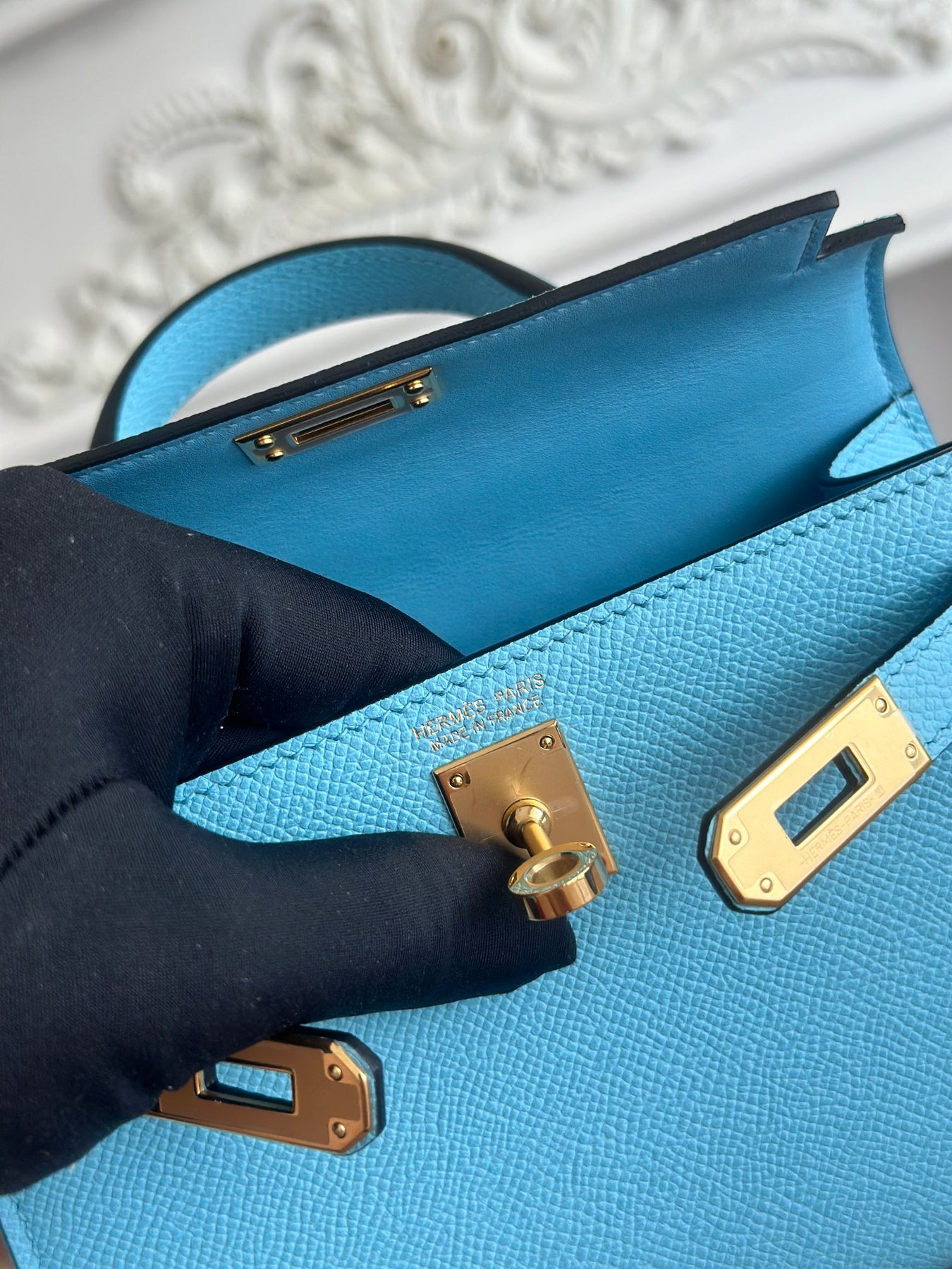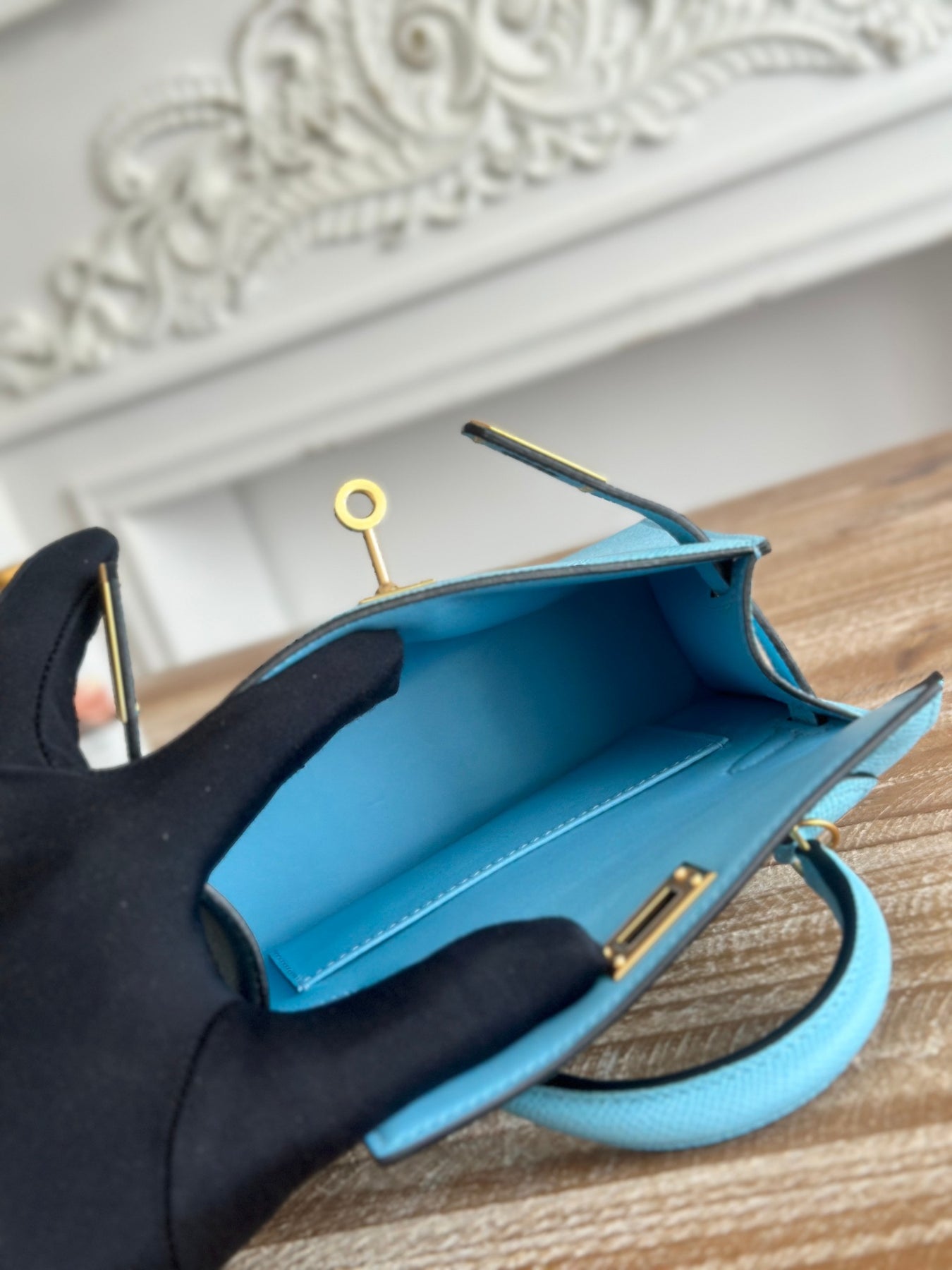 Discover the elegance of our Semi-Handmade Kelly Mini Bag, now in a stunning candy blue. This second-generation design features premium imported epsom leather for a luxurious feel and durability. Meticulously crafted with semi-handmade wax thread, this chic accessory measures 19cm, making it the perfect companion for both casual outings and special occasions. Enhance your style with this timeless piece that captures attention effortlessly.