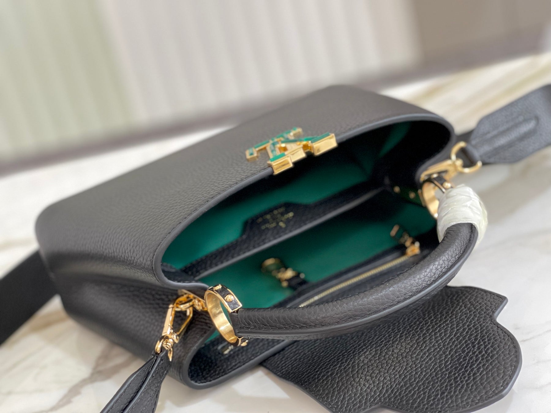 Capucines BB Handbag in Black with Malachite Green Accents