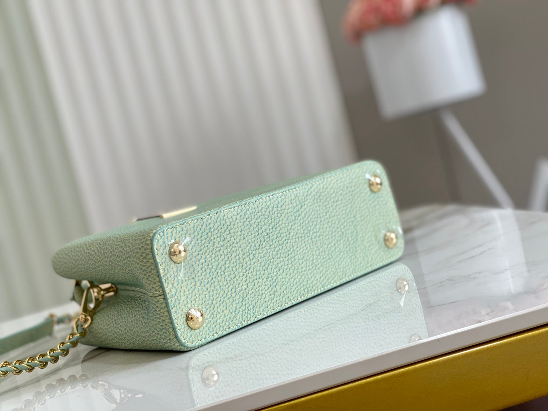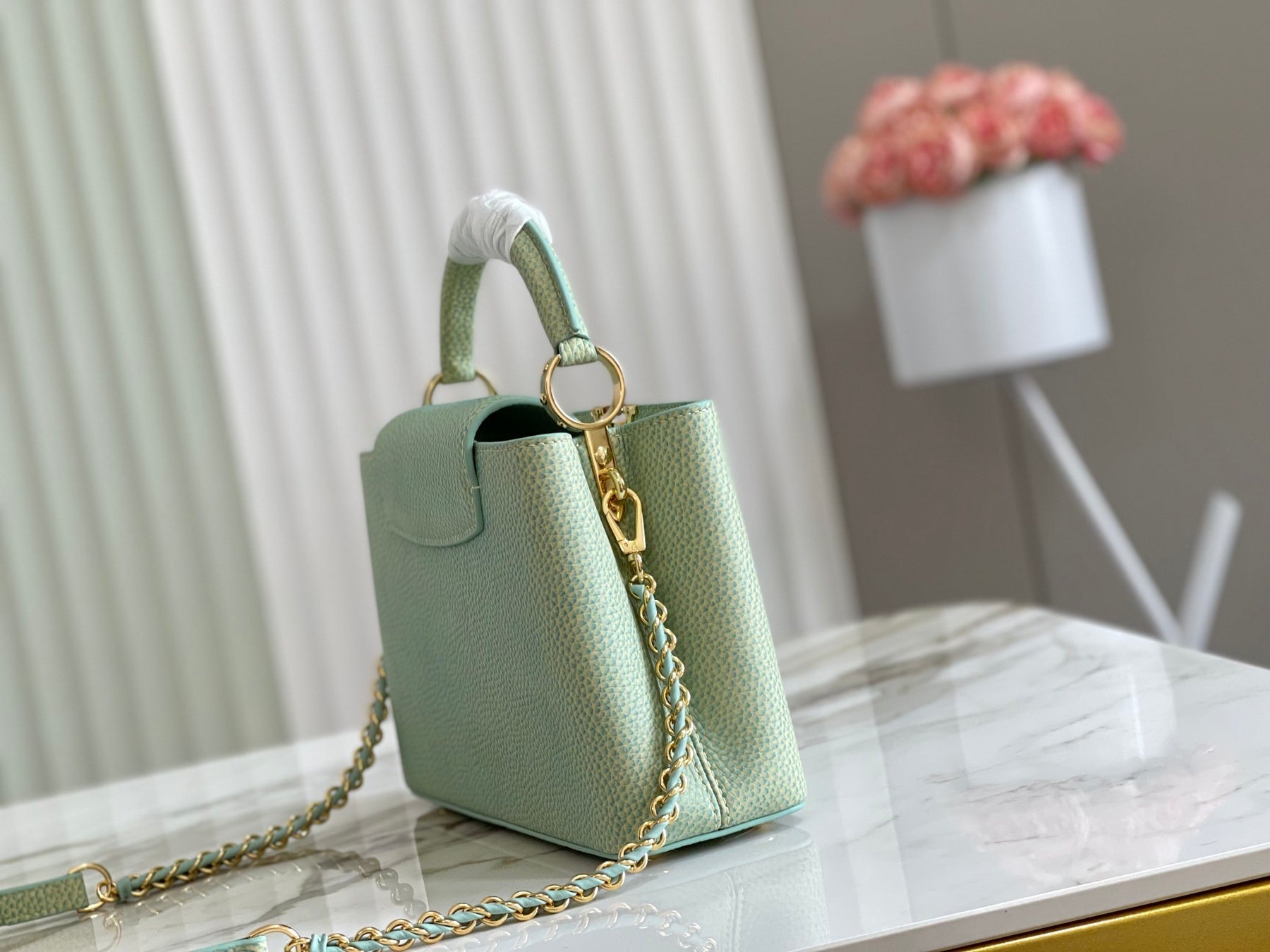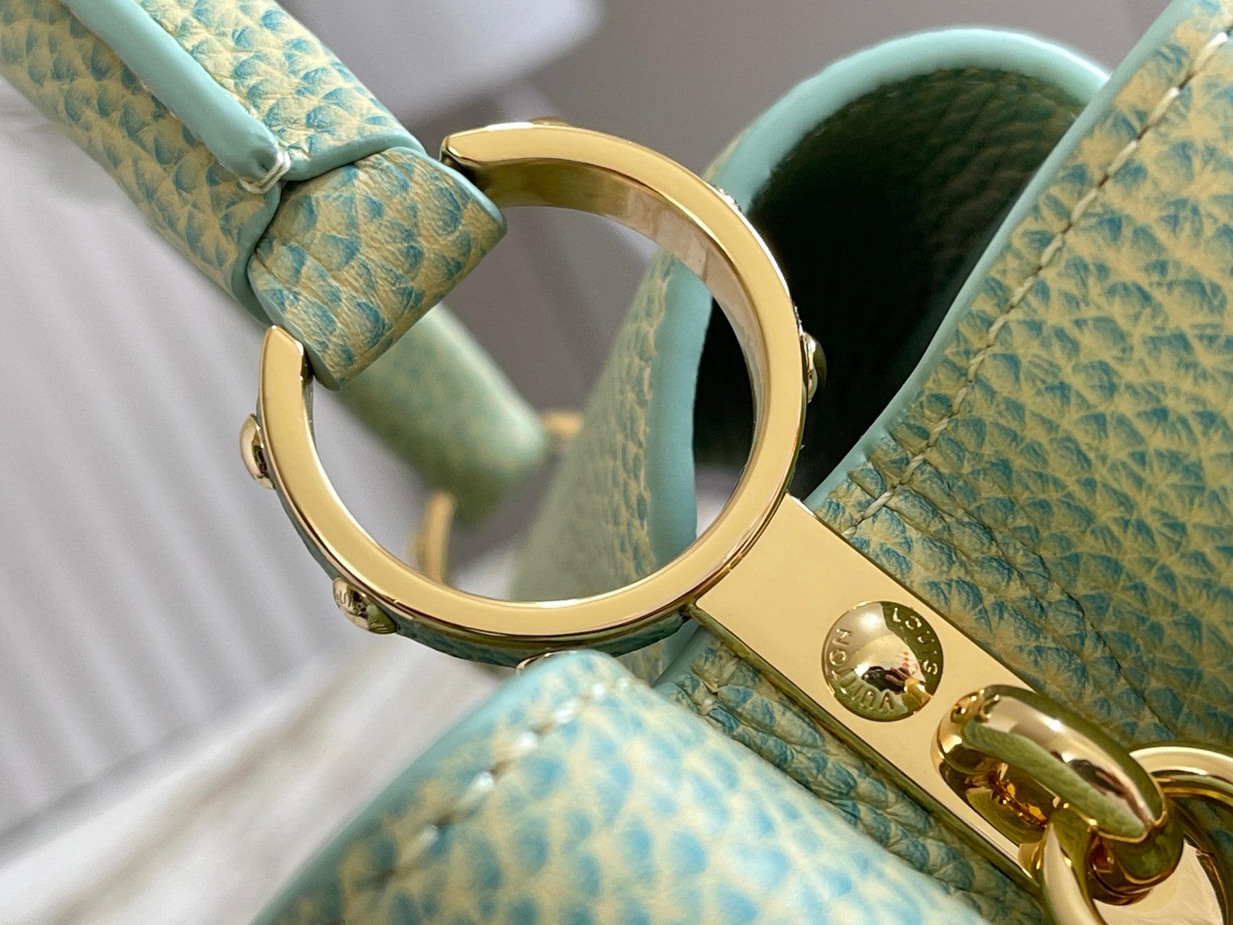 Discover the elegance of the Capucines BB handbag, a stunning new arrival in a vibrant green and yellow color combination. Crafted from luxurious Taurillon leather, this bag features a radiant white mother-of-pearl detail that enhances its visual appeal. The woven leather chain adds a touch of sophistication, while the gentle lines and classic design elements embody a charming aesthetic. Perfectly sized at 27cm x 18cm x 9cm, this handbag is the ideal accessory for any occasion, offering both style and functionality. Elevate your look with this exquisite piece.
