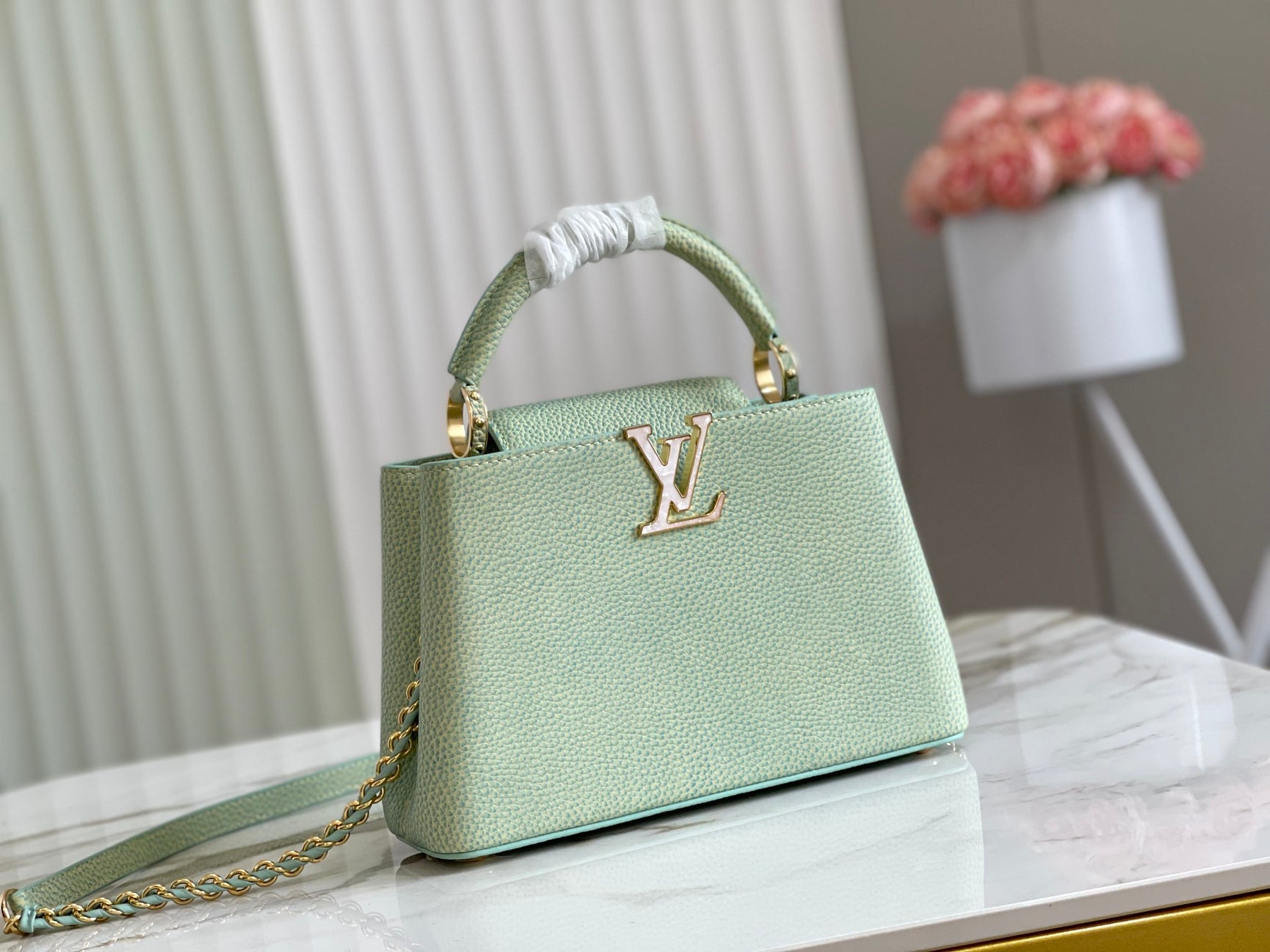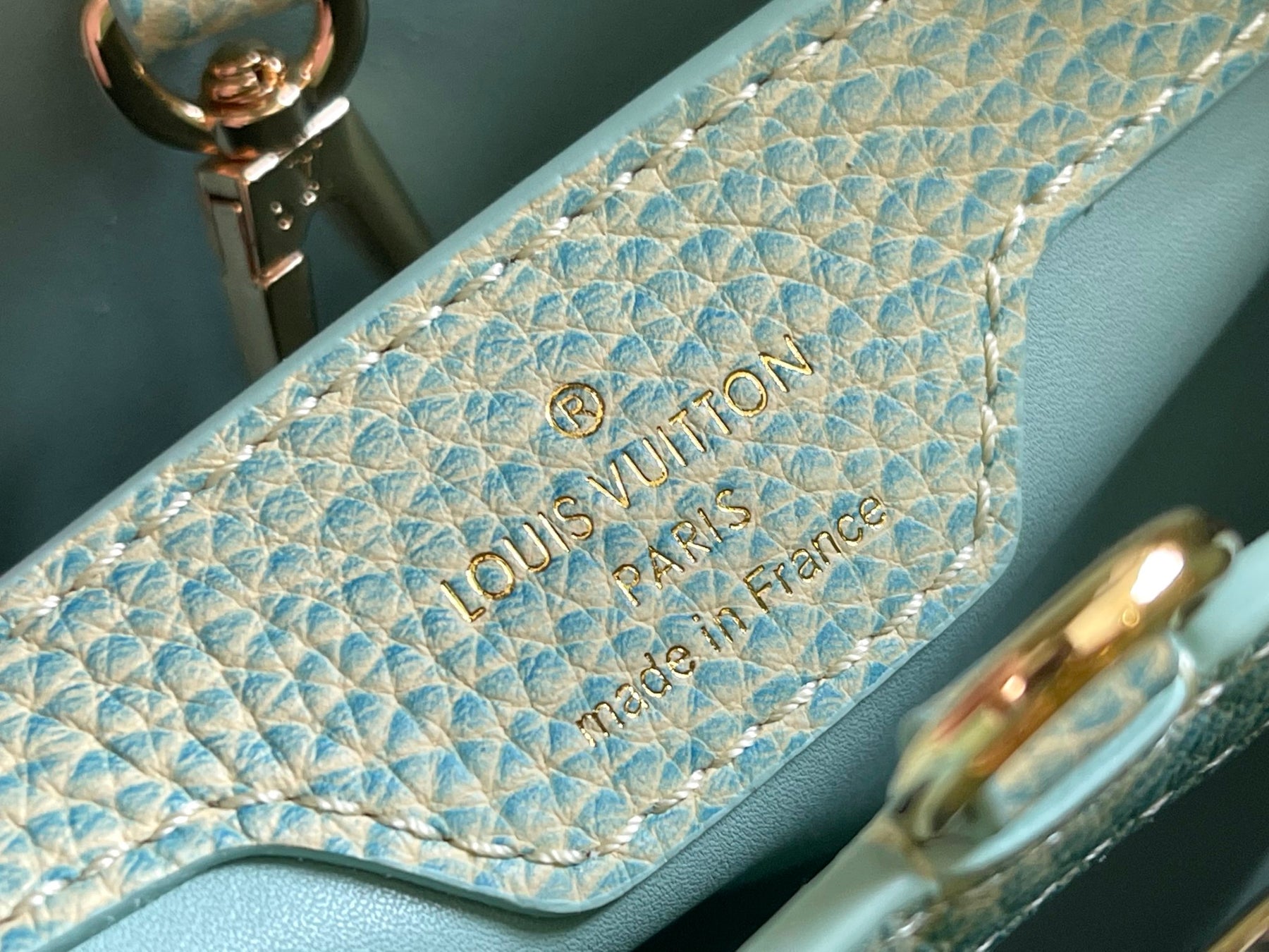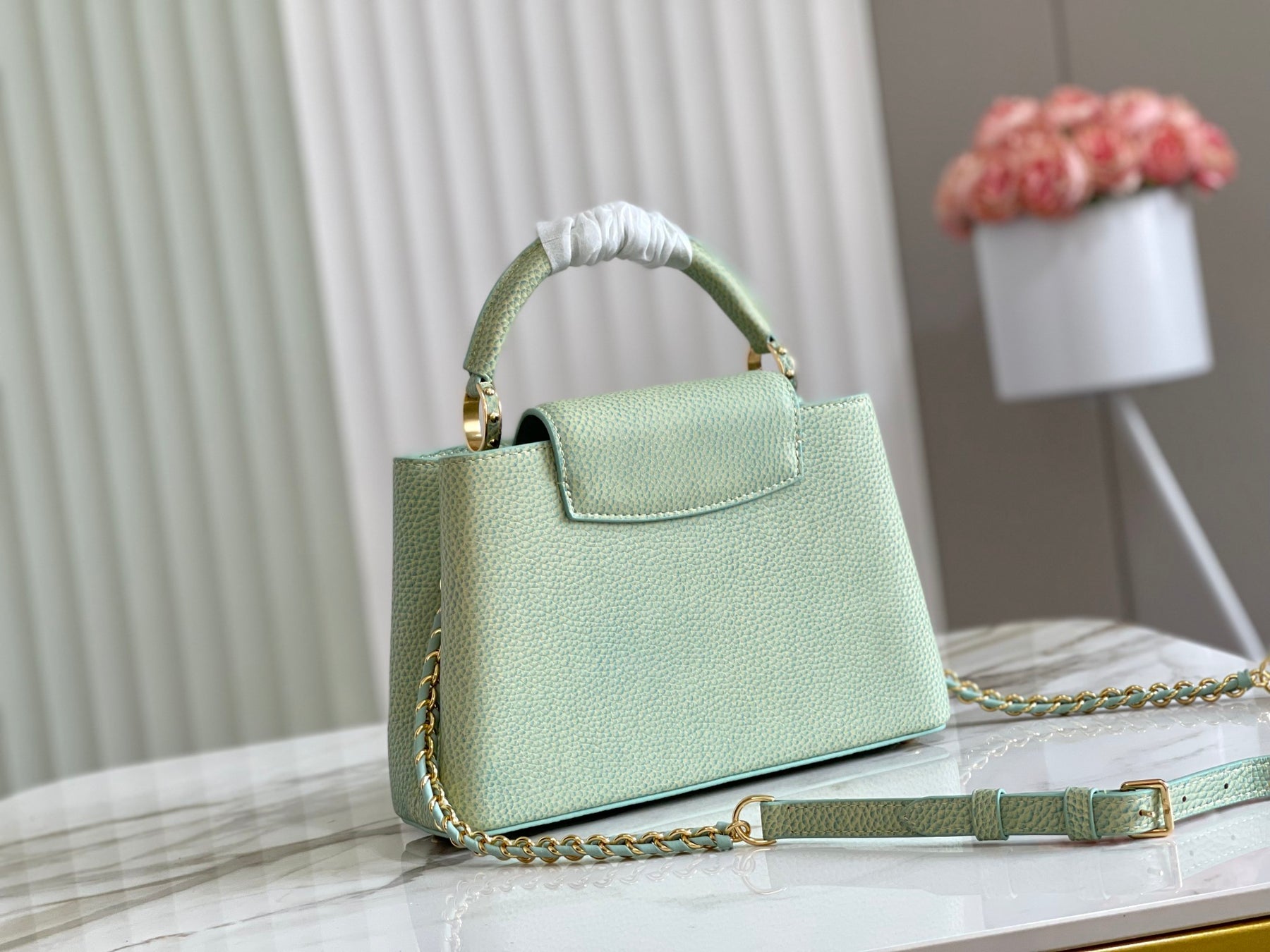 Discover the elegance of the Capucines BB handbag, a stunning new arrival in a vibrant green and yellow color combination. Crafted from luxurious Taurillon leather, this bag features a radiant white mother-of-pearl detail that enhances its visual appeal. The woven leather chain adds a touch of sophistication, while the gentle lines and classic design elements embody a charming aesthetic. Perfectly sized at 27cm x 18cm x 9cm, this handbag is the ideal accessory for any occasion, offering both style and functionality. Elevate your look with this exquisite piece.