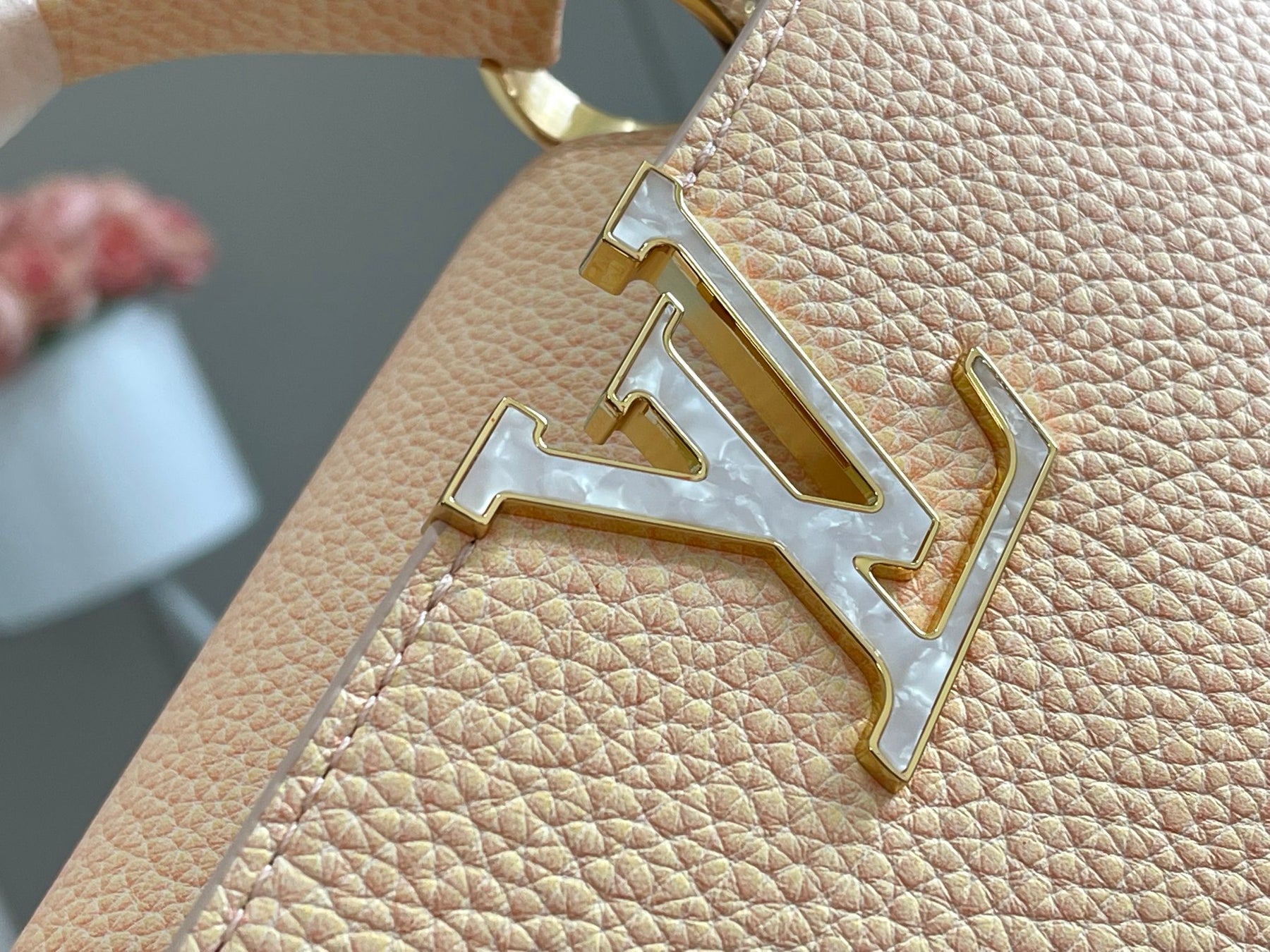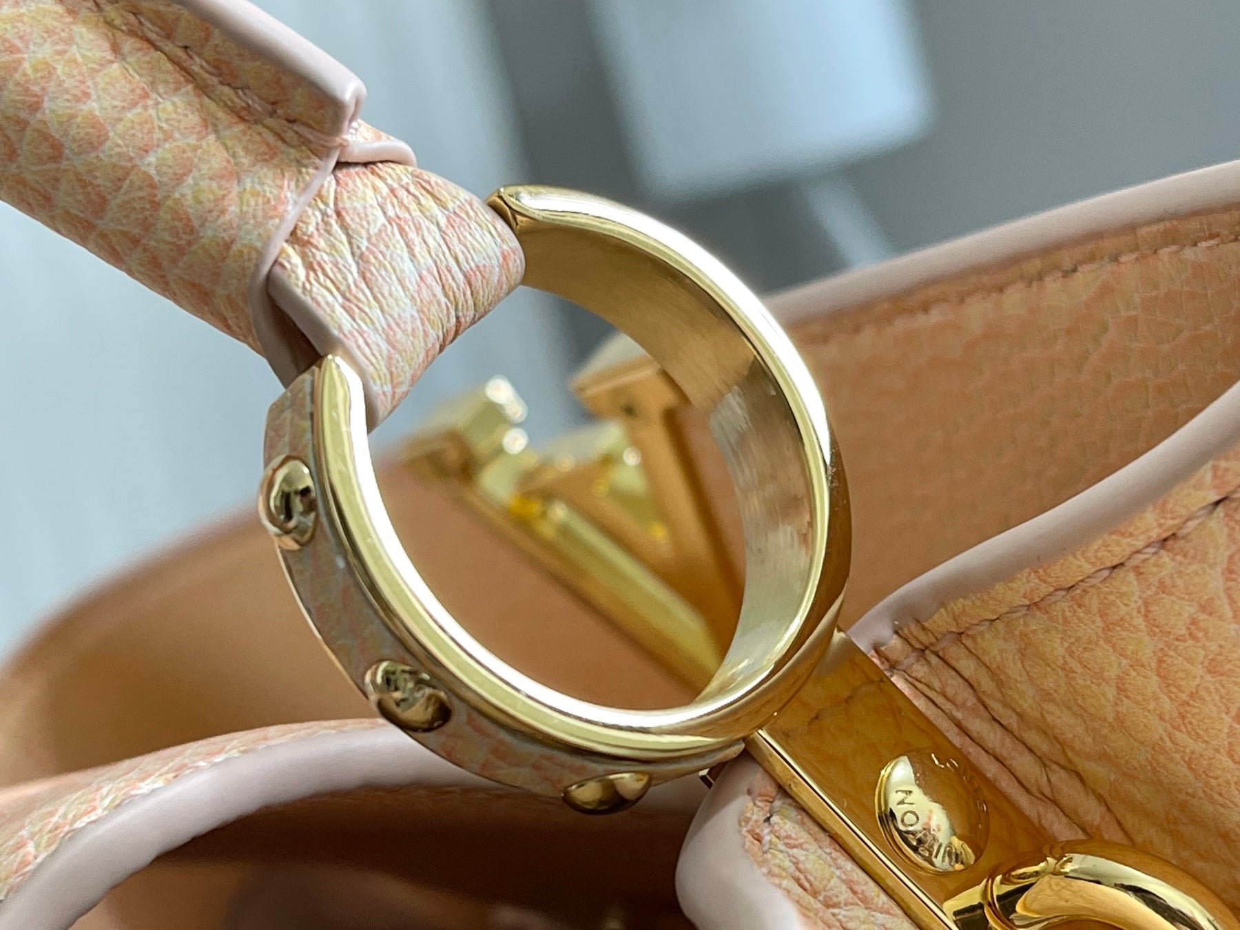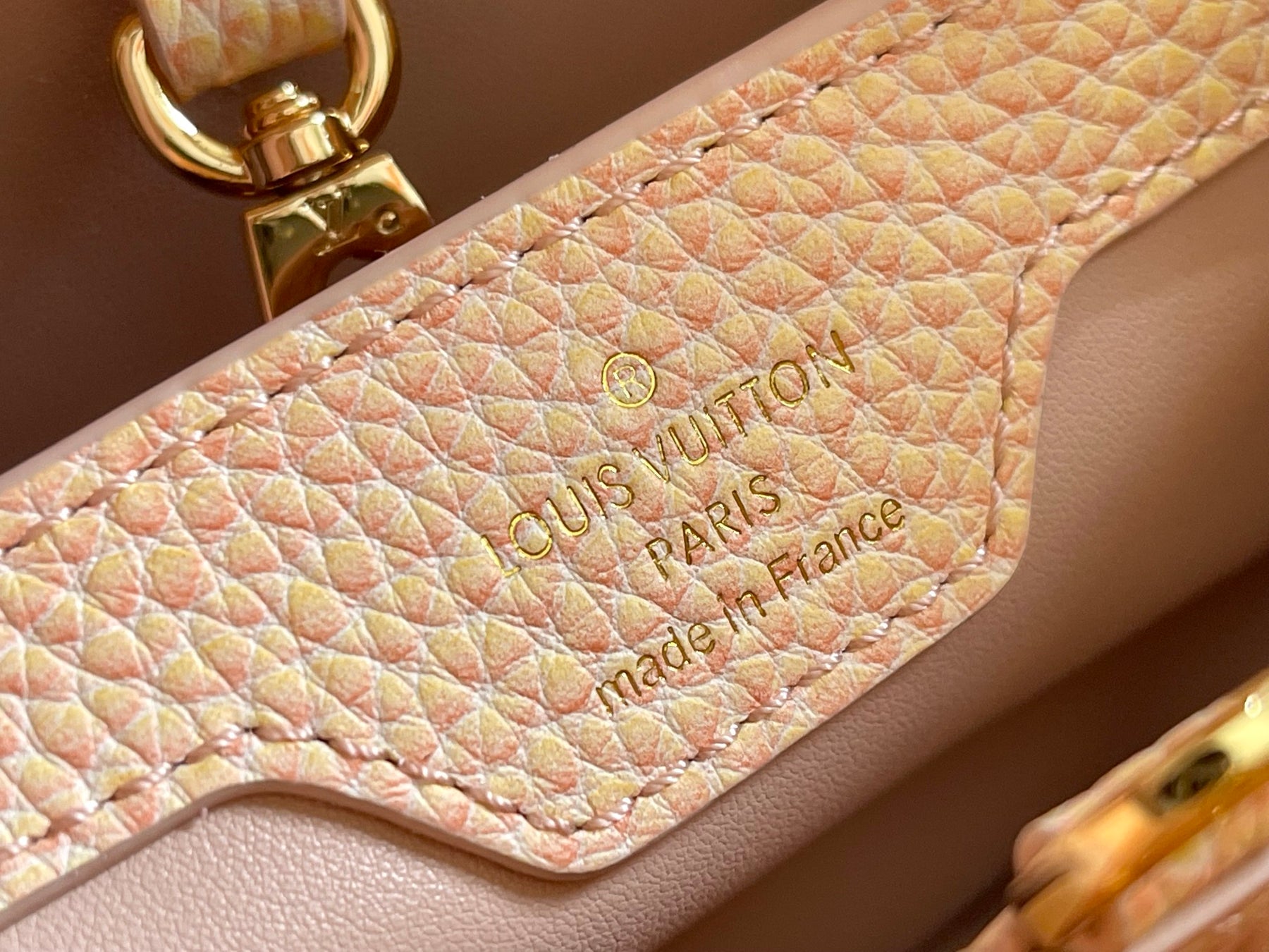 Discover the exquisite Capucines BB handbag, featuring a stunning combination of pink and yellow Taurillon leather, adorned with a shell-like white mother-of-pearl LV logo. This elegant accessory is complemented by a finely woven leather chain, exuding a unique sophistication. With gentle lines and classic design elements, this handbag radiates timeless charm. Dimensions: 27 x 18 x 9 cm. Perfect for elevating any outfit or occasion.