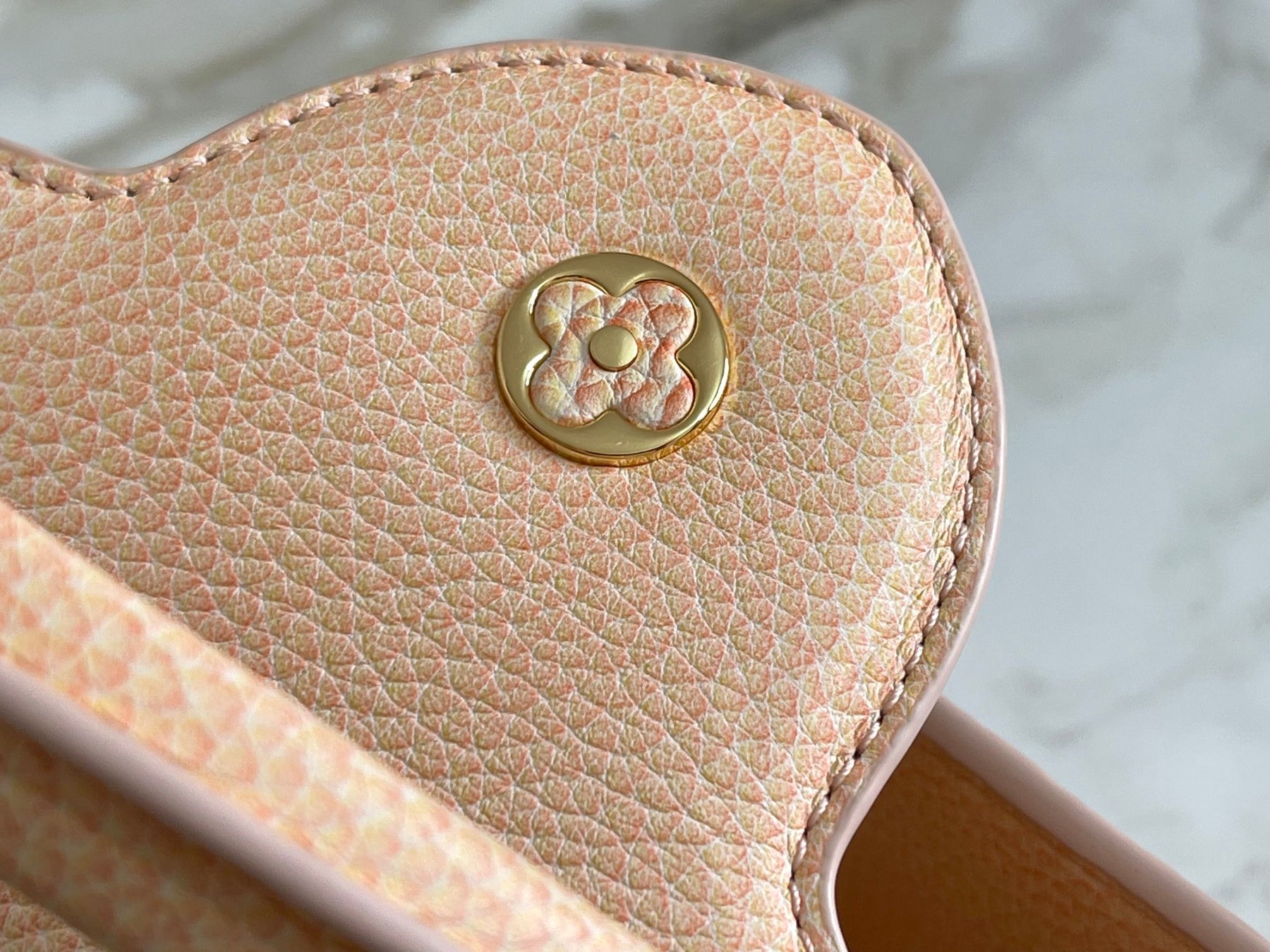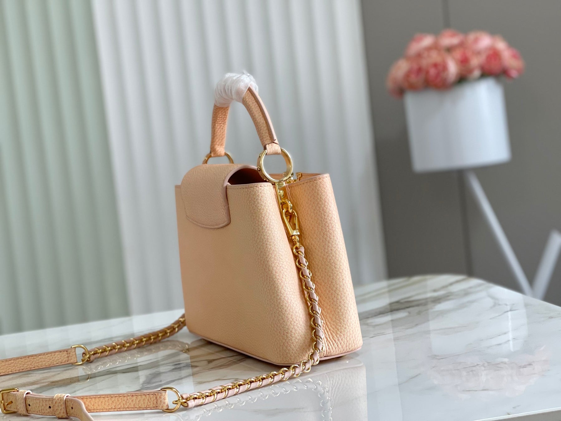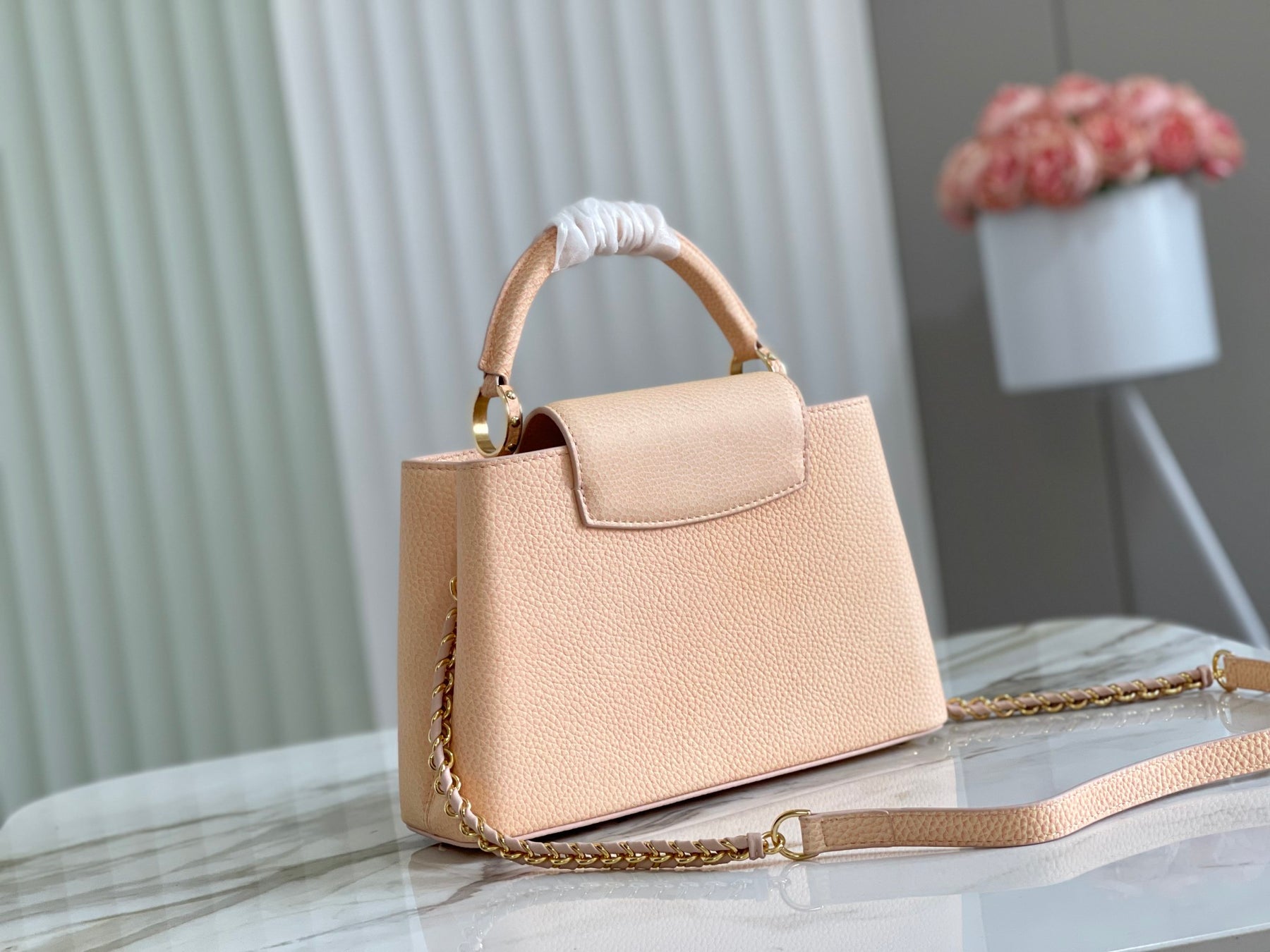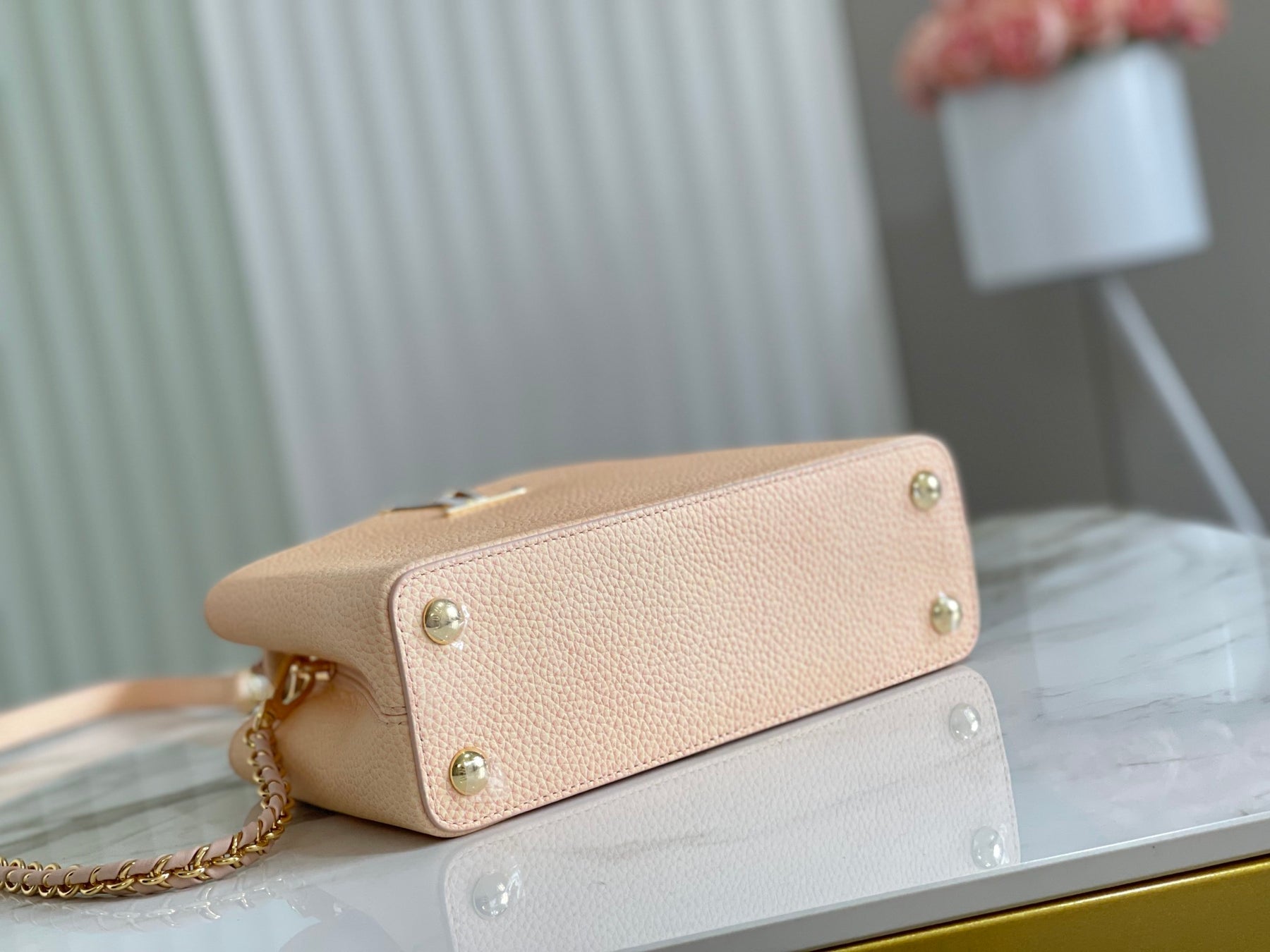 Discover the exquisite Capucines BB handbag, featuring a stunning combination of pink and yellow Taurillon leather, adorned with a shell-like white mother-of-pearl LV logo. This elegant accessory is complemented by a finely woven leather chain, exuding a unique sophistication. With gentle lines and classic design elements, this handbag radiates timeless charm. Dimensions: 27 x 18 x 9 cm. Perfect for elevating any outfit or occasion.