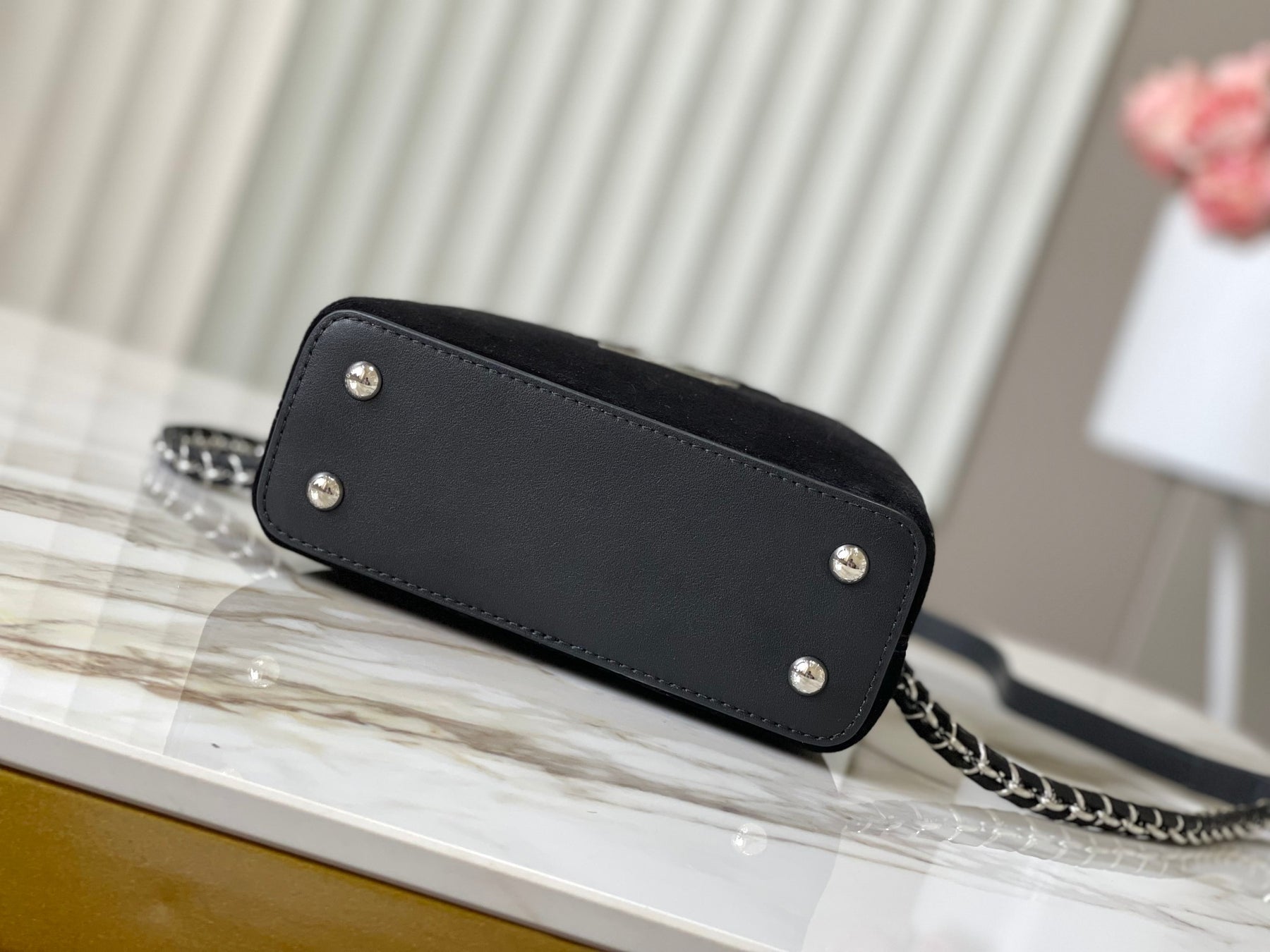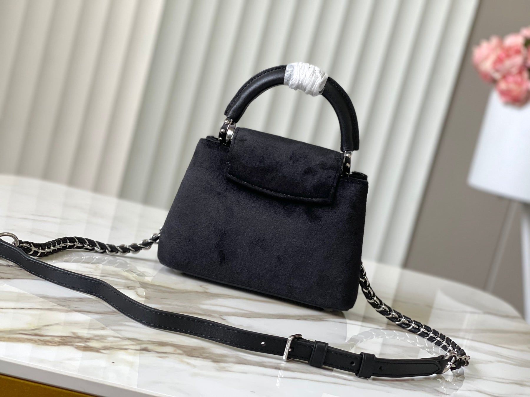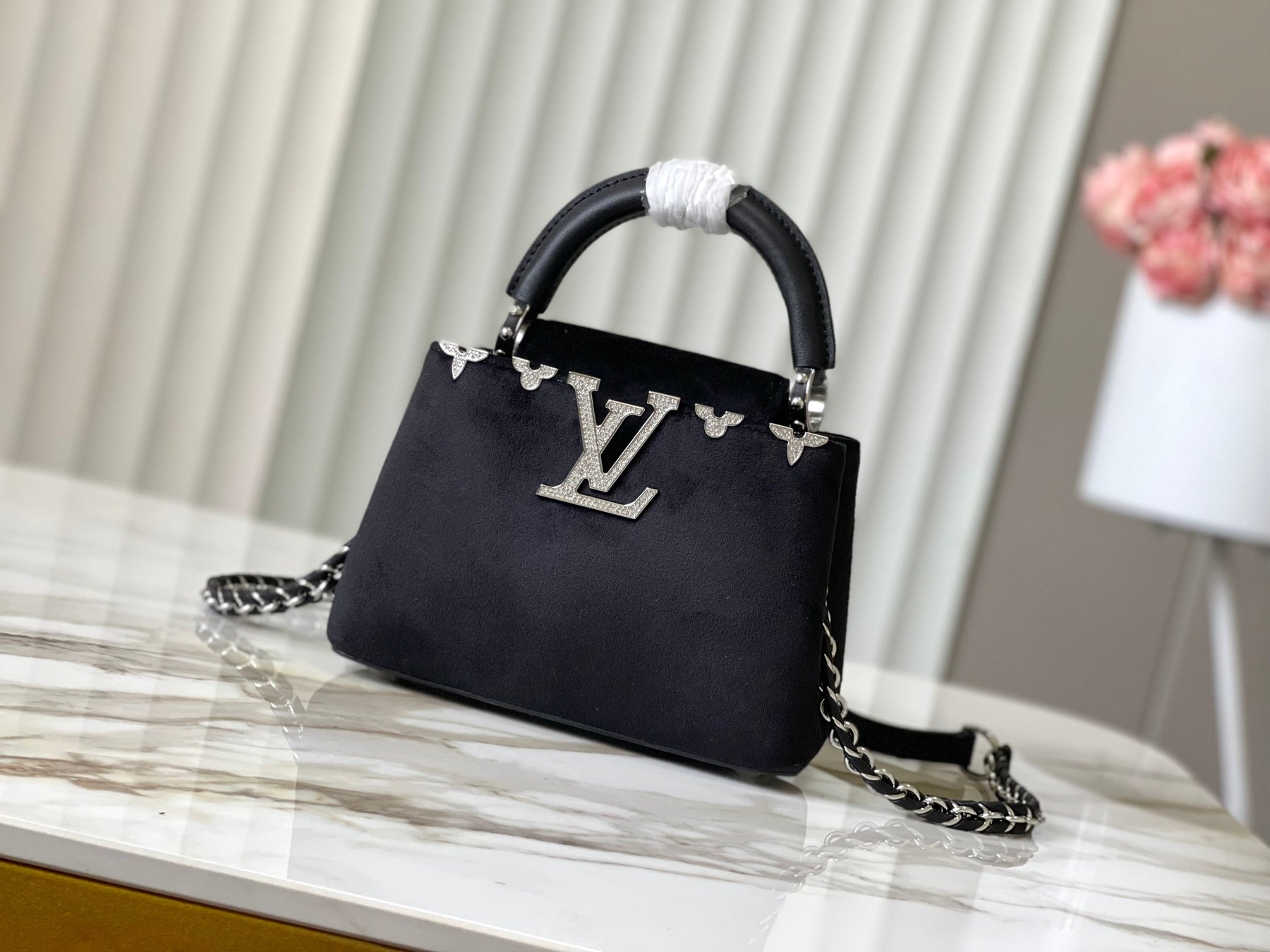 Elevate your evening look with the Capucines Flower Crown Handbag, crafted from premium original leather and luxurious deep velvet. Adorned with exquisite Monogram flowers, each embellished with sparkling crystals, this handbag captures the enchanting essence of a starry night. Its versatile woven chain shoulder strap allows for a seamless transition between shoulder and crossbody styles. Adorn yourself with a statement piece that adds a striking pop of color to any outfit. Dimensions: 21 cm x 14 cm x 8 cm.
