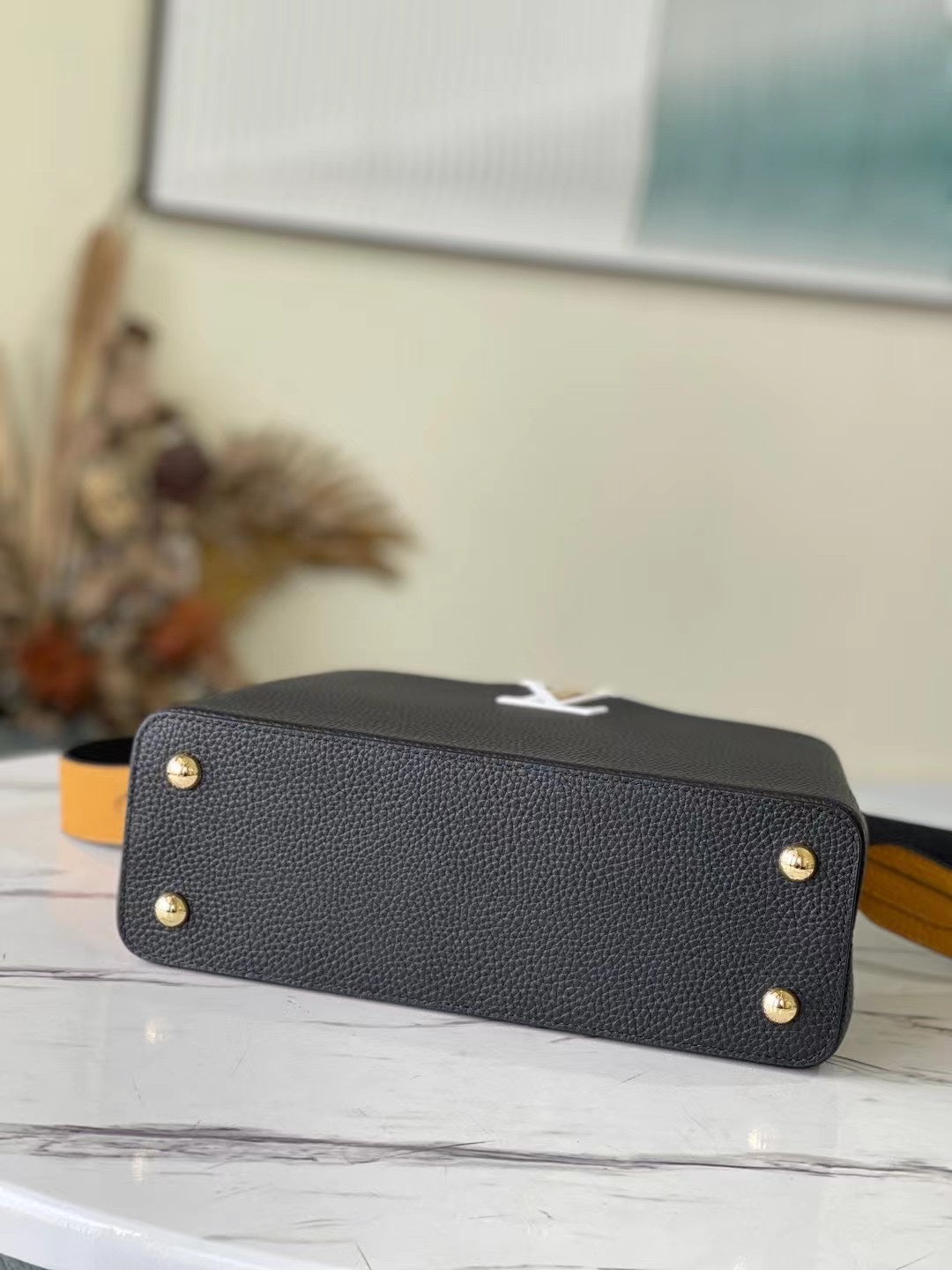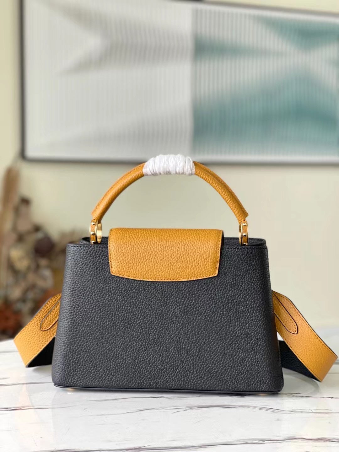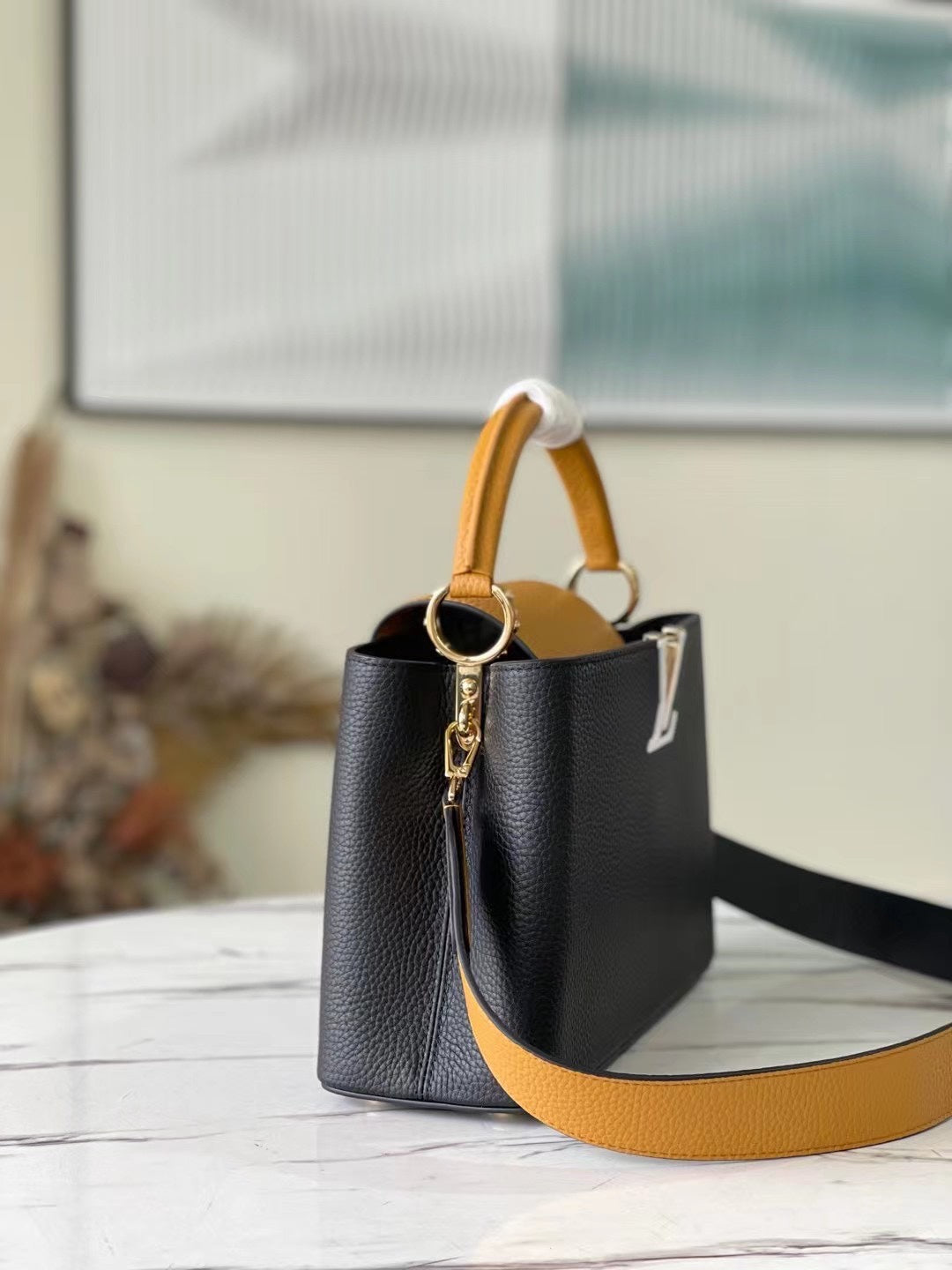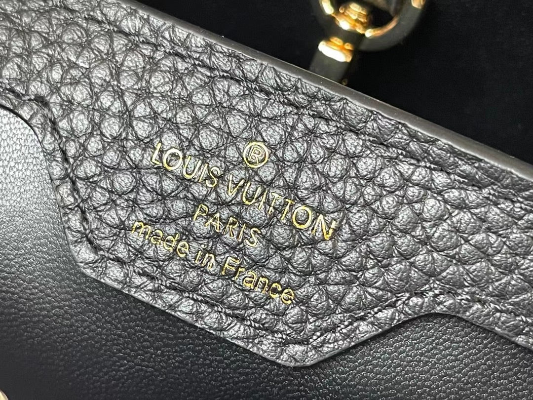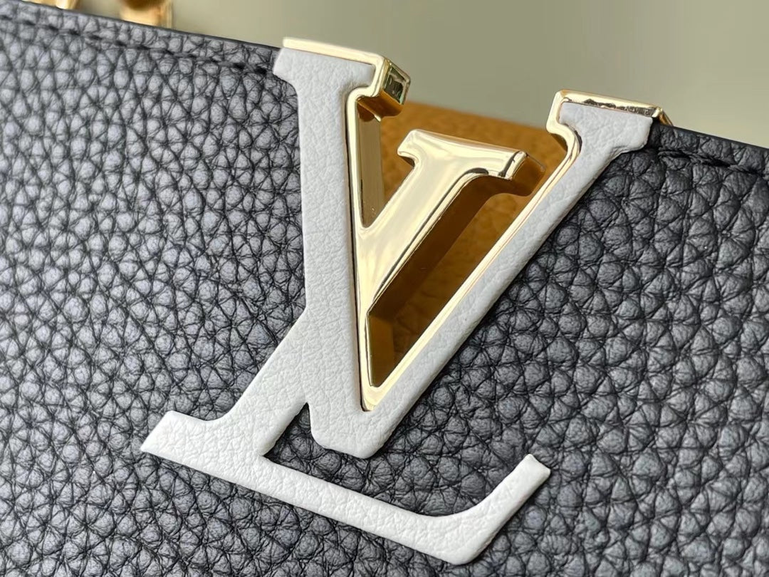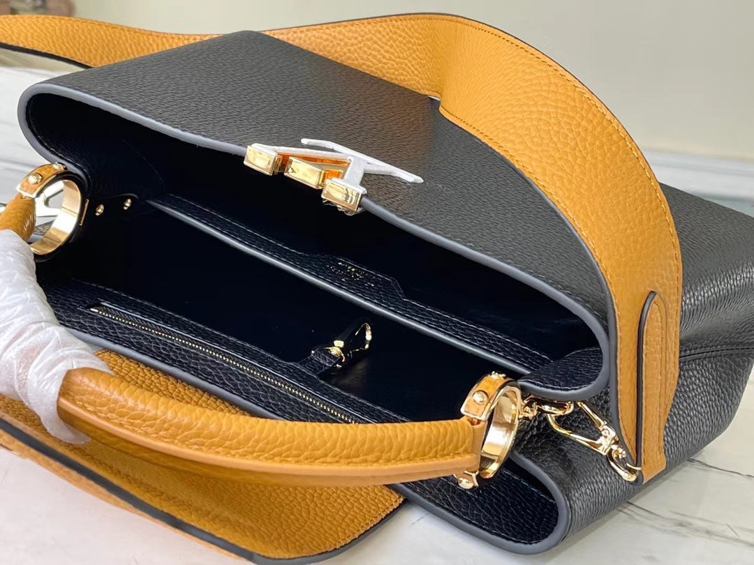 Elevate your accessory collection with the Capucines Medium Handbag, expertly crafted from premium full-grain cow leather. This stunning piece showcases a sophisticated blend of dark and light tones, enhancing its modern appeal. Thoughtfully designed with signature accents in the lettering and side loops, it seamlessly combines function and style. The handbag features a versatile top handle and a detachable shoulder strap, offering multiple carrying options to suit your lifestyle. Perfectly sized at 31.5 x 20 x 11 cm, this timeless accessory is an exquisite choice for any occasion.