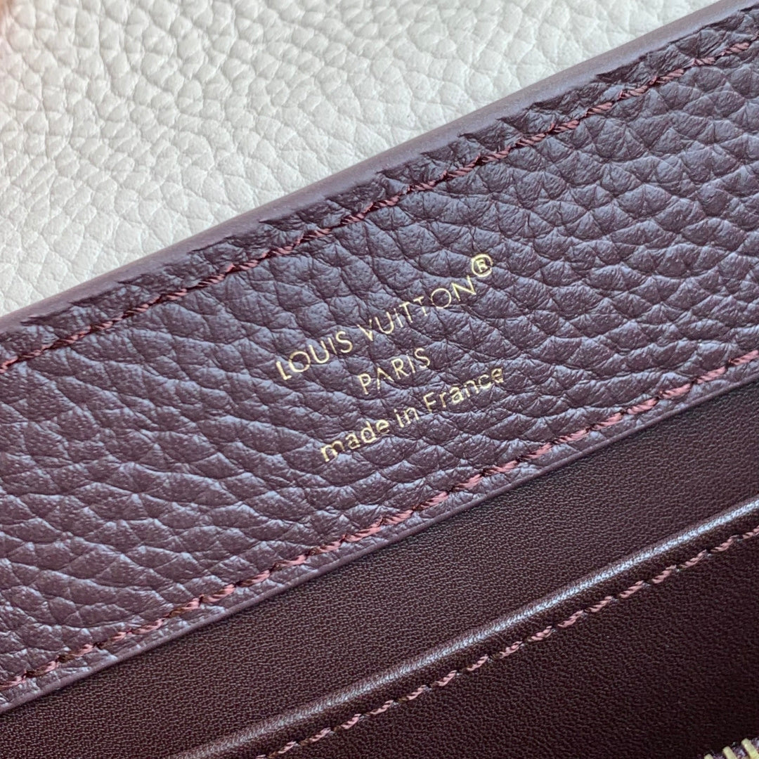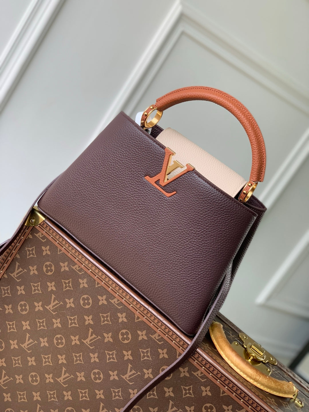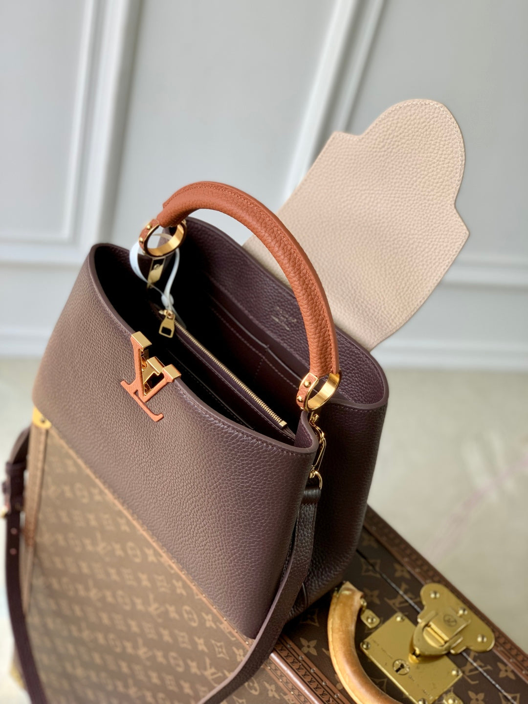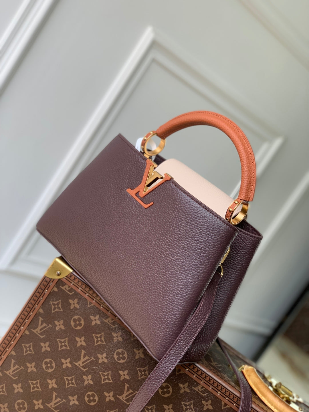 Elevate your style with the Capucines Medium Crossbody Bag, available in three exquisite seasonal colors. Crafted from premium Taurillon leather, this bag showcases a timeless design enhanced by elegant gold-tone hardware and iconic LV monograms. The thoughtfully organized interior features a zippered pocket to keep your valuables secure. With a removable and adjustable shoulder strap, the Capucines Medium offers both versatility and sophistication, making it the perfect accessory for any occasion. Dimensions: 20 × 11 × 31 cm (Height × Width × Length).
