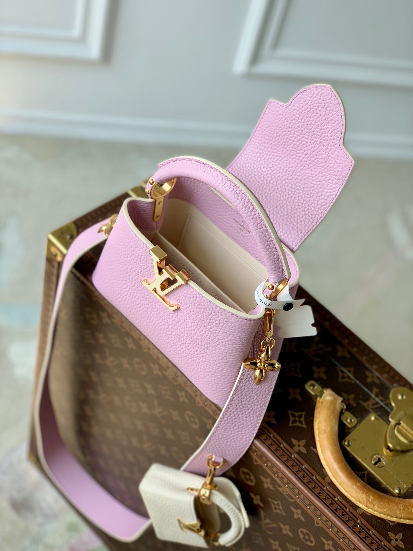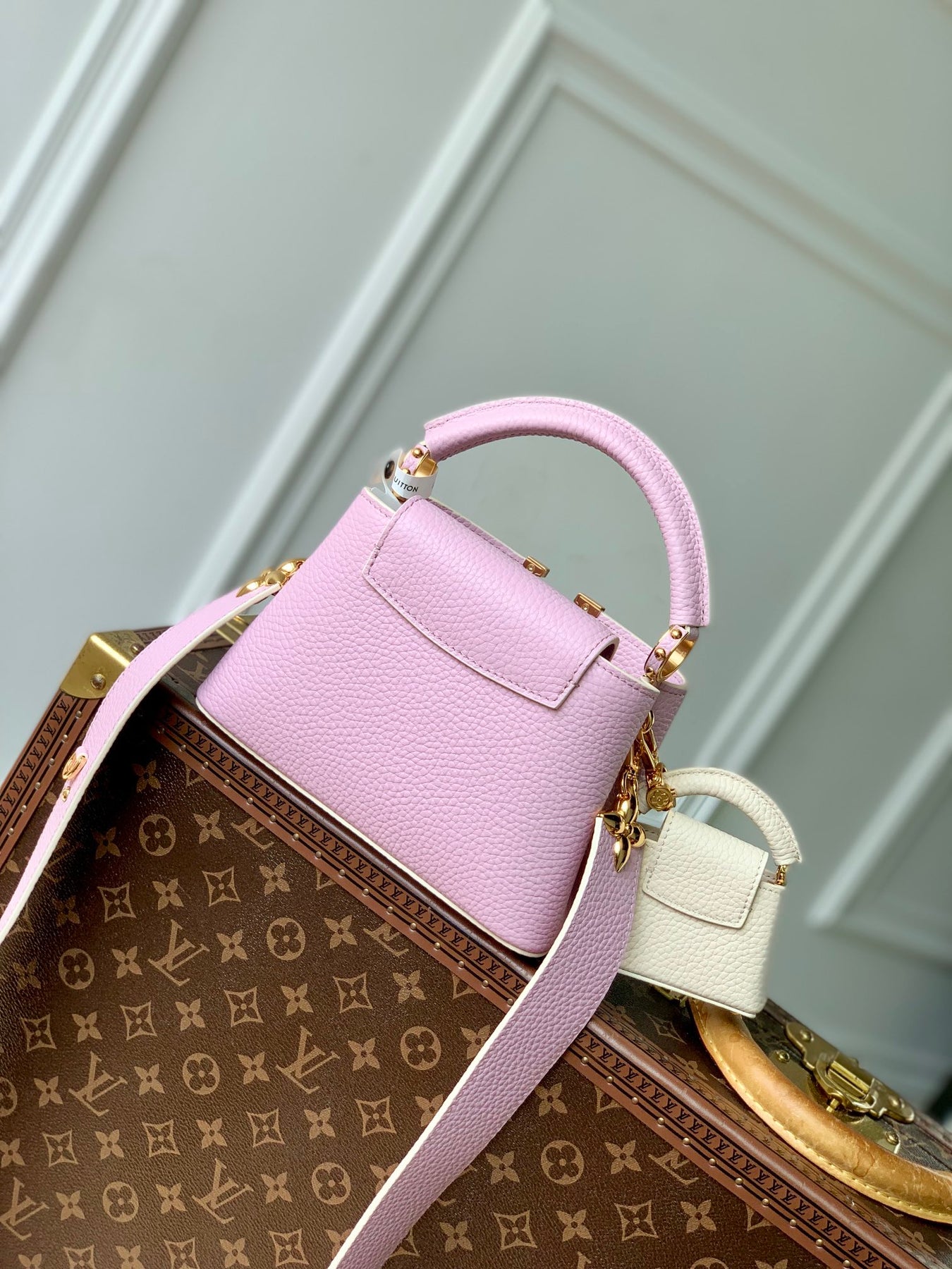 Introducing the Capucines Mini Bag, a stunning blend of style and sophistication. Meticulously crafted from high-quality Taurillon leather, this pink mini accessory is adorned with jewel-like glazed metal accents, making it a true statement piece. Featuring a delightful pocket-sized Capucines Cutie, elegantly attached to the shoulder strap with a unique Monogram floral hook, this bag effortlessly enhances any ensemble.