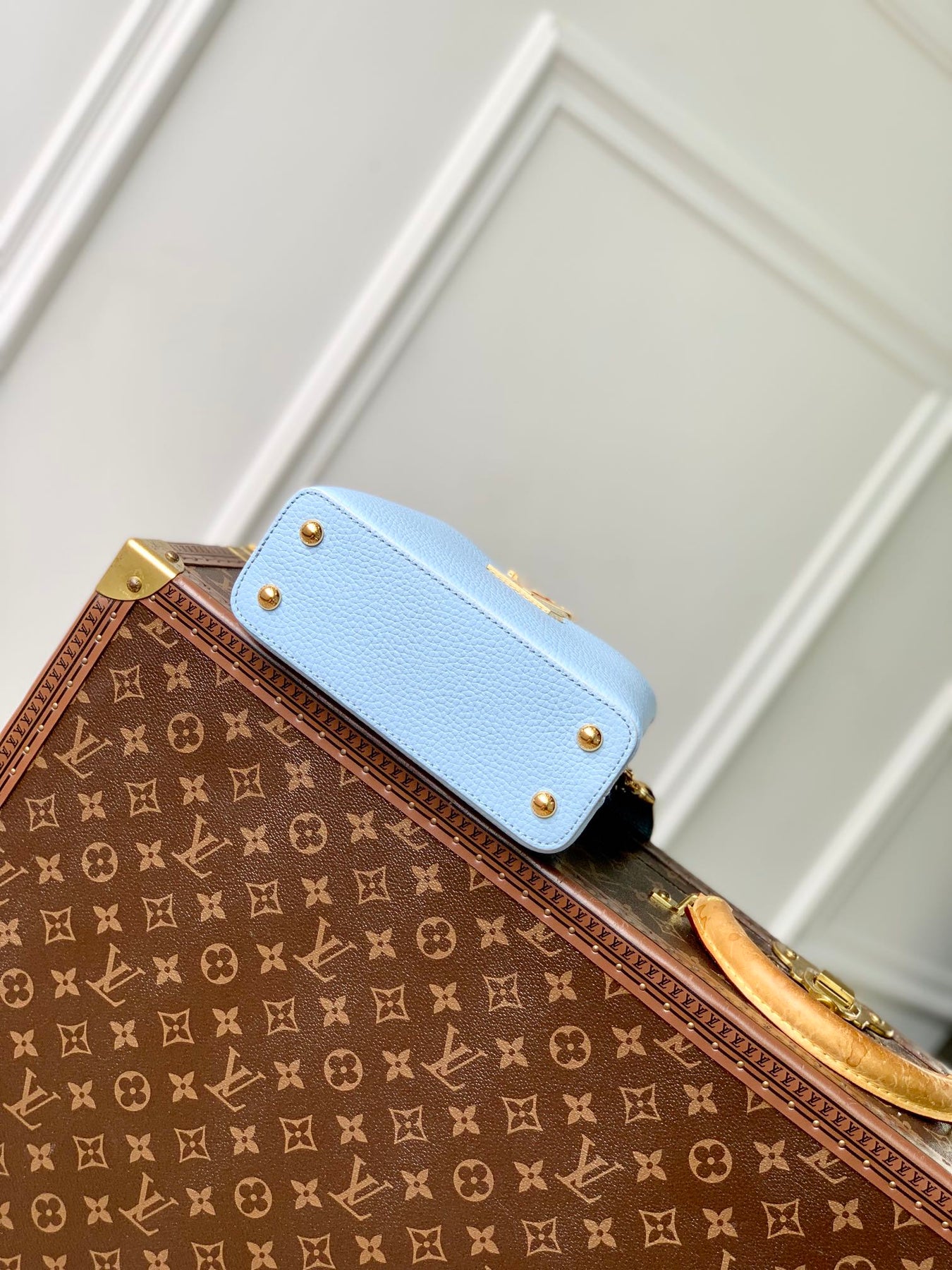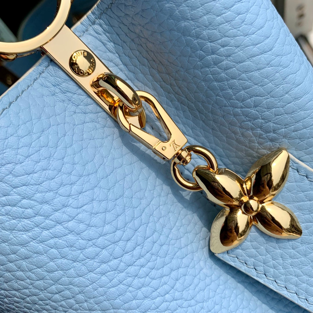 Introducing the Capucines Mini Bag, exquisitely crafted from premium Taurillon leather and adorned with a jewel-like glazed metal finish. This pocket-sized accessory features a charming Capucines Cutie, elegantly secured to the shoulder strap with a distinctive Monogram floral hook. With its playful design, this mini bag effortlessly enhances any outfit. Dimensions: 21 x 14 x 8 cm (length x height x width). Elevate your style with this standout piece.