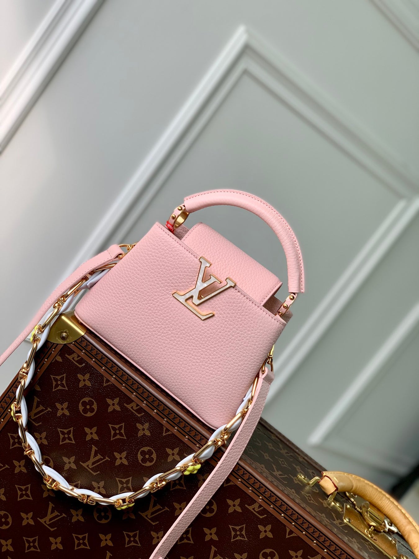 Introducing the Capucines Mini Handbag M48865, a stunning embodiment of femininity and elegance. Crafted from soft cow leather, this handbag features a delicate chain adorned with metal links, seamlessly blending style with sophistication. Highlights include beautifully scattered Monogram Dhlo flowers crafted from enamel and veneer, along with an eye-catching enamel brand logo that enhances its luxurious feel.