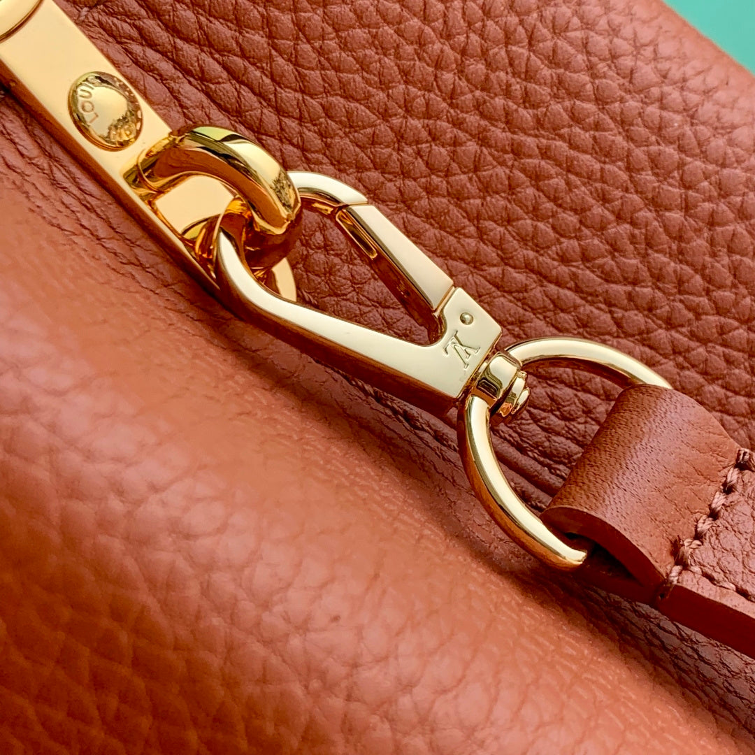 Introducing the Capucines Mini, a luxurious handbag featuring an exquisite tri-color design that adds a seasonal touch to your style. Crafted from premium Taurillon leather, this sophisticated piece offers versatility with a flap that can be worn inside out or outside, showcasing a stunning gold-toned LV signature. The structured handle allows for elegant crook-of-the-elbow carrying, while the removable shoulder strap provides the option for cross-body wear. With dimensions of 13.6 × 8 × 21 cm (Height × Width × Length), this mini bag combines functionality with a chic aesthetic, making it the perfect accessory for any occasion.