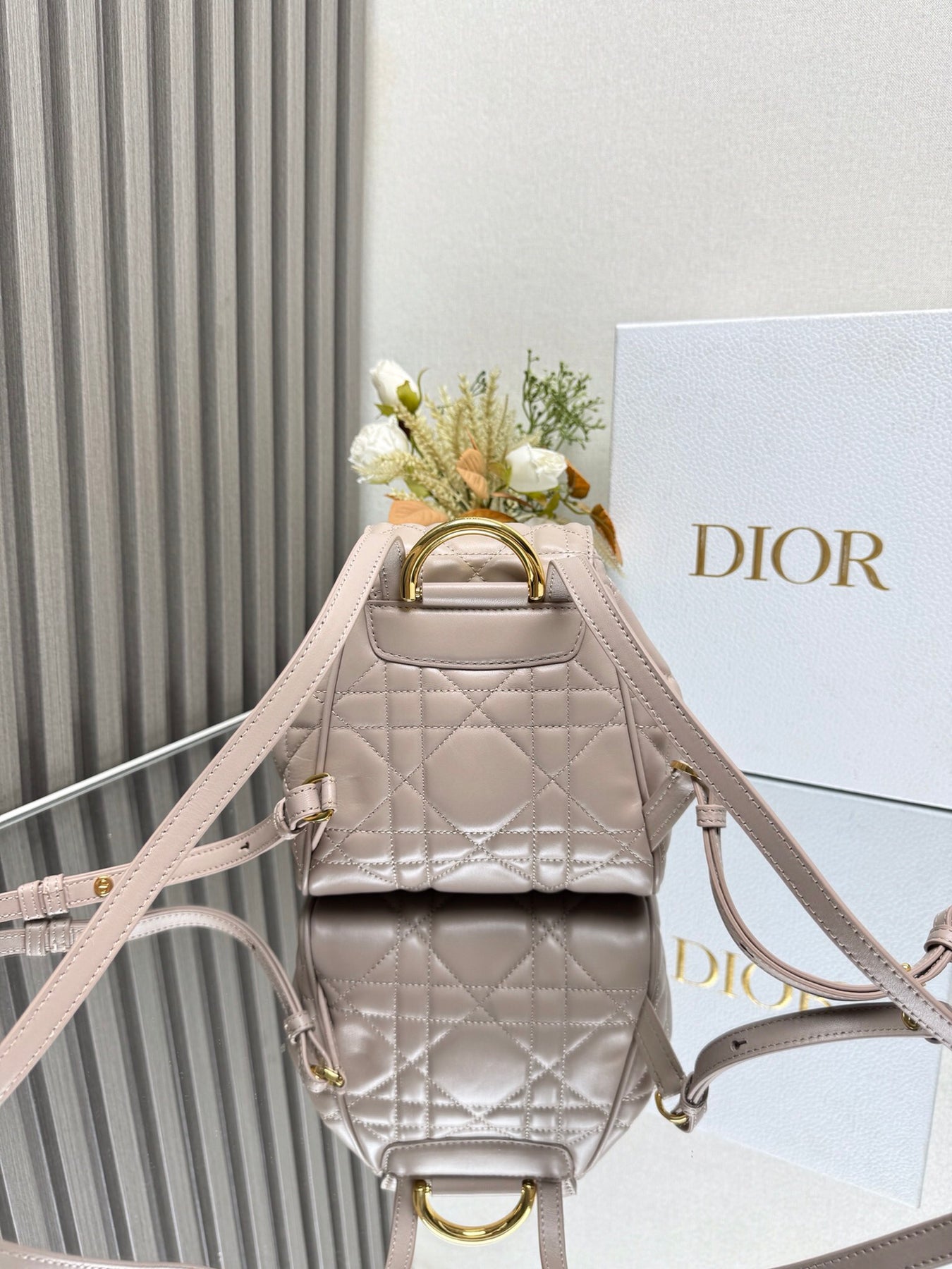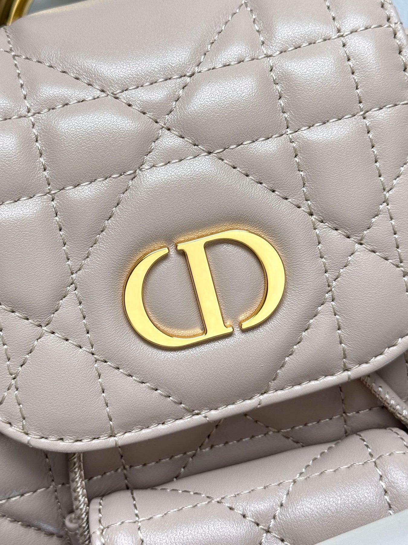 Introducing the Caro Backpack, a perfect blend of fashion and functionality. Crafted from luxurious sheepskin featuring a signature cannage pattern, this modern accessory embodies timeless elegance. The top features a distinctive flap and drawstring closure adorned with a CD logo for a touch of sophistication.