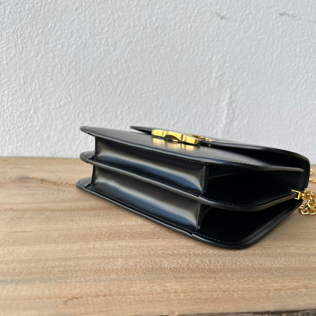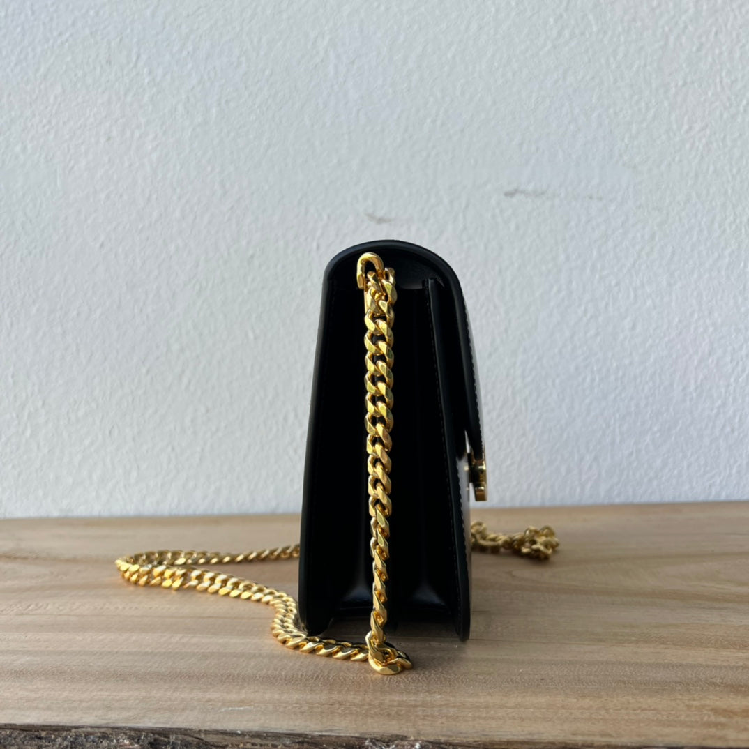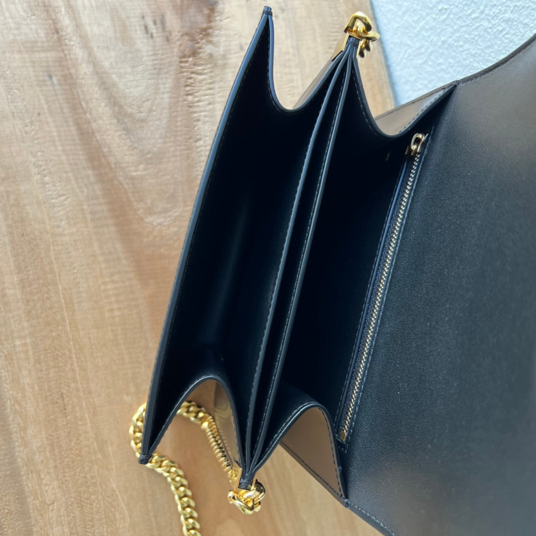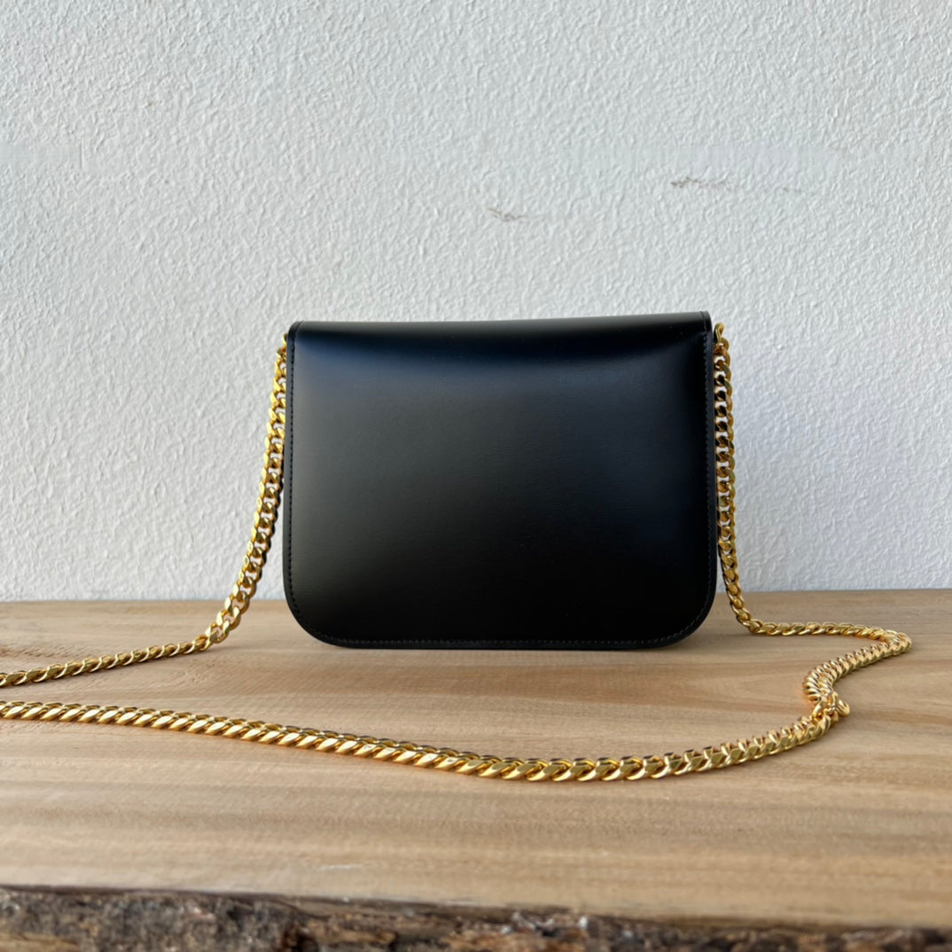 Introducing the Celine College TRIOMPHE Chain Bag in classic black with elegant gold accents. This sophisticated piece features a distinctive organ-style design, crafted from glossy cowhide leather with a soft sheepskin lining.