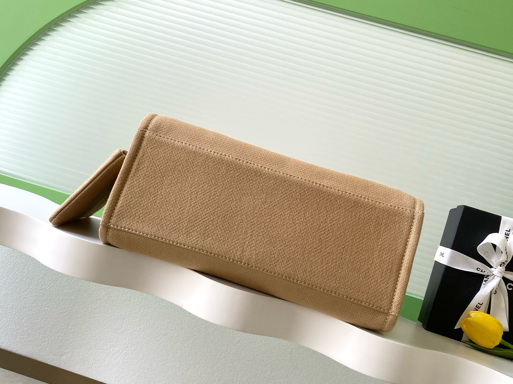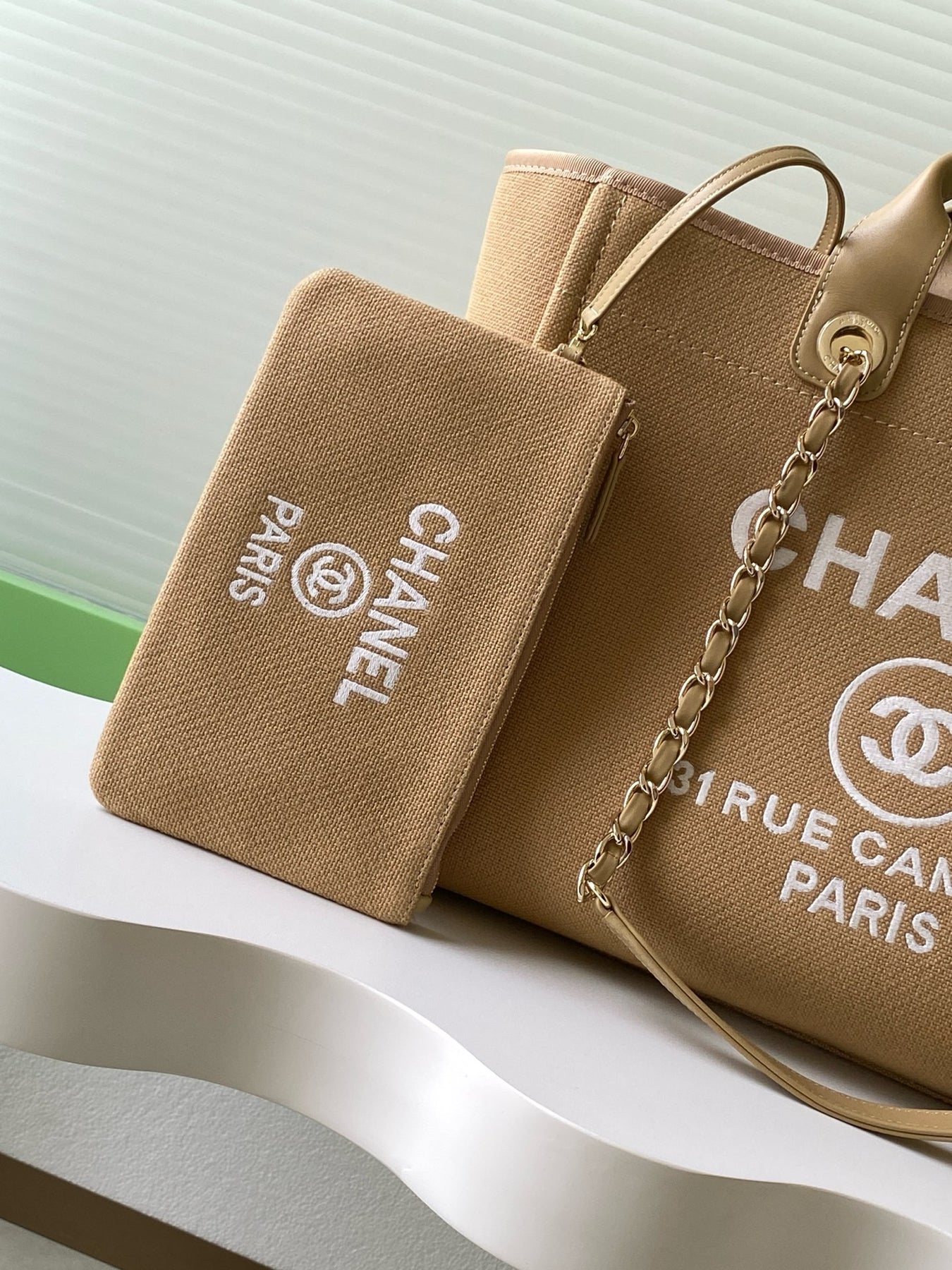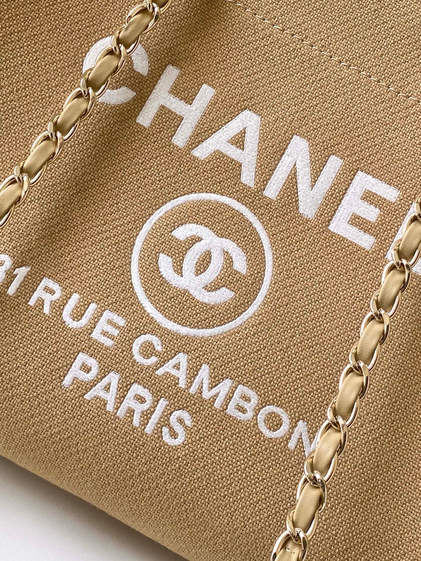 Introducing the Chanel Beach Bag, a stylish and practical accessory that seamlessly blends fashion with functionality. Crafted from durable cotton and featuring exquisite calfskin accents, this spacious tote is designed for the modern urbanite. Say goodbye to the days of small waste bags; this large bag is perfect for daily use, whether you're heading to work, hitting the gym, grocery shopping, or caring for children.